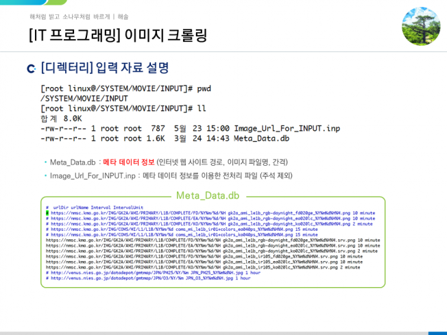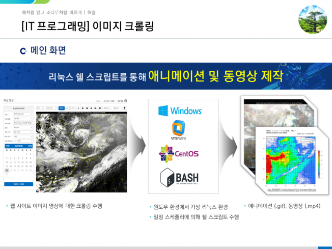 [소개]- 데이터산업진흥원 데이터 가공 공급기업 선정- 정보통신산업 진흥원 데이터 가공 공급기업 선정- 다년간 축적된 경험 노하우를 바탕으로 개개인에게 맞춤형 솔루션을 수행할 수 있습니다.1. 아스키 형식의 텍스트 (text) 파일부터 과학자료 형식 (HDF, H5, NetCDF, Grib, Grb) 및 Data (DB) 자료까지 다양한 형태의 자료를 이용하여데이터의 수집, 전처리, 분석, 시각화해 드립니다.2. 웹 사이트에 대한 정보를 이용한 웹 크롤링 및 그에 따른 엑셀 및 DB 구축도 가능합니다.3. 기초 통계 (빈도분포, Prired t-test, Wilcoxn 등)에서 지도/비지도 학습을 통한 회귀모형 구축에 이르기 까지 효율적인 통계 정보를 제공합니다.4. 대한민국의 후속위성인 천리안위성 2A호 웹 서비스 서브시스템 및 환경위성 2B호 통합 자료처리 서브시스템에 대한 웹 개발 수행인터넷 웹 사이트에서 유용한 이미지를 프로그래밍 언어 (쉘 스크립트)를 통해 실시간 크롤링, 동영상 또는 애니메이션을 제작해 드립니다.더 나아가 정규 시간 (매 분, 매 시, 매 월)에 따른 스케쥴링 시스템을 구축해드립니다.[업무 경험]기상위성 이미지 영상 (한반도, 동아시아, 전구 을 이용한 동영상 제작지상/육상 예상 일기도, 레이더 영상, 기상예보 이미지 영상을 이용한 애니메이션 제작[활용 자료]인터넷 웹 사이트에서 실시간 이미지 영상[사용 OS]Linux (CentOS v7.3)Windows 10[사용 언어]Shell Script (csh, bash)[결과물]사용자 매뉴얼 제공 (소스 코드 제공, 리눅스 환경 구축, 라이브러리 설치, 실행 결과) [제공 절차] - 문의를 통한 견적 확인 - 결재 - 1차 작업물 발송 - 수정 및 재진행 - 최종 작업물 발송 [준비 사항] - 요구사항 - 데이터 설명 - 프로그래밍 언어 (R, Python, Shell Script 등) - OS 환경 (Windows 또는 Linux) - 보고서 여부