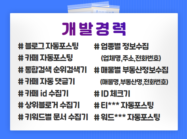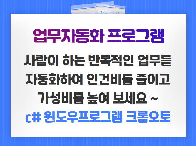 원하시는 프로그램을 빠르고 정확하게 제작해드립니다.기본가격은 2일 이내 가능한 매크로 프로그램에 해당됩니다.프로그램 개발 비용은 제작기간이나 난이도에 따라 상이하므로구매하시긴 전에 견적 문의주세요~주로 C# 윈도우 프로그램을 개발하며, 매크로(업무자동화) 프로그램 전문으로 제작합니다.윈도우프로그램으로, 최신업데이트 완료된 Windows10 (64bit) 환경으로 제작합니다.[ 견적예시 ]- 특정 사이트 데이터 크롤링 제작기간: 2일, 50만원 (업체명, 주소, 연락처, 팩스, 이메일 등 ) 수집- 소규모 상담관리 프로그램 제작기간: 5일, 110만원 (상담이력, 문자발송, 예약기능 포함)- N블로그 자동글쓰기 프로그램 제작기간: 7일, 130만원 (이미지편집, 동영상제작, 자동 글쓰기 포함)견적 요청시에는 반드시 작성해주세요!- 원하시는 프로그램 기능 (상세하게)- 개발 완료 기한 (예약건들이 있어서 일정을 조정해 보아야 합니다)- 총 예산 (예산 이내에서 가능한지 책정해 보아야 합니다) [ 주요 작업 프로그램 ]사람이 하는 반복적인 업무를 프로그램으로 제작해 드립니다.최대한 짧은시간, 작은 노동으로 가성비를 높여 드립니다.- 웹사이트 데이터 반복 수집 (크롤링) - 사람이 일일히 손으로 하던 반복작업 (이미지 제작(수정), 아이피변경 등) (매크로)- 마케팅을 위한 반복적인 작업 (글쓰기, 순위체크, 자료수집 등) 불법적인 프로그램은 제작하지 않습니다. 1. 상담 후 견적2. 결제3. 작업시작4. 1차 작업물 전달5. 보완 _ 요구사항 미반영, 오류, 버그 범위 이내6. 완성 작업물 전달7. 구매확정* 프로그램소스는 제공되지 않습니다. 견적 요청시에는 반드시 작성해주세요!- 원하시는 프로그램 기능 (상세하게) - txt파일이나 pdf, 한글 파일- 개발 완료 기한 (예약건들이 있어서 일정을 조정해 보아야 합니다)- 총 예산 (예산 이내에서 가능한지 책정해 보아야 합니다)- 프로그램 제작 전 테스트에 필요한 샘플 일체 (url 이나 로그인 할 계정 등)
