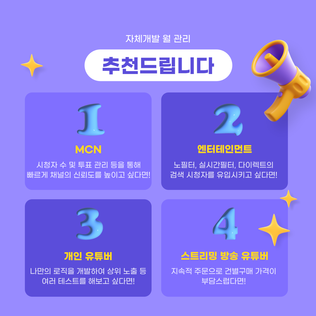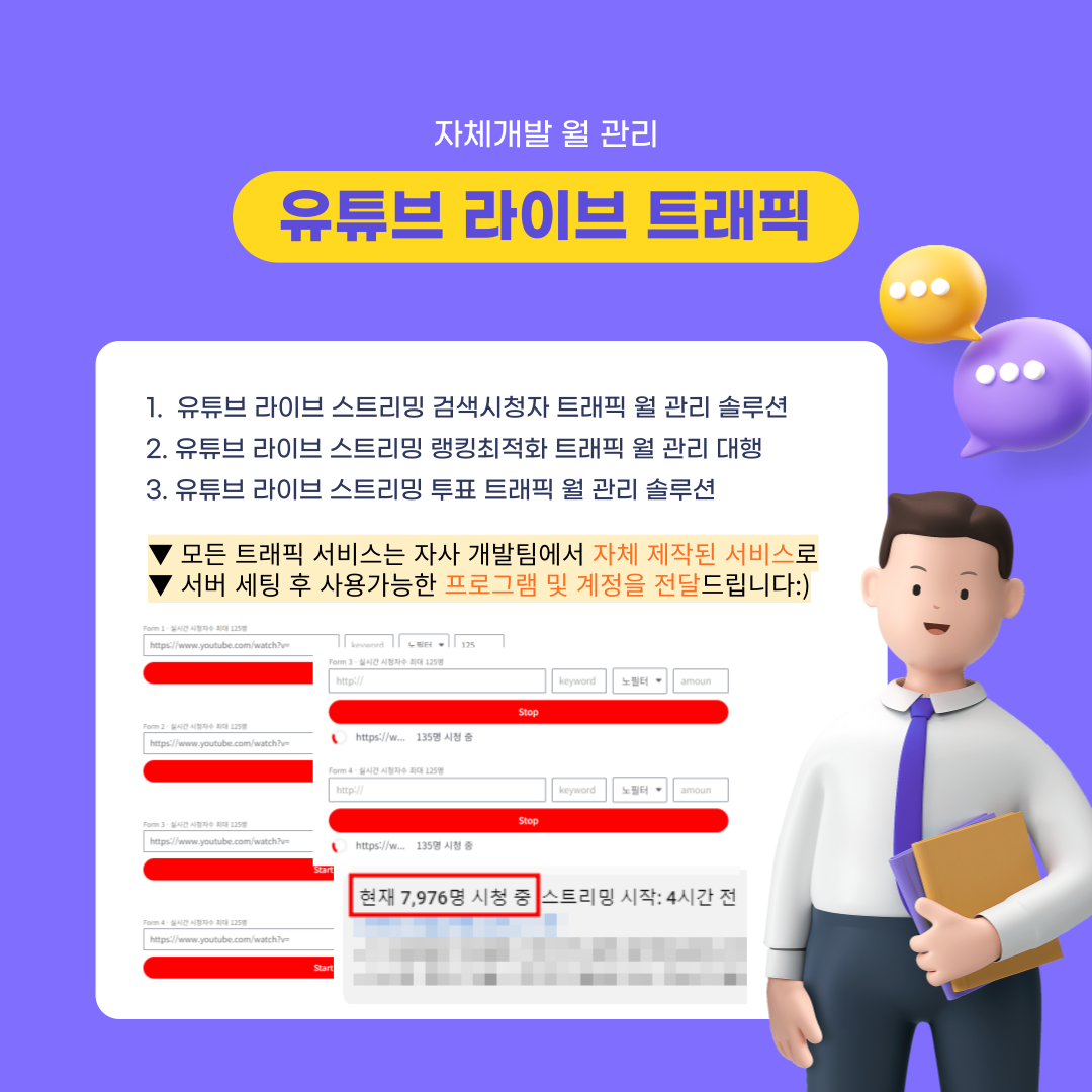 ※ 해당 서비스는 안전한 거래를 위하여 크몽 정책과 하단 기재된 취소 및 환불 규정을 따르고 있습니다. 안심하고 문의 주세요:)※ 구매 전, 전문가에게 문의 남겨 주시면 자세하게 안내 드리겠습니다:)저렴한 해외패널을 사용하는 업체로 인해 채널이 망가지지는 않으셨나요?한국에 맞는 최적화 라이브방송 노출 방법을 찾고계신가요?시청자를 단건으로 구매하면서 많은 비용을 지출하고있진 않으신가요?라이브방송 노출이 너무 안되어서 걱정이신가요?시청자가 없어서 채널과 방송의 신뢰를 전혀 갖지 못하고있나요?만약 이 모든걸 해결하는 '개발사 자체개발 프로그램'으로 단건 대비 저렴한 비용과 무제한 검색 시청자 솔루션이 있다면!?# 이런 분께 추천드립니다.- 시청자 수 및 투표 관리 등을 통해 빠르게 채널의 신뢰도를 높이고 싶다면!- 노필터, 실시간필터, 다이렉트의 검색 최적화 시청자를 유입시키고 싶다면!- 개별 로직을 개발하여 상위 노출 등 여러 테스트를 해보고 싶다면!- 지속적 주문으로 건별 구매 가격이 부담스럽다면!- PC, 모바일 구분없이 언제 어디서든 솔루션을 사용하고 싶다면!(추천) MCN, 엔터테인먼트, 개인 유튜버, 스트리밍 방송 유튜버 등# 유튜브 라이브 스트리밍 최적화 무제한 트래픽 관리 기능을 세팅 및 월 관리해 드립니다!비싼 시청자 늘리기 서비스를 건별 결제 후 주문을 넣어서 시청자가 늘어나는 형태가 아닌 시청자를 실시간으로 횟수 제한없이 자유롭게 넣을수도 또는 뺄수도 있는 솔루션을 세팅 후 서버 임대 및 월 업데이트 자동 관리해 드립니다.가격! 비용을 꼭 비교해보세요. 건별 타업체 대비 평균 29배 저렴한 가격으로 진행가능합니다.기능! 24시간, 상황에 따라 A채널에 500명을 유입시켜 30분시청하다가 B채널에 200명, C채널에 300명을 나눠 유입, 시청유지를 무제한으로 사용가능합니다. ex) 다중채널상품마케팅이 필요한 기관, 회사, 개인, MCN, 마케팅대행사 등 다양한 업체에서 세팅 및 사용 중 입니다.자사 개발팀에서 자체 개발한 솔루션을 활용하여 크몽 내 마케팅 서비스 중이며 따라서 어떤 업체보다 마케팅 로직 및 개발작업에 최적화 되어 있으며 실시간 응대 및 관리가 가능한 시스템이 구축 되어 있습니다!일부 개발되어있는 핵심 기능을 기반으로 유튜브 라이브 스트리밍 솔루션을 세팅해 드립니다.1. 유튜브 라이브 스트리밍 검색시청자 트래픽 월 관리 솔루션※ C 상품은 현재 기능 업데이트로 인한 추가 개발 중으로 해당 A, B 상품으로 선택 부탁드립니다:)[가격]A상품 :다중채널서버 1대 : 최대 500명 / (2채널) 동시 분할유입 가능 !B상품 :다중채널서버 2대 : 최대 1000명 / (4채널) 동시 분할유입 가능 !C상품 : (추가 개발 중)단일채널서버 1대 : 최대 1000명 / (1채널) 가성비 유입 ! (텔레그램 컨트롤)공통 : 24시간무제한 / 사용횟수무제한 / 검색유입 / 최적화작업(NEW)[기능]* (포함)검색유입 - 검색 키워드 리스트에 노출될 경우 실제 검색을 통한 유입이 가능합니다.* (포함)최적화작업(NEW) - 검색유입된 인원이 유입유출 활동 및 내부활동으로 인해 활동지수를 상향시키는 등 라이브 방송 최적화 작업이 진행됩니다.* (포함)제어가능한 프로그램 - 폼 제공* (포함)랭킹 최적화 실계정, IP 제공* (포함)서버 개수 추가 증설 가능* (포함)실시간 유지보수 관리* (포함)독립 윈도우 서버 임대 제공2. 유튜브 라이브 스트리밍 랭킹최적화 트래픽 월 관리 대행단일채널(교체가능)로 최대 1000명 이하 최적화 인원으로 직접 대행해서 랭킹 최적화를 진행드립니다.※ 가격 및 진행방법 별도 문의3. 유튜브 라이브 스트리밍 투표 트래픽 월 관리 솔루션[가격]A상품 :다채널서버 1대 : 300명 / (2채널) 동시 분할작업 가능 !공통 : 24시간무제한 / 사용횟수무제한[기능]* (미포함)검색유입 - 검색 키워드 리스트에 노출될 경우 실제 검색을 통한 유입이 가능합니다.* (미포함)최적화작업(NEW) - 검색유입된 인원이 유입유출 활동 및 내부활동으로 인해 활동지수를 상향시키는 등 라이브 방송 최적화 작업이 진행됩니다.* (포함)제어가능한 프로그램 - 폼 제공* (포함)실계정제공* (포함)서버 개수 추가 증설 가능* (포함)실시간 유지보수 관리* (포함)독립 윈도우 서버 임대 제공[공통 관리 시스템]24시간 응대, IP, 계정, 서버 관리 및 업데이트를 진행하고 있습니다 !무거운 서버, 복잡한 개발, 솔루션 유지 및 업데이트는 저희가 다 하겠습니다 !대표님께서는 간편한 주문기능과 24시간 모바일/PC로 어디에서나 사용가능한 단 하나의 프로그램에서 모든걸 관리해보세요!※ 제공드리고 있는 유지관리 시스템은 최초 개발 후 월 비용으로 유지관리가 되는 구조입니다. (최초 개발비 + 월 유지관리비)+ 무상 AS + 로직 업데이트* 약정 및 의무사용기간 없음* 부가세 별도, 세금계산서 가능※ 자세한 사항은 상담문의주세요:)# FAQQ : 테스트 가능한가요?A : 네, 가능합니다. 무료 테스트는 서버 여유 상황에 따라 일정 개수만 진행드리고있으며 실제 사용하시고자 하는 개수로는 1일권도 구매 가능하니 사용해보시고 결정하셔도 됩니다:)1일권 가격은 개수에 따라 상이하여 별도 문의 부탁드립니다!Q : 세팅 기간은 얼마나