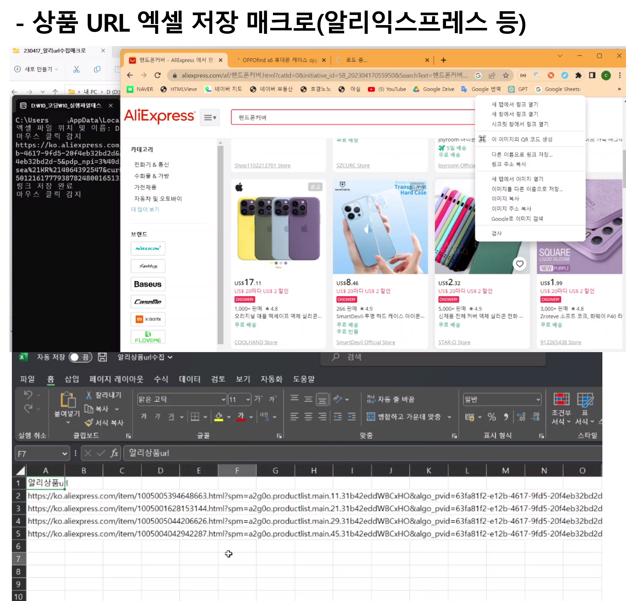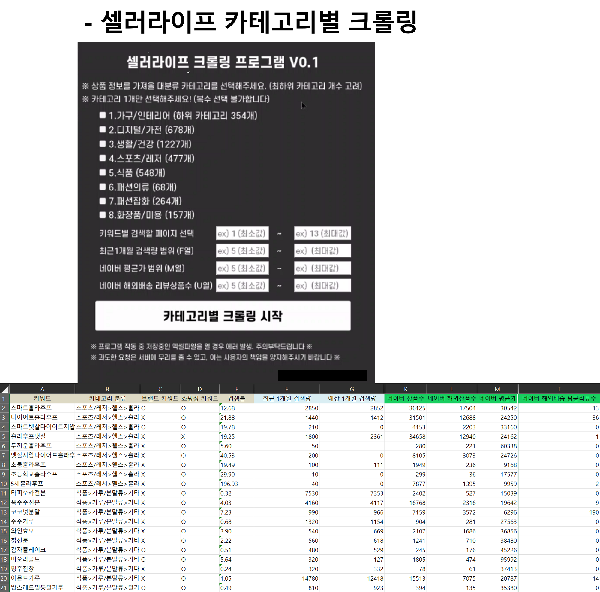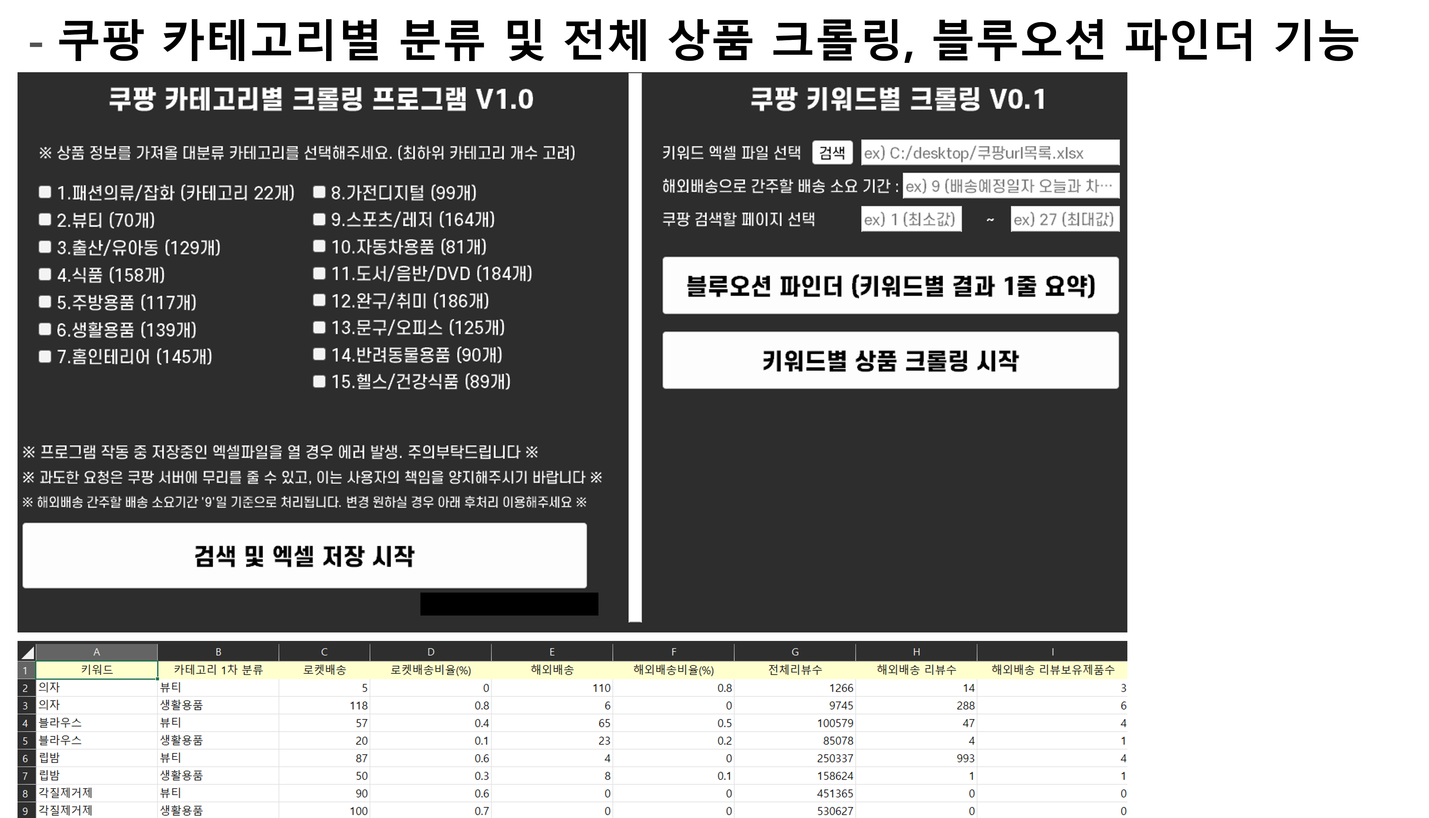 ***** 친절 응대 및 의뢰인 분 의도 센스있게 반영 *****안녕하세요 크롤링 업무 3년차 진행중인 센스코더 입니다.생각하시는 아이디어 자동화 도와드리며, 업무 효율화에 도움드립니다.가장 합리적인 비용으로 개발해드리며, 추후 A/S 도 적극 지원해드립니다. # 답답하실 경우 전화 문의도 가능합니다 크몽안심번호로 연락주세요^^ # 코딩 몰라서 외주 맡기기가 겁나신다구요? 편하게 문의 해주세요. ※ 추천 하는 분들 - 각종 쇼핑몰의 상품 정보를 엑셀로 다운 받고 싶다! - 반복되는 업무를 자동화 하고 싶다! - 타 유료 프로그램을 저렴한 가격으로 비슷한 기능을 만들어보고 싶다!※ 제공 서비스- 파이썬 Selenium, BeautifulSoup, API 등 이용하여 데이터 수집- 결과물 : 기본적으로 엑셀 제공 , JSON, TXT, CSV 등 형식 저장 가능- 실행파일 (.exe) 파일 아이콘으로 제작도 가능합니다.- 입력하시기 편하도록 창, 버튼 제작하여 제공 가능합니다 (GUI)※ 견적 참고용 ※ 현재까지 개발된 크롤링 프로그램- [쿠팡] 카테고리별 분류 및 전체 상품 크롤링, 해외배송 여부 등 필터 기능 추가 ( 600,000원, 5일)- [쿠팡] 상품 중 광고(AD) 상품 찾아내고 지속 모니터링 (300,000원, 3일)- [쿠팡] 숨겨진 실제 재고 개수 확인 프로그램 (300,000원 3일)- [쿠팡] 블루오션 파인더 기능 구현 프로그램 - 해외배송 구매대행 참조용 (450,000원, 3일)- [쿠팡] 카테고리 선정하여 크롤링 후 엑셀 저장. 카드할인 및 로켓배송 정보 확인 (150,000원, 2일)- [네이버 스마트스토어] 검색 후 각종 정보 엑셀 저장 (100,000원, 2일)- [네이버 스마트스토어] 가격비교 항목에 포함 여부 모니터링 (200,000원, 2일)- [네이버 블로그] 노출 여부 확인 프로그램 (300,000원, 3일)- [네이버 영어 사전] 엑셀 기반 사전 검색 및 예문 저장 프로그램 (200,000원, 3일)- [네이버 뉴스] 키워드 검색 기반 네이버 뉴스 크롤링 (200,000원, 3일) - [셀러라이프] 구매대행 키워드 카테고리별 추출 및 엑셀 저장 (300,000원, 3일)- [서프라이즈] 알리익스프레스 상품 SEOPRIZE 확장 프로그램 이용하여 스크래핑 자동화 (200,000원, 2일)- [서프라이즈] SEOPRIZE 상품 리스트 다운 및 상품명 일괄 수정 프로그램 (300,000원, 3일)- [매크로] 상품 URL 엑셀 저장 매크로(알리익스프레스 등)– 특정 버튼 클릭시 (100,000원, 2일)- [중고차 엔카] 홈페이지 상품 크롤링 – 차량별 상세 옵션 정보 등 (450,000원, 5일)- [솔드아웃, 에어스택] 홈페이지 상품 실시간 비교 및 텔레그램 알람 - GUI 포함 (500,000원, 3일)- [쇼핑몰 (레*리*)] 카테고리별 전체 상품 정보 엑셀 저장 (300,000원, 3일)- [쇼핑몰 (M*R*N)] 전체 상품 정보 엑셀 저장 (300,000원, 3일)- [코스트코몰] 특정 카테고리 상품 정보 엑셀 저장 (100,000원, 2일)- [롤 전적 사이트에서(www.op.gg)] 유저별 전적 정보 불러와서 엑셀 저장 (200,000원, 3일)- [유튜브] 채널별 동영상 목록 및 영상 다운로드 - GUI 포함 (150,000원, 3일)- [네이버카페] 카페별 작성 글, 닉네임, 댓글, 좋아요 수 엑셀에 수집 프로그램 - GUI포함(200,000원, 3일)※ 이건 안돼요!! (X) 의뢰 받지 않는 프로그램 ※ : 불법적이거나 문제 소지가 있는 프로그램 의뢰 정중히 거절합니다.- 게임 매크로 또는 해킹 프로그램 (X)- 특정 사이트 선착순 티켓팅 프로그램 (X)- 트래픽 유입, 순위조작, 구독자 조작하는 프로그램 (X)- 성인 사이트, 도박 사이트 (X) ※ 원하시는 결과물의 항목, 절차가 명확할수록 결과물 만족도 올라가십니다^^1. 크몽 메시지 보내기로 상담 요청 부탁드립니다.- 결제 전에 요청 사항을 먼저 말씀해주세요! (메시지, 메일 등 편한 방식)- 먼저 내용 보내주시고, 시간 잡아서 전화상담 가능합니다^^2.개발 가능 여부 및 예상 견적 회신3.개발 착수 - 작업 순서 (ex, 특정 URL 접속 쇼핑 클릭 아이폰14 검색 저렴한 쇼핑몰 찾기 및 가격 저장 ) - 수집하고자 하는 웹사이트 URL- 수집하고자 하는 항목- 최종 파일 형식- 데이터 규모 (ex, 네이버 기사 개수, 리뷰 개수 ...)- 원하시는 프로그램 구성 형식 (GUI 버튼 문구 등)