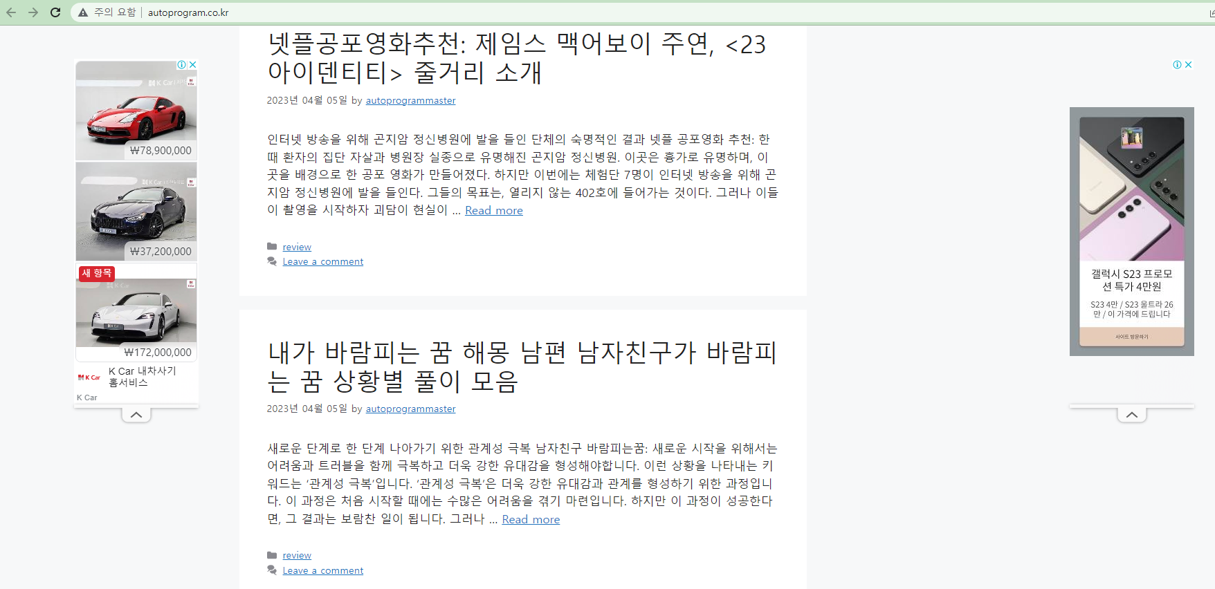 ChatGPT 를 활용한 블로그 자동 포스팅 프로그램 활용 방법프로그램 구동 방법 (구매자 할 일)========================================================== Excel 파일 혹은 메신저를 통해 키워드 입력 프로그램 내 자동 포스팅 발행 시간 설정 (ex. 30분/60분) 예약 발행 클릭========================================================== 프로그램 동작 내용========================================================== 연동된 ChatGPT 아이디를 활용하여 설정된 키워드에 대한 블로그 글 작성 연동된 블로그 아이디에 자동 포스팅을 위한 글을 임시 저장 설정된 시간에 맞춘 생성된 글을 자동 포스팅* 약 2000자~3000자의 입력된 키워드에 대한 글을 자동으로 포스팅하며 연관된 사진을 자동으로 불러와 삽입합니다. ========================================================== 수익화 방법========================================================== 약 2주간 꾸준히 블로그 포스팅 최대 갯수 만큼의 글을 자동 포스팅 수행 구글 애드센스/네이버 애드포스트 광고 승인 요청 승인 완료후 꾸준한 블로그 포스팅 수행* 구글 애드센스/네이버 애드포스트를 통한 자동 수익 실현 가능 (월 평균 15~30만원)==========================================================99000원 추가시 쿠팡파트너스/뉴스픽 파트너스 광고 배너 삽입 기능 추가 (클릭시 해당 링크를 통해 결제 발생시 일정 수익 발생)* 위의 광고를 통한 월평균 수익은 개인의 활용도에 따라 달라질 수 있으며 해당 금액을 보장하지 않습니다. 자동 포스팅 프로그램 설치 및 활용 방법 설명 자동 포스팅 프로그램 시연 확인 프로그램 최종 확인 프로젝트 종료* 기타 질의 및 프로그램 활용 방법 등 설치 이후 대응 가능 크롬 특정 버전 다운로드 및 설정 Python 설치 sublime test 설치 최소 i5 7세대 CPU 및 RAM 4GB 컴퓨터 준비 Teams 설치 ChatGPT 아이디 생성 및 결제 카드 연결