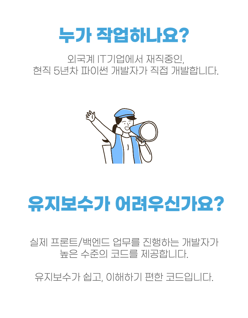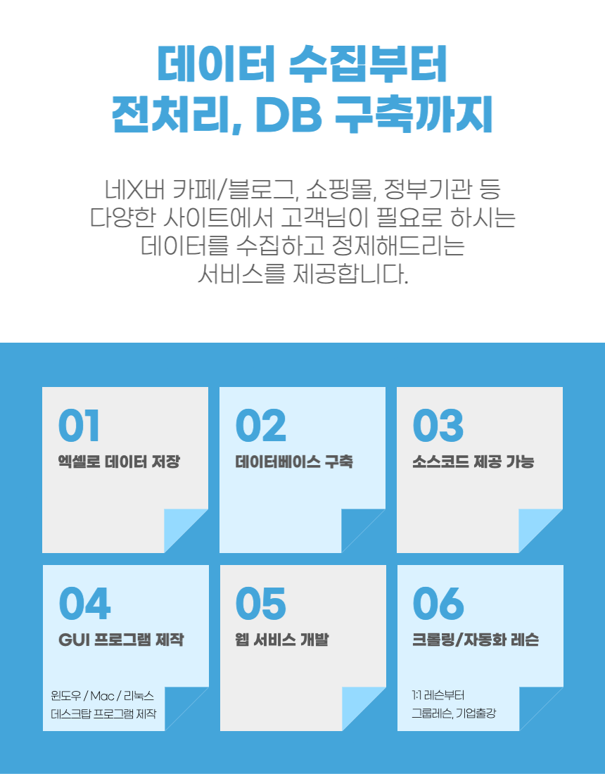 외국계 IT기업에서 재직중인 5년차 파이썬 개발자입니다.네X버 카페/블로그, 쇼핑몰, 정부기관 등 다양한 사이트에서고객님들이 필요로 하시는 데이터를 수집하고 정제해드리는 서비스를 해오고 있습니다. 크롤링만 짤 줄 아는 개발자가 아닌,실제 프론트엔드/백엔드 개발 업무를 진행하는 현직 개발자가최신 기술이 적용된 높은 퀄리티의 코드로유지보수가 쉬우며 이해하기 좋은 코드를 만들어드립니다. 단순 데이터를 엑셀로 드리거나소스코드를 제공하거나프로그램 형태로 만들거나데이터베이스를 구축하거나웹서비스를 구축하거나 다양한 실제 사례를 바탕으로 최적의 솔루션으로 구현해 드립니다. 1. 고객님과의 상담을 통해 작업 기간, 내용, 프로그램 제작 방향 등이 결정됩니다.2. 작업물이 고객님께 전달됩니다.3. 고객님께서 구매확정 해주시면 됩니다. 대상 웹사이트추출하고자 하는 페이지추출하고자 하는 내용(제목, 본문, 댓글, 사진 등)추출 범위(기간, 페이지)