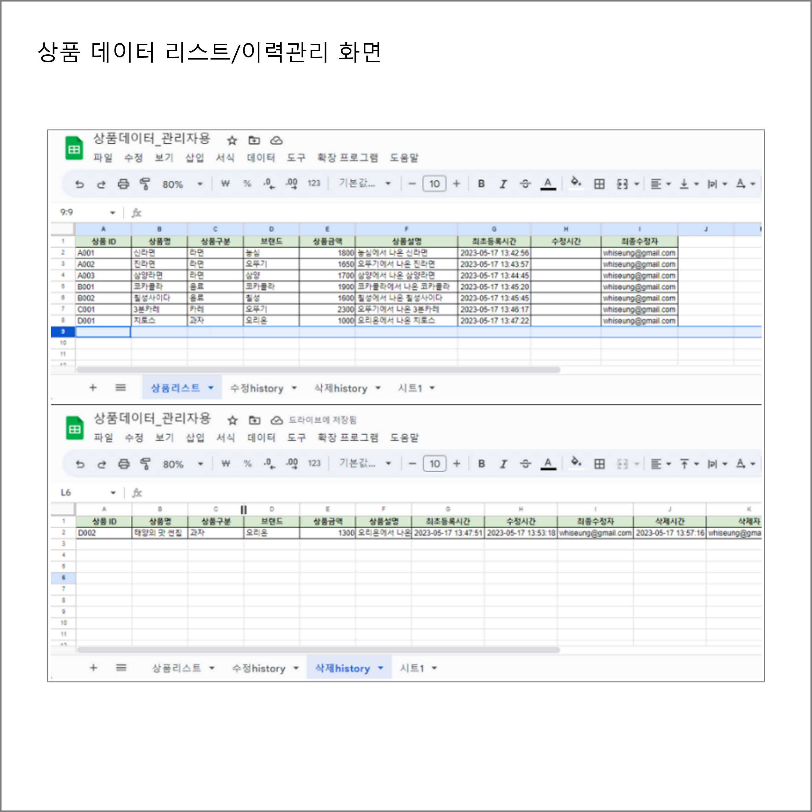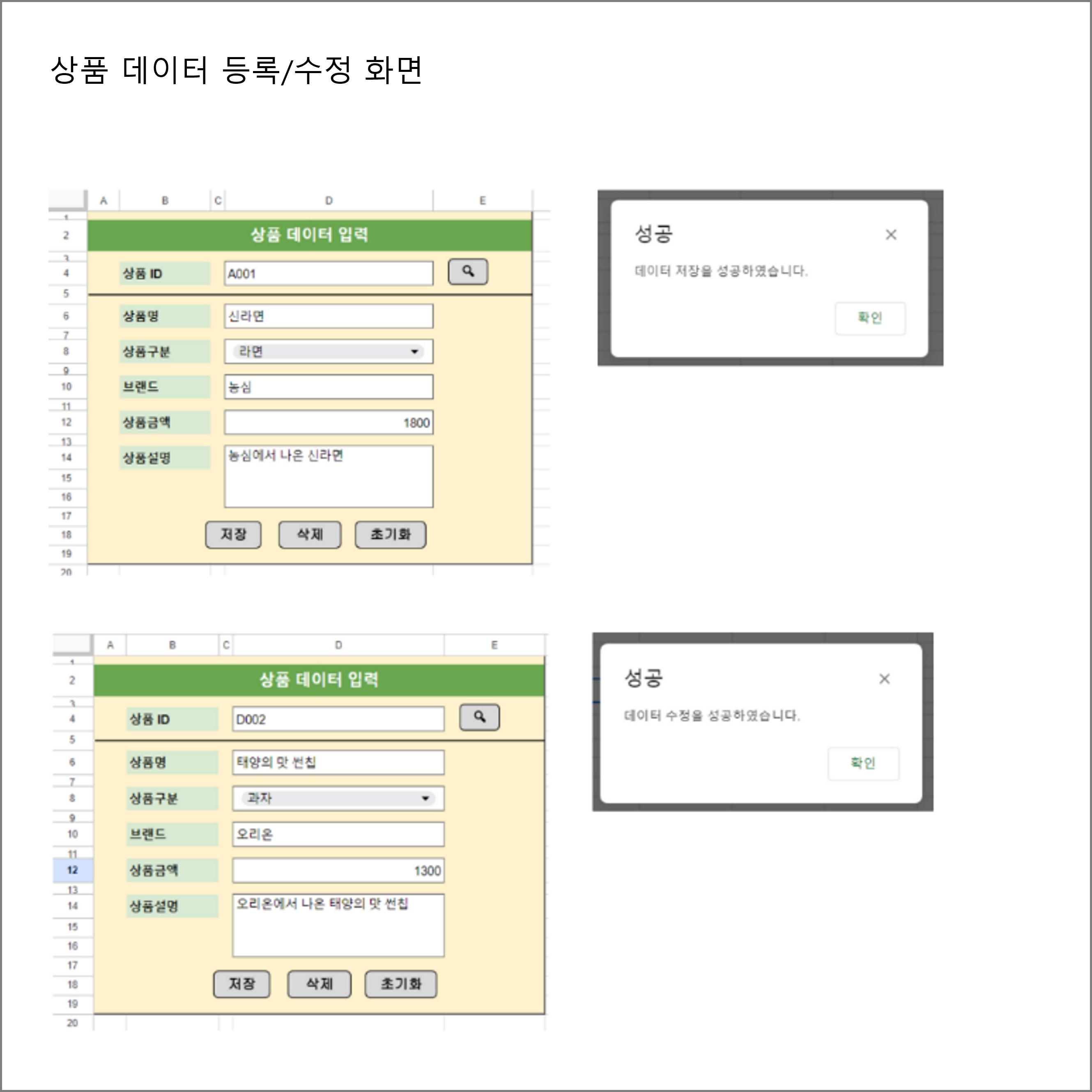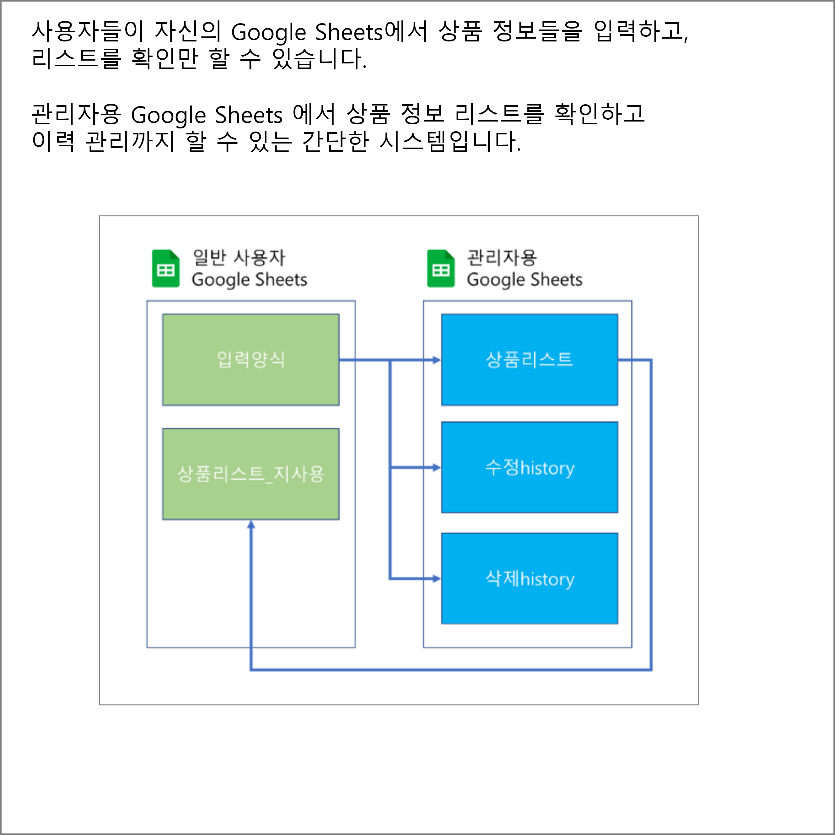 ERP 웹 개발, 유지보수 및 기획 경험을 가지고 있습니다.사용자의 편의성을 고려해 최적의 방안을 제시 드립니다.상품관리 뿐만 아니라 요구 사항에 따른 모든 관리형 Google Sheets를 구성해 제공해드립니다.- 종속 되는 Dropdown 구현- cell 의 edit event 구현등 화면 단위의 event 처리도 제공합니다.상품 관리의 경우 재고 알림(email, telegram 등) 기능도 제공 드립니다.원하시는 알림 기능 또한 제공해드립니다.기본 기능 외의 추가 기능(외부연동 등)에 대한 과금이 발생 될 수 있습니다. 1. 상담2. 결제3. 요구 사항 수렴4. 개발 최적화 방안 제시5. 컨펌6. 1차 결과물 전달7. 수정 사항 반영8. 구매 확정 - 요구사항에 대한 확실한 정의- 화면 정의서(선택)- 데이터 정의서(선택)참고하자고 하는 샘플이 있으시면 더 좋습니다.