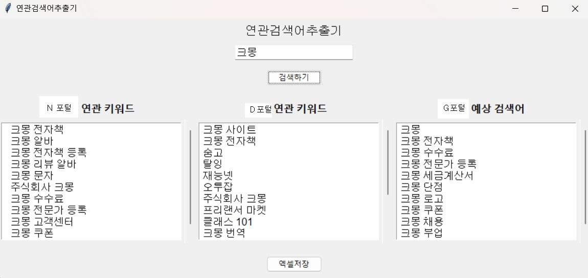 N포털 / D포털 / G 포털 연관 검색어 추출기 N포털과 D포털은 키워드 검색시 제일 하단에 연관 검색어가 나오는데요블로그 상위노출을 위해서 연관 키워드를 본문에 녹여가며 포스팅을 하면상위 노출하는데 도움이 됩니다.G포털도 마찬가지고 키워드 입력창에 입력시 나오는 예상 검색어 목록이 있는데예상 검색어도 본문에 녹여 작성한다면 구글에 노출 확률이 더 유리 하겠죠?그래서 원하는 키워드 단 한가지만 입력하기만 하면 N포털과 D포털은 연관 키워드 추출을해주고 G포털은 예상 검색어 목록을 쫘~악 다 추출을 하여 한눈에 보기 좋게 나열이 됩니다.그리고 엑셀로도 바로 저장이 가능하여 키워드를 수집하기 편리하도록 해봤습니다.이젠 연관키워드 추출기 한번의 키워드 검색으로 편하게 추출해보세요!※구매하신 분들은 프로그램이 업데이트가 되어도 무료로 받아보실수 있습니다.※프 1) 크몽을 통해 결제2) E-Mail 또는 크롱 프로그램으로 바로 전송 (추출기 프로그램 및 사용설명서(PDF파일)) 1) 윈도우 기반으로한 컴퓨터에서만 사용가능 합니다.2) [MAC PC / 스마트폰 ] 환경에서는 사용불가 합니다.