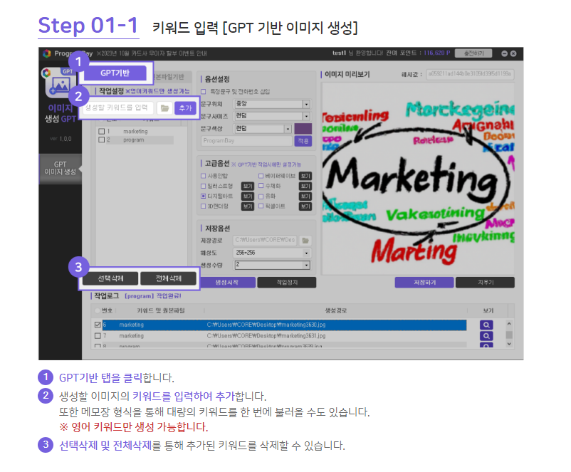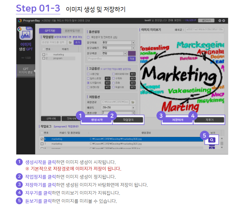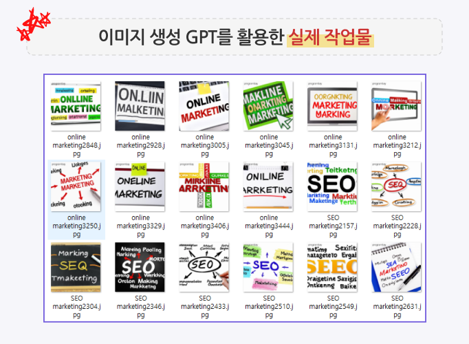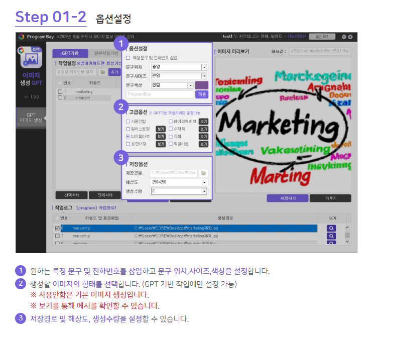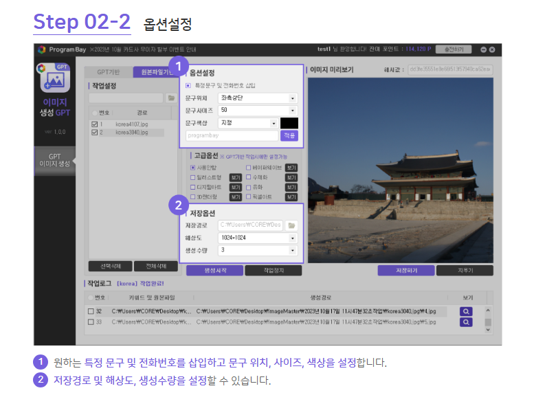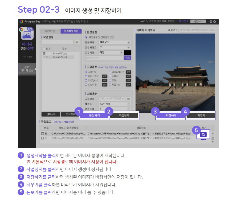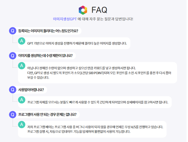 바이럴 마케터님들!SNS 마케팅 시 중복 이미지/ 유사 이미지에 걸릴까봐 걱정되시죠?이제 이미지 생성 GPT 로 중복/ 유사 이미지 걱정말고편하게 SNS 마케팅, 블로그 포스팅 하세요!- 이미지 생성 GPT 란?GPT 기반으로 키워드를 입력하여 키워드에 맞는 다양한 이미지를 생성하고,이미지 해시값을 변경하여 하나의 이미지를 새로운 이미지로 대량 생성 가능한이미지 생성 프로그램입니다.SNS 마케팅, 블로그 포스팅 시 중복 / 유사 이미지에 걸리지 않고,특정 문구 및 전화번호를 이미지에 삽입함으로써지속적인 홍보 효과를 기대할 수 있습니다.[특징]1. 이미지 세탁이미지 하나를 여러 번 써야할 때 중복 / 유사 이미지에 걸리지 않게해시값이 변경되어 이미지 세탁이 가능합니다.2. 지속적인 홍보이미지에 특정 문구 및 전화번호를 삽입하여 홍보 효과가 극대화 됩니다.3. GPT 기반 이미지 생성GPT 기반으로 키워드 입력만으로 원하는 이미지를 손쉽게 생성합니다.4. 옵션 세부 설정 가능문구 위치, 사이즈, 색상 설정과 저장경로 및 해상도, 생성 수량 설정이 가능합니다. 1. 구매문의ㄴ (문의하실 내용을 사전에 정리해 주시면 더욱 빠르고 자세한 상담이 가능합니다.)2. 문의 진행3. 결제 진행4. 프로그램 전송5. 설치 후 사용 PC를 접속할 수 있는 환경(PC, 인터넷 등)궁금하신 문의사항이 있으시다면 사전에 준비주시면 더욱 빠른 상담이 가능합니다.