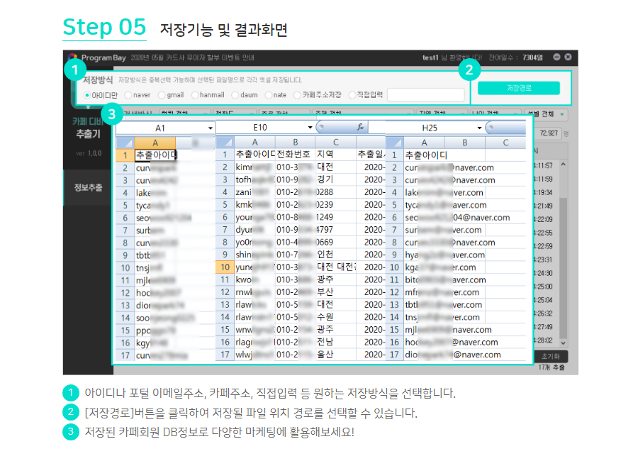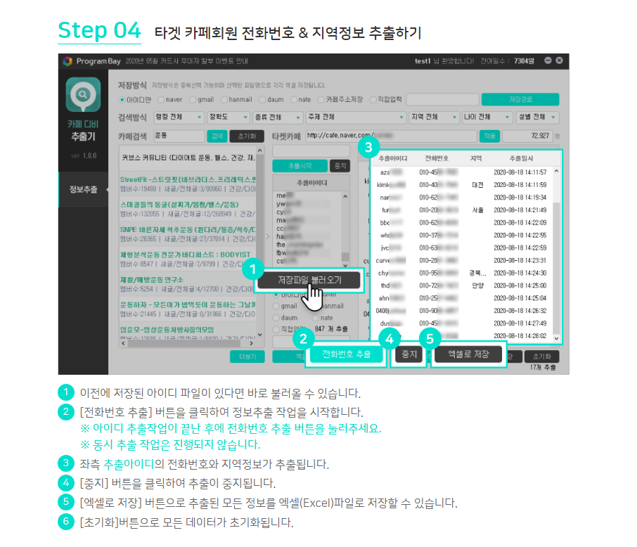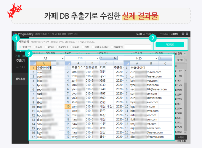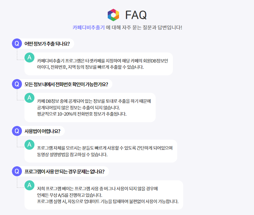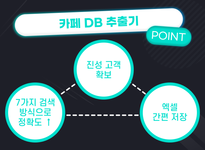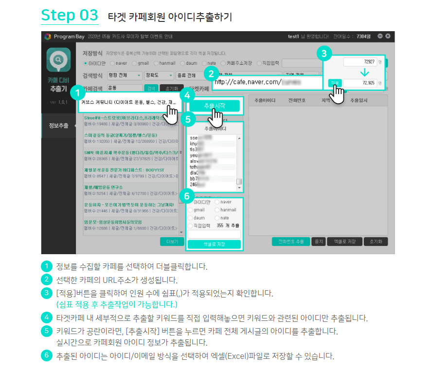 카페 마케팅 하시면서 회원 디비 수집하기에막막하시죠?N사 카페 디비 추출기로 효율적으로 업무하세요!- 카페 DB 추출기란?N사 카페에 가입된 카페 회원의 영업, 마케팅용 DB 정보를수집할 수 있는 카페 디비 추출 프로그램입니다.키워드로 카페를 검색하여 타겟 카페에 실제 활동 중인 회원의 DB를 자동으로 저장할 수 있습니다. [특징]1. 카페 회원 DB: 타겟 카페 정보를 조회하여 가입된 회원의 DB를 수집합니다.2. 키워드, 랭킹, 정확도 등 7가지 검색방식으로 검색 가능: N사 카페 검색 방법과 동일한 7가지(랭킹, 정확도, 종류, 주제, 지역, 나이 ,성별) 검색방식을 통해 원하는 카페를 확인할 수 있습니다.3. 진성 고객 확보: 타겟 키워드에 맞는 카페 회원 정보를 수집하여 타겟 마케팅을 하고진성 고객을 확보할 수 있습니다.4.간편 엑셀 저장 가능!: 추출된 카페 회원 DB는 PC 바탕화면에 자동으로 엑셀 파일로 저장됩니다. 1. 구매문의ㄴ (문의하실 내용을 사전에 정리해 주시면 더욱 빠르고 자세한 상담이 가능합니다.)2. 문의 진행3. 결제 진행4. 프로그램 전송5. 설치 후 사용 PC를 접속할 수 있는 환경(PC, 인터넷 등)궁금하신 문의사항이 있으시다면 사전에 준비주시면 더욱 빠른 상담이 가능합니다.