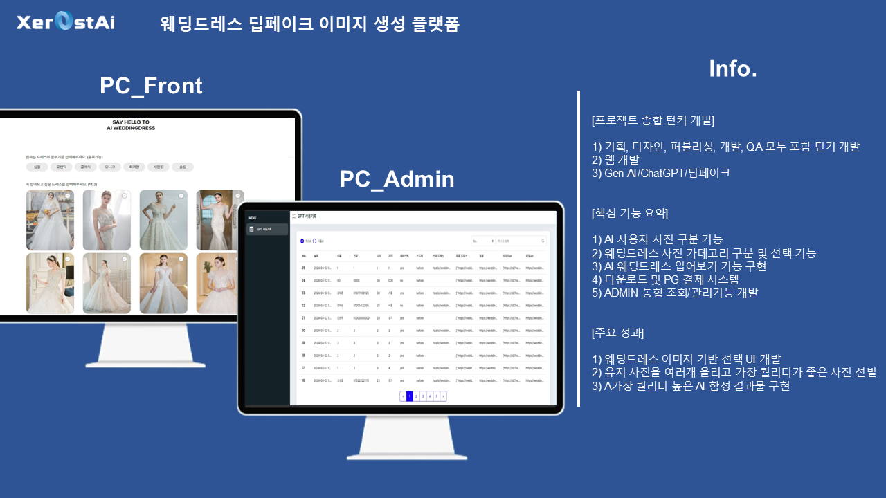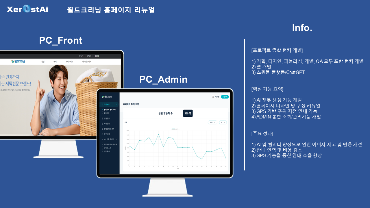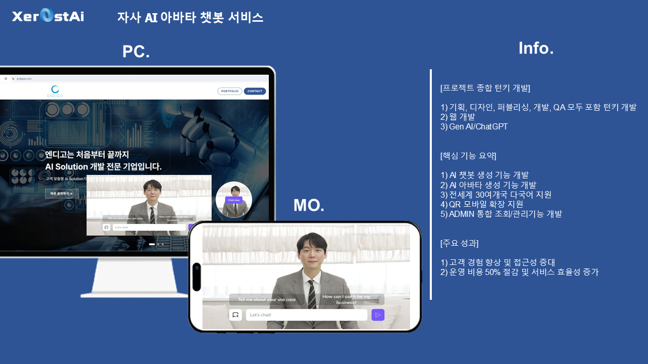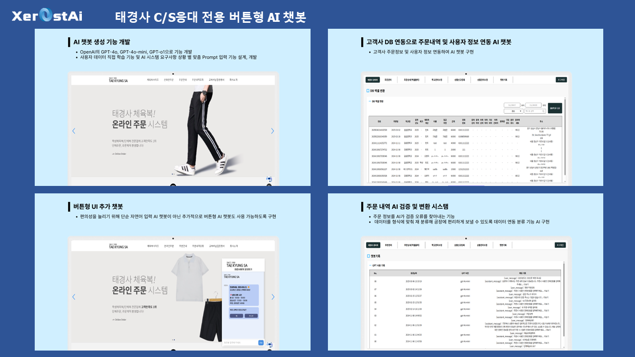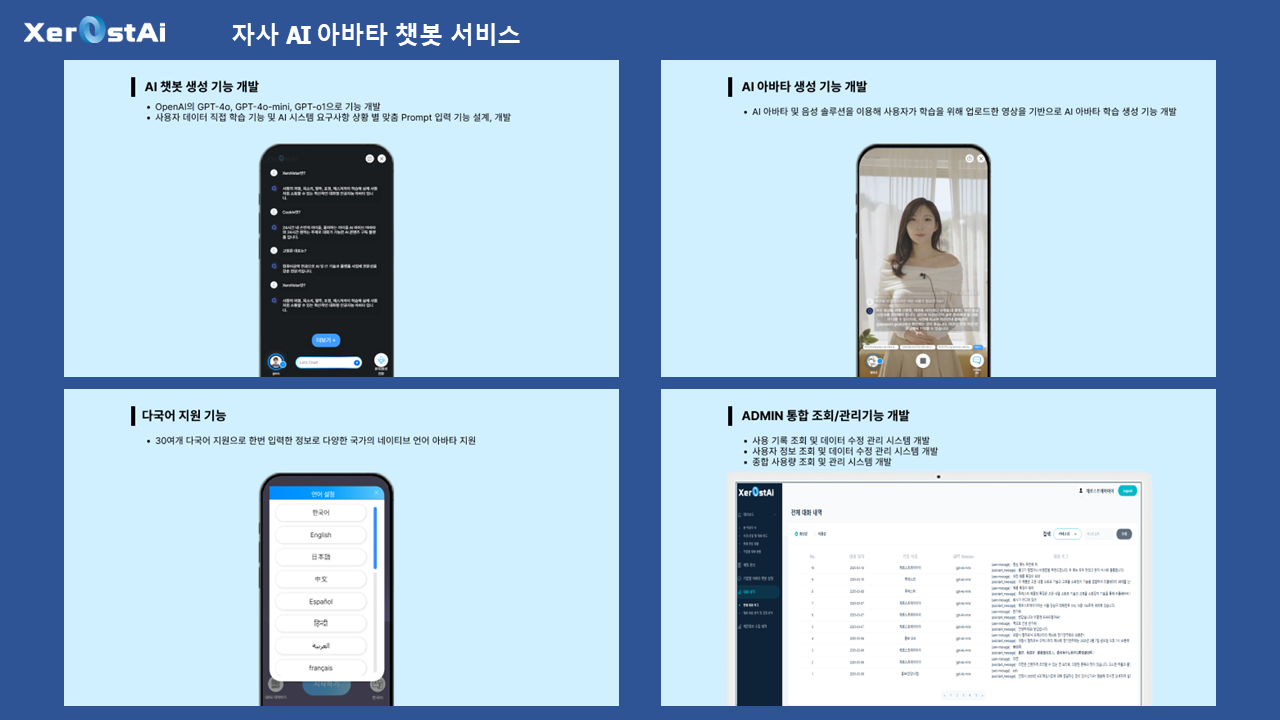 믿을 수 있는 회사와 진행하세요.- AI 관련 100건 이상의 프로젝트 외주 경험을 가지고 있습니다.- 모든 소통은 투명하고 중간 결과물을 언제든 확인하실 수 있습니다.- 대기업, 대학, 공공기관 등 많은 AI 개발 레퍼런스 경험을 가지고 있습니다.젊은 사람들이 젊은 결과물을 만들어 냅니다.- 대표와 임직원 모든 담당자가 20-30대의 젊은 기업입니다.- 가장 트렌디하고 매력적인 최신 기술로 AI 기반 서비스 개발 구축 경험을 이해하고 있습니다.- 최신 AI 기술 적용하여 최고의 서비스를 만들어 드립니다.AI 솔루션의 경험과 최고라는 자부심으로 결과물을 만들어 드립니다.- LLM(AI모델) : 현존 세계 1위 AI 솔루션인 ChatGPT의 AI엔진인 OpenAI GPT 뿐 아니라, DeepSeek 및 Google Gemini의 API 를 기반으로 제작 합니다.- 이미지 제작 1위 AI솔루션인 Midjourney 뿐 아니라, OpenAI의 Dall-E 솔루션 등을 활용합니다.- AI 영상제작 및 AI 라이브 아바타 제작 등 다양한 솔루션 적용도 가능합니다.- ChatGPT와 최소 동일한 수준의 기본 기능을 제공하며, 맞춤형 세팅으로 훨씬 더 최적화된 높은 수준의 결과물을 받아보실 수 있습니다.공통사항(기본)- 가장 최신의 GTP API 버전 사용 및 자동 업데이트- 기관명, 로고 및 이미지로 세팅, 사용 가능- 한글/타국어 자동 번역 기능 기본 지원(Google API)- Web 방식으로, ChatGPT 회원가입, 로그인 없이 누구나 URL, QR 코드 등으로 접속 사용 가능- 맞춤형 Prompt, 답변 및 성향 Settings 기본 제공- 기존 운영중인 웹, 앱에 챗봇 추가 연결 사용 가능(API로 제공 가능)맞춤제작(제작 예시)- 실제 사용되는 데이터에 맞춰 목적에 맞게 추가 학습된 ChatGPT AI 챗봇(고객센터 등)- STT, TTS 등 음성 솔루션을 이용한 음성 챗봇 등 서비스 제작(음성 데이터 학습으로 캐릭터, 연예인 맞춤 음성 제작 가능)- 회원가입 및 접속 세부 제한, 사용자 데이터 확보- Web은 물론, 앱으로도 제작 가능- 데이터 입력, 추출 분류 업무 자동화 등- 영어 및 기타 언어 학습 솔루션- AI학습된 맞춤형 블로그, 광고 글 제작- 기사나 논문 등의 특정 전문 분야 글의 요약, 분류, 재생산 솔루션- 마케팅 전략, 경쟁사 현황 분석, 키워드 및 매체 분석- 블로그 Text 및 유튜브 영상 대본 자동 추출 및 분석 분류, 재생산 솔루션- AI 안내원 키오스크* 다른 기타 AI 솔루션의 API 연결 개발 가능합니다. 1️⃣ 상담메시지를 통해 연락 주시면 원하시는 기능 요청 사항에 따라 자세한 상담을 도와드립니다.2️⃣ 결제상담 후 크몽 결제를 통해 결제를 요청 드립니다.3️⃣ 개발요청 사항과 일정을 토대로 개발을 진행합니다.4️⃣ 검수개발 완료 후 고객사의 최종 검수를 요청 드립니다.5️⃣ 완료최종 오류 및 수정 사항을 완료 후 프로젝트를 종료합니다.6️⃣ 유지보수추가적인 유지보수 진행을 도와드립니다. 1️⃣ 목표 사용자 및 서비스 목적목표하는 사용자 층과 서비스 목적에 대해 설명해주세요2️⃣ 필요 기능 리스트원하시는 필요 핵심 기능을 설명해주세요3️⃣ 간단한 사용자 시나리오사용자가 서비스 접속 후 최종 결과물을 얻는 시나리오를 설명해주세요