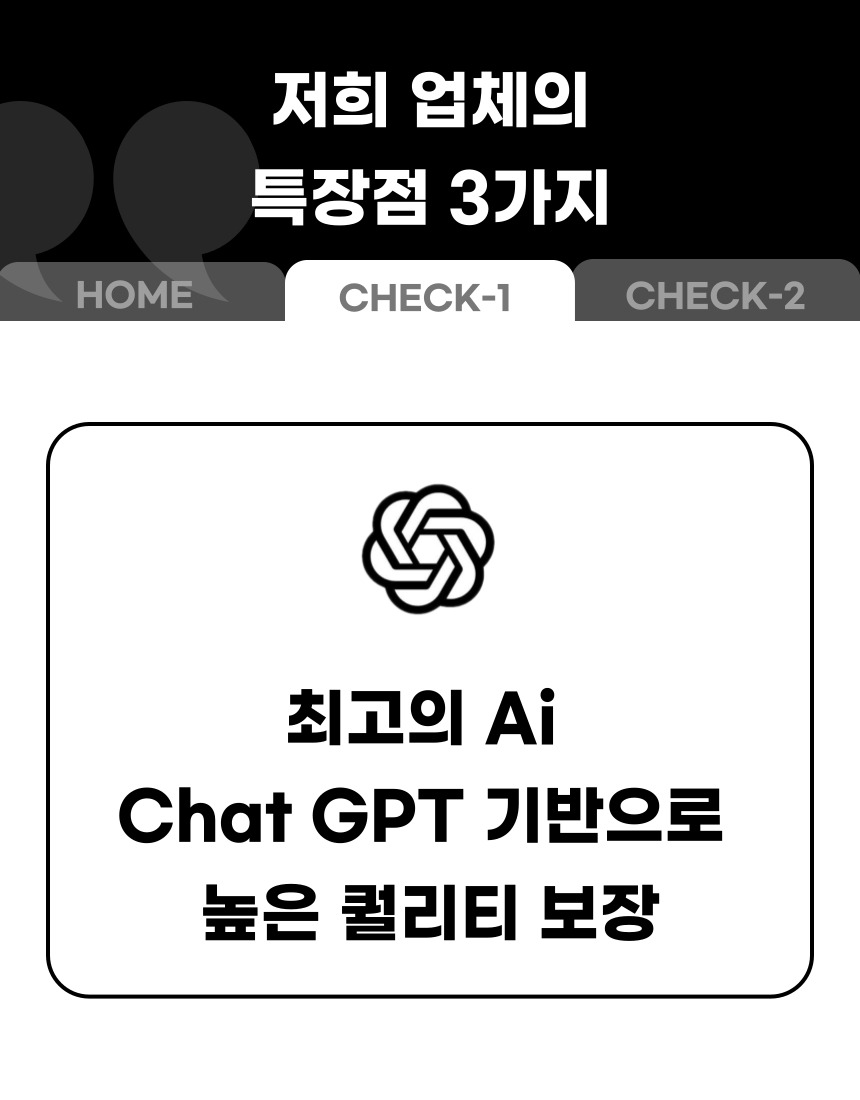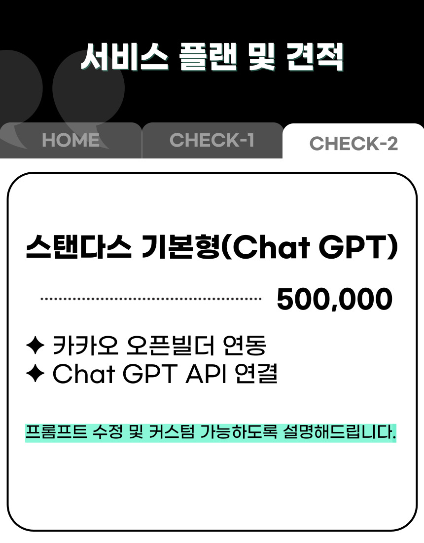 1.챗봇은 저에게 맡기세요최근 기술의 발전으로 인해 ChatGPT를 포함한 AI 기술을 활용한 마케팅과 비즈니스 아이템의 가능성이 크게 부각되고 있습니다. 많은 전문가들은 기술의 상향 평준화와 대중화가 진행됨에 따라, 이제는 기술 자체보다는 비즈니스의 본질에 더욱 집중해야 한다고 생각합니다.이러한 맥락에서, 개발자,마케터,인공지능전문가가 모인 "홈크리에이터"가 여러분에게 가겠습니다!챗봇 제작에 과도한 시간과 비용을 투자하지 마시고!이 분야의 전문가들에게 작업을 맡겨 효율성을 높이십시요!2. 텍스트 파일 학습 가능- openai의 최신 api, 텍스트 파일(.pdf, .txt 등)의 내용을 학습한 챗봇 제작이 가능.-원하시는 문서(고객 상담 시 필요한 매뉴얼 등)의 내용을 바탕으로 답변을 제공하는 챗봇을 제작- 외부 api 또는 공공데이터를 연동한 챗봇 제작도 가능.-필요 시 웹/크롤링을 통한 데이터 추출 또한 가능."매뉴얼화되어 있고 반복적인 업무들의 자동화"chatGPT의 가장 큰 효용성이 바로 이러한 부분입니다. 문서 학습 챗봇으로 불필요한 업무에 투여되 는 시간과 비용을 10배 이상 줄일 수 있습니다.3. chatGPT api 활용 웹서비스 제작 가능- 카카오토 챗봇 뿐만 아니라, chatGPT api를 활용한 웹 서비스를 제작 가능.저에게 아이디어를 제공해주시면 웹서비스까지 제작해드리겠습니다!여러분들의 아이디어에 날개를 달아드리겠습니다! 서비스 제공 절차 기능/요청 사항 검토 & 가능 여부 및 일정 상담크몽 메시지로 연락 주시면 상세 상담을 도와드립니다.2 결제상담 후 크몽 에스크로를 통해 결제합니다3 개발요청 사항을 토대로 개발을 진행합니다 검수개발 완료 후 전문가와 고객이 함께 검수합니다5 완료검수 후 수정 사항이나 오류가 있는 부분은 수정하여 제작을 최종 완료합니다.6 유지보수결제하신 상품 종류에 따라 이후 수정 및 유지보수가 진행됩니다 카카오톡 챗봇 제작 시필수 준비사항본 챗봇은 openai의 api(gpt-3.5-turbo, gpt-4 등)와 카카오 | 오픈빌더를 기반으로 제작됩니다.따라서 다음과 같은 두 가지 사항이 반드시 필요합니다1. openai api keyhttps://openai.com 에 가입하시고, api key를 발급받으셔야 합니다.2. 카카오 오픈빌더 사용 허가https://ikakao.com/에서 오픈빌더 사용 신청을 통해, 고객님의 카카오 계정으로 오픈빌더 사용 허 가를 받으셔야 합니다chatGPT 활용 웹 서비스 제작 시필수 준비사항1. openai api keyhttps://openai.com 에 가입하시고, apikey를 발급받으셔야 합니다.2. AWS(EC2 등) 환경 구축웹서비스 배포를 위해서는 클라우드(AWS) 서버 환경 구축이 필요합니다. 웹서비스 종류에 따라 준비긴으므로 상담 시 상세한 안내 도와드리겠습니다
