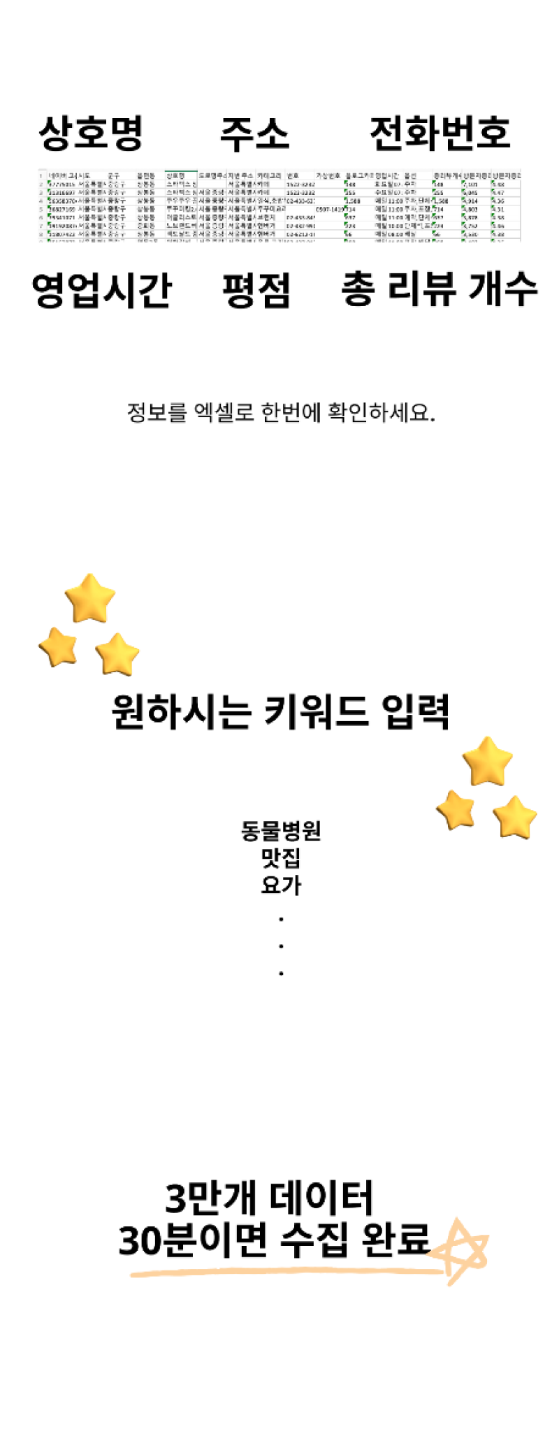 *부가세 포함입니다.*계산서 발행 가능합니다.-----프로그램이 점점 최적화 & 업데이트 되고 있습니다. 1. 신규업체 추출기능네이버 플레이스 신규등록된 업체만 모아서 추출 가능.2. 전국 데이터 추출동단위 까지 모두 선택가능.서울시만 선택하면,서울시에 포함된 서울시+구+동 조합으로키워드검색 가능3. 업체별 키워드별 랭킹 추적- 검색키워드, 랭킹이 업체별로 누적됨- 업체별 키워드별 순위를 보고 싶은 마케팅 업체에게 강추!!4. 이미지 다운로드업체별로 이미지 다운로드까지5. 모든 데이터 엑셀 다운로드6. 검색기능업체 코드, 업체명 검색기능 ----현재 제공하는 정보(업체명, 카테고리, 도로명 주소, 전체 주소, 가상번호 및 번호, 신규여부,블로그 카페 리뷰 수, 전체 리뷰 수, 방문자 평점, 톡톡URL, 방문자 리뷰 수, 영업시간)N사 플레이스에 등록된 모든 업체의 정보 궁금하지 않으세요?---전국에 업체 정보를 엑셀로 정리하는 프로그램이 있어요키워드만 입력하면키워드에 해당되는 전국 업체의 모든 정보를엑셀로 다운로드 해줘요.프로그램을 구매하고 비즈니스를 성장시켜보세요. 서비스 제공 절차는 아래와 같습니다.1. .exe 파일로 드립니다.프로그램은 네이버에서큰 변동이 있지 않으면영구적으로 사용 가능합니다.맥에서도 가능합니다. 의뢰인 준비사항은 아래와 같습니다.1. 사용하고 계신 OS를 확인해주세요. (윈도우, 맥)