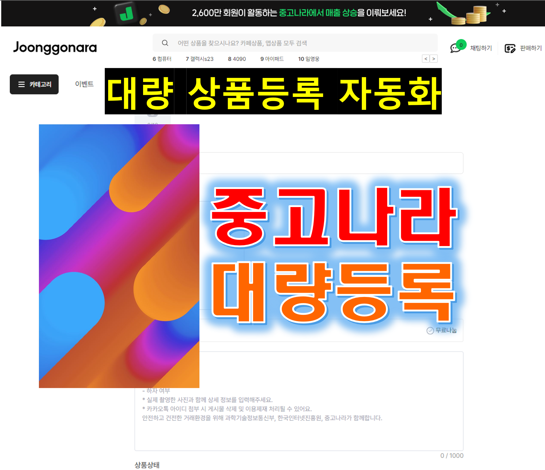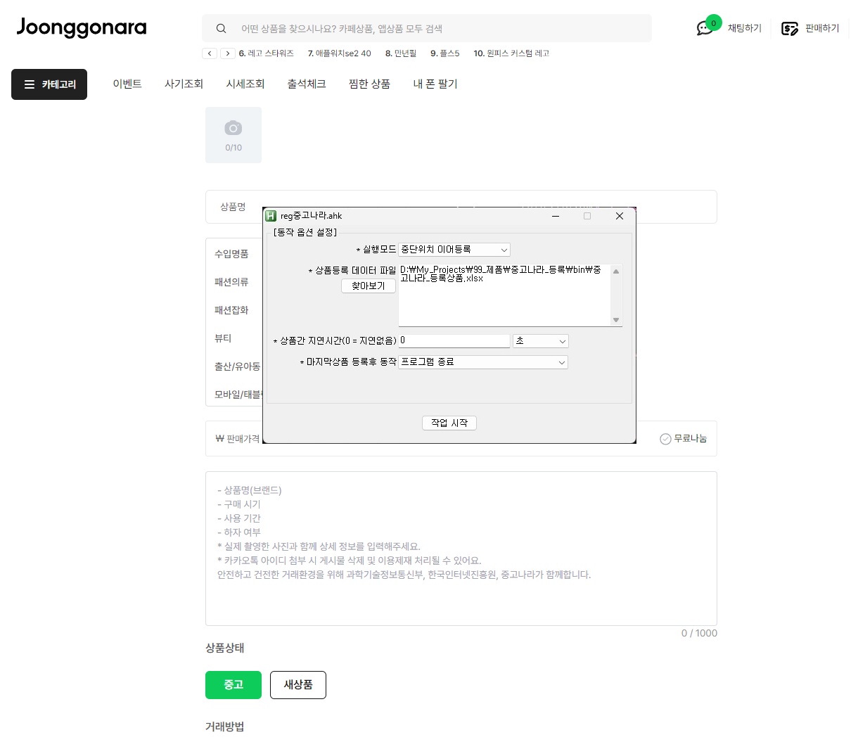 ###### 중고나라 대량 상품등록 프로그램 #####정해진 엑셀양식 파일에 등록할 상품정보 및 옵션값을 기입한후 프로그램을 실행프로그램이 자동을 상품 이지미를 업로드하고 각종 입력항목을 입력처리후 상품등록까지 자동으로 처리해 줍니다.* 기본 보증기간 : 납품후 3개월, 기간중 장애/에러에 대한 무상기술지원* 기간 만료후 건별 유상기술지원 가능---- 다양한 프로그램의 개발상담 환영 ----- 1. 세부상담2. 개발요건 합의3. 견적4. 결제5. 개발착수 및 의사소통6. 테스트 버전 완료 및 테스트, 의뢰인/개발자 상호 피드백 중요7. 개발완료 및 구매확정8. 보증기간 진행, 에러/장애에 대한 무상기술지원9. 보증기간 만료후 건별 유상기술지원10. 기능확장 및 추가기능 개발 발주, 의뢰인 필요시 1. 의뢰하실 개발 내용에 대한 정리2. 기술적 사항으로 기획에 어려움이 있다면 무료 기술 상담 가능