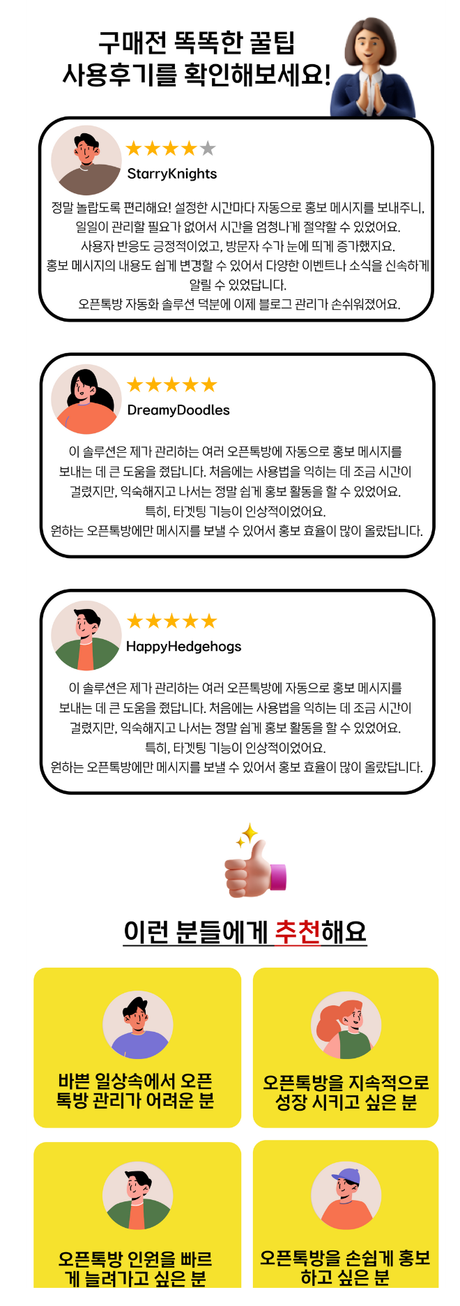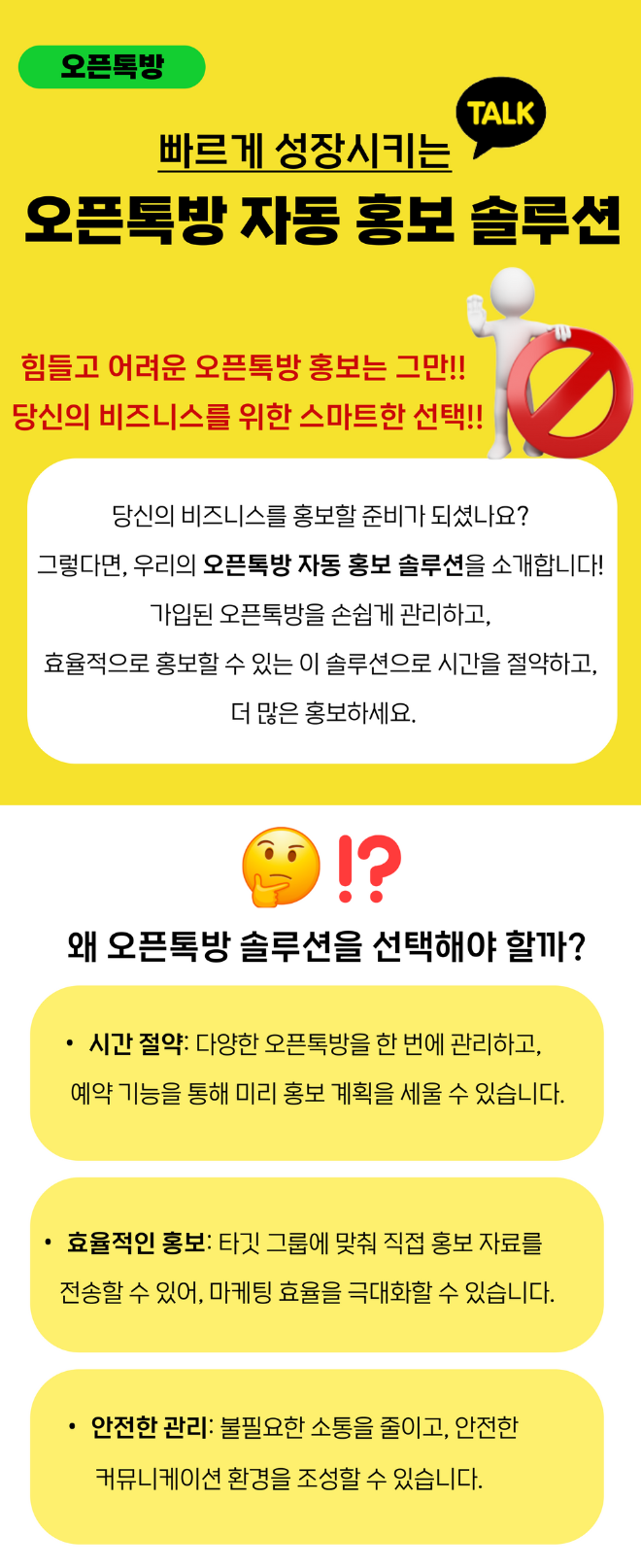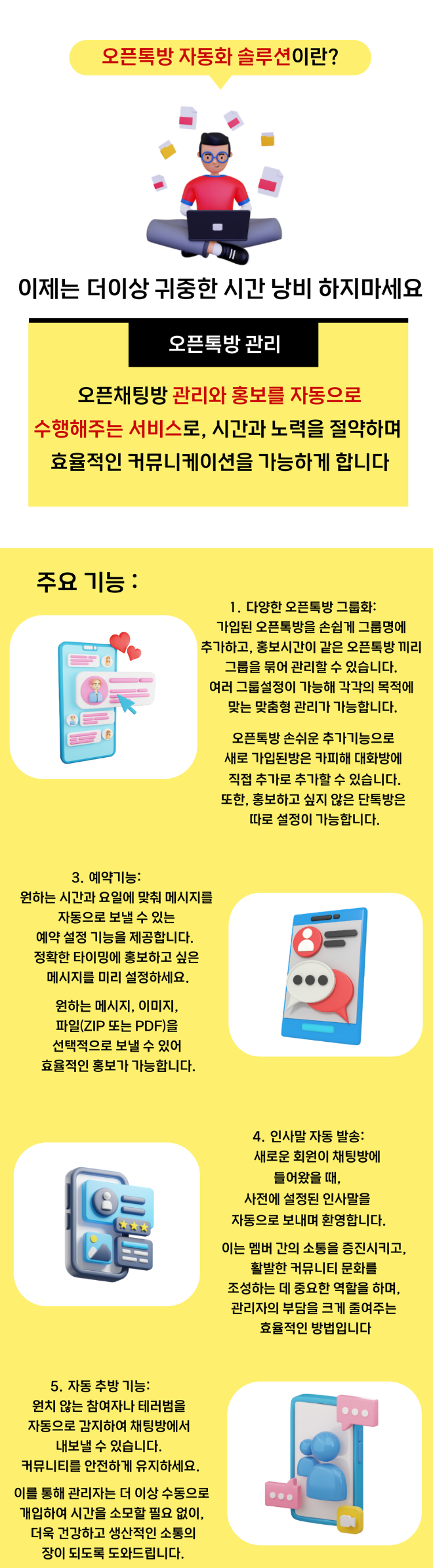 이 솔루션은 가입된 오픈톡방을 자동으로 관리하며, 그룹별로 홍보 시간을 설정하여 효율적인 홍보 활동을 지원합니다.사용자는 원하는 메시지, 이미지, 파일(ZIP 또는 PDF)을 예약 발송할 수 있고, 새 회원이 가입했을 때 인사말을 자동으로 전송하는 기능도 제공됩니다.불필요한 단톡방은 제외 설정이 가능하며, 테러범을 자동으로 감지해 내보내는 기능도 탑재되어 있습니다.모든 이 기능을 1년 동안 사용할 수 있는 가격은 220,000원입니다.1. 서비스 가입 및 설정: 사용자는 서비스에 가입한 후, 자신의 오픈톡방 목록을 불러와서 관리할 오픈톡방을 선택합니다.2. 그룹 설정: 선택한 오픈톡방을 여러 그룹으로 나누어 관리할 수 있습니다. 그룹별로 홍보 시간과 메시지, 이미지, 파일 전송 설정을 합니다.3. 메시지 및 파일 준비: 홍보할 내용과 함께 전송할 이미지나 파일(ZIP 또는 PDF)을 준비합니다. 이 내용은 사전에 설정된 시간과 요일에 자동으로 발송됩니다.4. 예약 발송 설정: 홍보하고자 하는 메시지와 파일을 특정 시간과 요일에 맞춰 예약 발송합니다.5. 인사말 및 자동 관리 기능 활성화: 새로운 회원이 오픈톡방에 가입했을 때 인사말을 자동으로 보내도록 설정합니다. 또한, 설정을 통해 테러범 자동 감지 및 추방 기능을 활용할 수 있습니다.6. 서비스 모니터링 및 조정: 서비스 사용 중 발생할 수 있는 문제를 모니터링하고, 필요에 따라 홍보 메시지, 예약 시간, 그룹 설정 등을 조정합니다.이러한 절차를 통해 사용자는 자신의 오픈톡방을 효율적으로 관리하며, 목표한 대상에게 체계적으로 홍보할 수 있습니다. 구입 후 자동화 솔루션과 사용자 메뉴얼 동영상이 제공됩니다.개인 사용자를 대상으로 합니다. 다수의 계정은 지원하지 않습니다.1. 결재 진행2. 상담후 궁금한 점 확인3. 자동화 솔루션과 메뉴얼 동영상 제공 오픈톡방의 상세기능을 충분히 숙지해주세요.윈도우 PC를 준비해주세요. (상담후 솔루션과 메뉴얼 동영상이 제공됩니다)