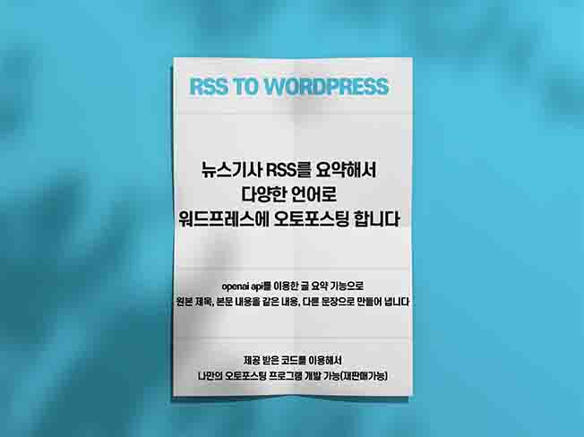 RSS 워드프레스 오토포스팅 솔루션 당신의 워드프레스 사이트를 위한 완벽한 자동 포스팅 솔루션을 찾고 계신가요? 더 이상 검색하지 마세요! 최신 뉴스를 자동으로 요약하여 워드프레스에 게시하는 우리의 RSS 워드프레스 오토포스팅 솔루션으로 시간을 절약하고, 독자들을 사로잡으세요. 패키지 옵션 STANDARD가격: 99,000원내용: 뉴스기사 RSS를 요약하여 워드프레스에 자동 게시.(실행 파일만 제공)작업 기간: 2일수정 횟수: 0회사용방법1. 보내드린 압축파일을 풀면 두 개의 파일이 나옵니다.2. 원하는 위치는 새폴더를 하나 만들고 그 안에 rsstowp.exe, settings.json 파일을 넣습니다.3. settings.json 파일을 메모장으로 열어서 안의 내용들을 채워 줍니다.""안에 본인의 정보들로 채워 줍니다.{ "wp_url": "", "wp_url_description": "워드프레스 사이트의 기본 URL입니다.", "user": "", "user_description": "워드프레스 사이트에 로그인하는 데 사용되는 사용자 이름입니다.", "password": "", "password_description": "사용자 계정의 비밀번호입니다.", "rss_url": "", "rss_url_description": "포스트를 생성하기 위해 사용되는 RSS 피드의 URL입니다.", "openai_api_key": "", "openai_api_key_description": "OpenAI API에 접근하기 위한 키입니다.", "category_ids": "", "category_ids_description": "포스트가 속하게 될 카테고리의 ID 목록입니다.", "tag_ids": "", "tag_ids_description": "포스트에 할당될 태그의 ID 목록입니다.", "post_status": "", "post_status_description": "포스트의 게시 상태를 정의합니다. 예: '1'은 임시발행, '2'은 공개발행입니다.", "posting_interval": "", "posting_interval_description": "포스트 간의 게시 간격을 분 단위로 정의합니다.", "title_prompt": "아래 기사의 제목을 읽고, 내용은 유지하되 다르게 표현된 새로운 제목을 짧게 생성해주세요", "title_prompt_description": "기사 제목을 바꿀 프롬프트를 적으세요", "content_prompt": "다음 기사를 요약해서 작성해 주세요.본문은 최소 3000자 이상이어야 하며, 구글seo에 맞게 HTML구조로 적어주세요 태그(ul,li, h1~h6, strong, 배경색)를 포함해 구조화하세요.", "content_prompt_description": "본문 내용을 구성 할 프롬프트를 적으세요."}위 세팅이 끝났다면 저장을 하고 rsstowp.exe를 실행하면 자동으로 포스팅이 시작 됩니다.포스팅을 하면 같은 폴더에 processed_links.json 이라는 파일이 생깁니다. 이 파일에는 오토포스팅 된 원본 링크가 저장이 되어 있어서, 같은 rss피드를 읽어 올때 중복 된 포스팅은 건너띄고 포스팅을 합니다. DELUXE가격: 139,000원내용: 스탠다드 패키지 + 소스코드 제공.작업 기간: 2일수정 횟수: 0회소스 코드 제공프로그램 실행 파일 이외에 소스코드를 제공합니다. Chat GPT등 생성형 인공지능을 이용하여 코드를 수정하면 쿠팡파트너스 등 다른 제휴마케팅 프로그램으로 수정을 할 수 있습니다.(재판매 가능) PREMIUM가격: 199,000원내용: 스탠다드 및 디럭스 패키지 포함 + GUI 프로그램 + 파이썬 소스코드 제공(코드 수정 후 다른 기능 추가 및 재판매 가능).작업 기간: 20일수정 횟수: 무제한소스 코드 제공스탠다드와 디럭스 패키지는 단순 실행파일로 콘솔창이 뜨는 반면에 프리미엄 버전은 GUI프로그램으로 제공이 됩니다. 키보드와 마우스로 프로그램을 제어하여 보다 편리하게 사용이 가능 합니다. 최초 프로그램 사용시 본인의 이름과 휴대폰 번호가 필요 합니다.사용방법은 첨부영상을 봐주세요. 왜 우리의 솔루션인가요?2024년 3월 현재 구글은 생성형인공지능이 만들어낸 콘텐츠에 제재를 가하기 시작하였습니다. 인공지능이 만들어낸 이야기들이 아직까지는 상당수가 있어, 포털사이트에 그러한 것들이 검색노출 되는것에 대해서 막고 있는 것입니다. 이는 당연한 결과이며 앞으로 이는 더 심하게 될 것입니다. 하지만 뉴스기사에 기반한 요약글은 성격이 조금 다릅니다. 뉴스의 텍스트를 요약하여 다른 글로 재생산 하는것은 저작권에 위배되지도 않고, 인공지능이 지어낸 이야기도 아닙니다. 무엇보다 중요한건 사람들이 관심가질만한 것들이 무한대로 내 워드프레스에 발행 할 수 있다는 것입니다. 애드센스 승인은 물론 애드센스 수익까지 노려 볼 수 있습니다. 그와 더불어 코드의 수정으로 여러가지 제휴마케팅 진행도 하실 수 있습니다.자유자재로 프롬프트를 수정하여 원본과 다른 제목, 본문내용을 재생성 합니다.(Chat GPT API 사용) 영문, 일어 등 다양한 언어로 변형하여 포스팅 가능하여 국내 뿐 아니라 해와 타겟팅 뉴스기사가 생성 가능 합니다(유사문서 아님) 시간 절약: 자동화된 솔루션으로 매일 수많은 뉴스를 요약하여 워드프레스에 게시하세요. 커스터마이징 가능: PREMIUM 패키지로 원하는 기능을 추가하거나 솔루션을 재판매하세요. 마지막으로, !당신의 워드프레스 사이트가 항상 최신 콘텐츠로 가득 차 있다면? 방문자들이 당신의 사이트를 뉴스의 첫 번째 출처로 신뢰한다면? 이 모든 것이 단 한 번의 설치로 가능해집니다. 지금 바로 행동하세요! 다른 누군가가 먼저 이 기회를 잡기 전에, 당신의 사이트를 다음 레벨로 끌어올릴 준비를 하세요. 지금 구매하기와 함께 당신의 워드프레스 사이트를 자동화된 뉴스 허브로 변모시키세요! 1. 프로그램 문의/상담2. 프로그