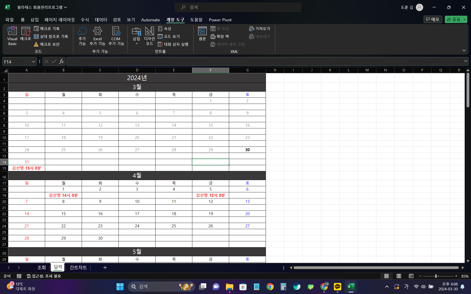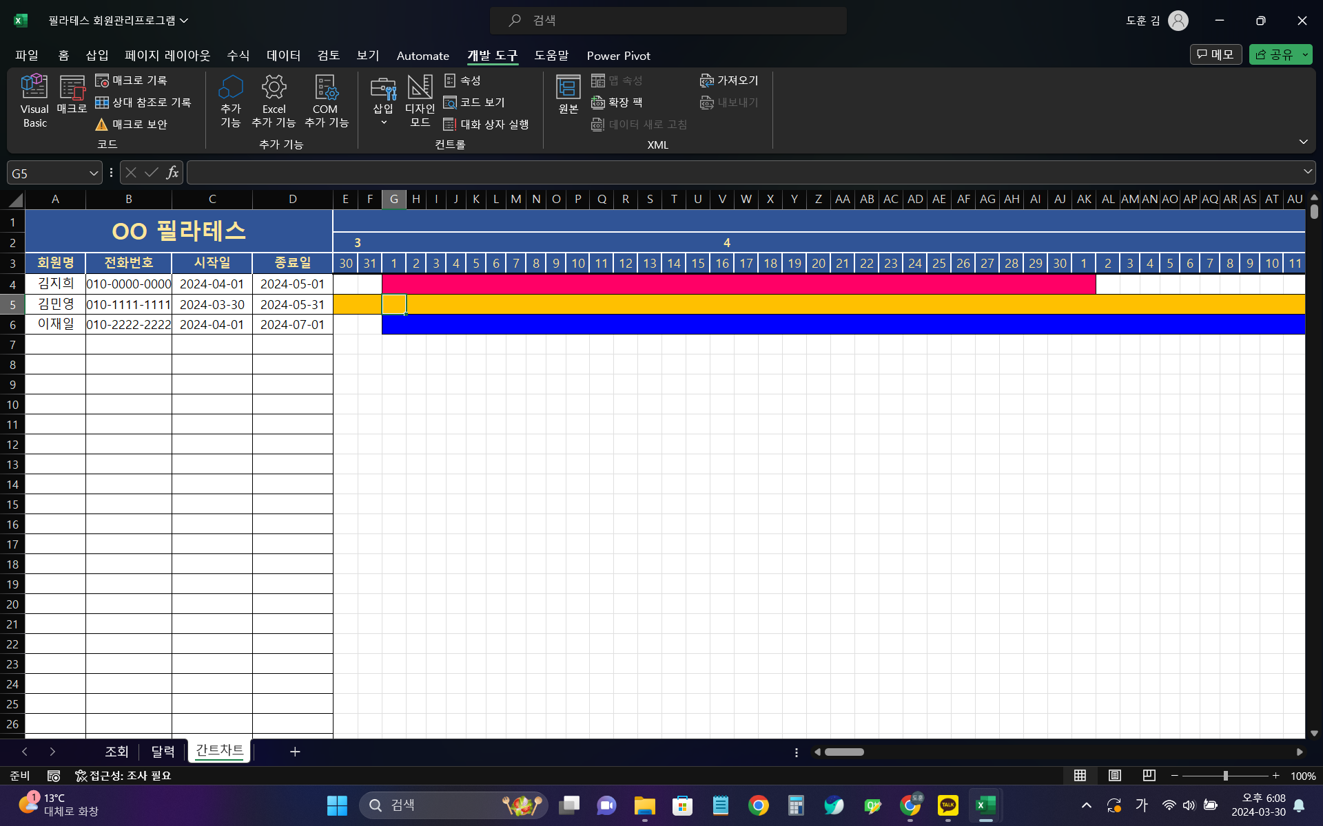 회원관리에 소모되는 시간과 비용이 고민이신 분!회원관리 프로그램을 사용하고 싶지만 비싼 가격이 부담스로우신 분!편하게 재고를 관리할 수 있는 심플한 프로그램 저렴한 가격에 제공해드립니다.기능소개1. 쉽고 빠른 회원관리1) 약속 3일전에는 초록색, 1일전에는 빨간색으로 표시되어 직관적으로 볼 수 있습니다.2) 종료일 3일전에는 초록색, 1일전에는 빨간색으로 표시되어 직관적으로 볼 수 있습니다.3) 약속일까지의 D-Day와 종료일까지의 D-Day가 자동으로 표시됩니다.2. 회원 정보 등록, 수정, 삭제 시 자동으로 간트차트, 달력 반영1) '조회'시트의 데이터는 간트차트와 달력을 신경 쓰지 않으셔도 자동으로 갱신됩니다.2) 자동을 사용일 기준 365일 이후의 달력과 간트차트를 조회하실 수 있습니다.3) 달력은 약속일이 자동 표시 됩니다.3. 직관적인 간트차트1) 간트차트의 차트의 색깔에 따라 직관적으로 회원 구분이 가능합니다.2) 트레이너와의 약속일이 자동으로 빨간색 색상 배경과 이름이 표시되어 직관적인 스케쥴 관리가 가능합니다.주의사항- 시트명이나 셀 위치는 임의로 변경이 불가능합니다.시트명 변경은 따로 문의해주시고 셀 위치나 형식 변경은 디럭스(DELUXE)로 진행 도와드릴 수 있습니다.기타 안내 사항1) 저작권 귀속 여부- 자유롭게 변형이 가능하고 개인적, 상업적 이용이 가능하지만, 해당 프로그램을 타인에게 판매나 무상 지급은 불가합니다.2) 폰트 사용 정보폰트는 맑은 고딕을 사용하였습니다. 견적 상담 -> 결제 -> 추가 상담 -> 1차 시안 -> 피드백 -> 2차 시안 엑셀 프로그램만 준비해주시면 됩니다.혹여나 추가적으로 필요한 요소가 생기면 그때 다시 안내 도와드리도록 하겠습니다.