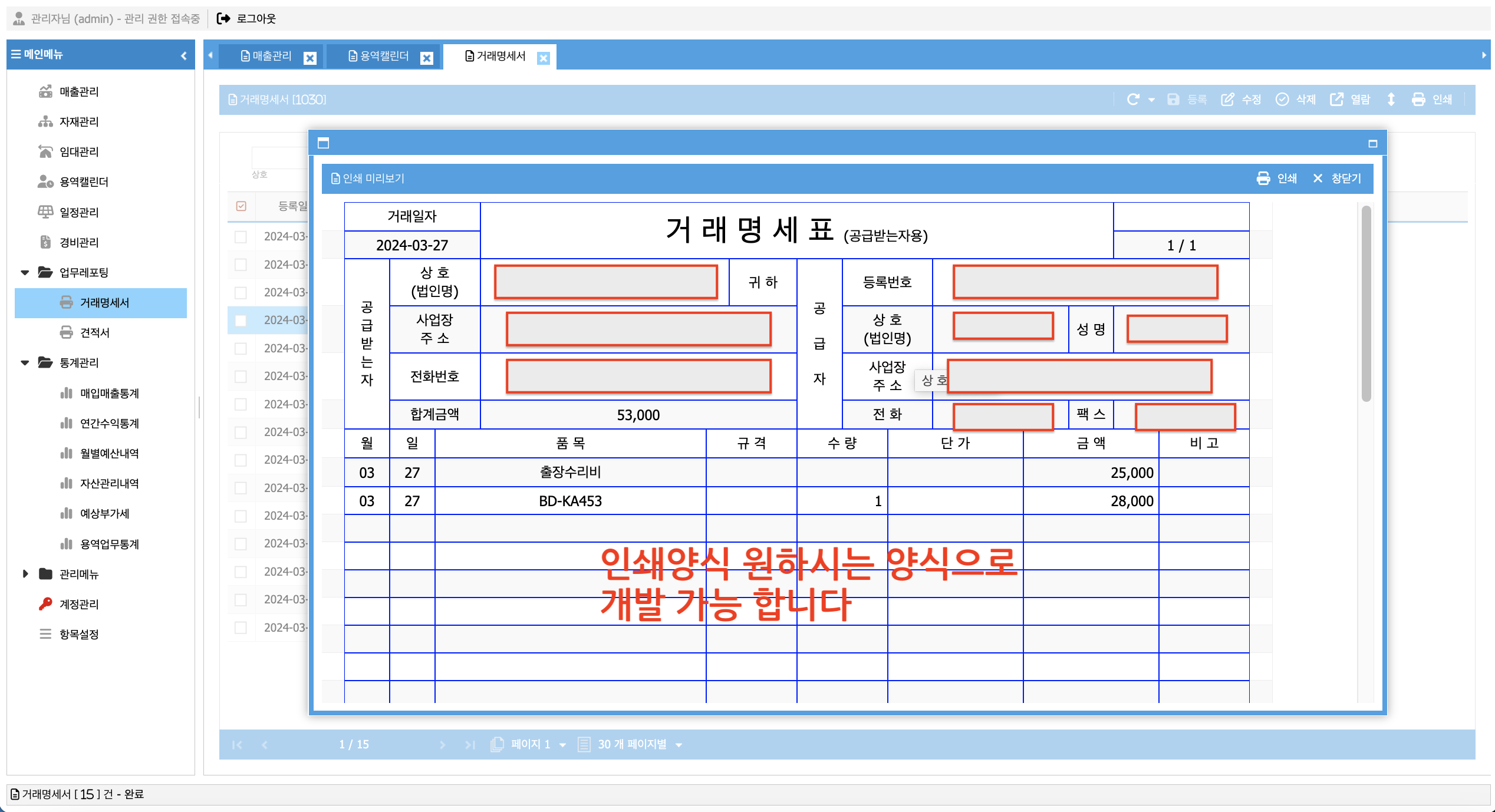 사내 업무용 시스템 및 기업용 시스템웹 형태로 전환 및 신규 개발 도와 드립니다.기업 맞춤형 업무 시스템 + AI 기술로 더 스마트하게!사내 업무 자동화, 데이터 분석, ERP/CRM 등AI 기반 기능을 접목한 효율적인 시스템을 개발해드립니다.비즈니스 인사이트 확보부터 반복 업무 자동화까지,*. 기업 맞춤형 업무 시스템 개발 + AI 적용 사내 전산 시스템재고·인사·회계 관리 자동화데이터 분석·보고 자동화AI 챗봇 통합 가능반복 업무? 수작업 보고서? 엑셀 지옥? 이제 끝!AI 기술을 접목한 맞춤형 내부 시스템 개발사내 전산 시스템부터 AI 기반 자동화까지,기획부터 구축, 유지보수, AI 모델 연동까지 원스톱 제공업무에 필요한 AI 기술을 실제 업무에 적용 가능한 형태로 구현해드립니다.기술이 아닌 ‘성과’로 말하는 개발자입니다.AI와 함께하는 미래형 업무환경, 구축 도와 드립니다. 1. 요구사항 접수고객님의 아이디어, 기능 요청, 화면 구성 등을문서, 이미지, 스크린샷, 업무 설명 등 다양한 형태로 전달해 주세요.전달된 자료를 바탕으로 기능 정의서 및 개발 범위를 명확히 정리합니다.2. 개발 및 테스트 환경 구성내부 전용 테스트 서버에서 개발을 진행하며,단계별 피드백 및 검수용 테스트 링크를 제공드립니다.고객 요청사항이 정확히 반영되었는지 직접 확인하실 수 있도록 테스트 환경을 공유합니다.3. 사용자 확인 및 검수모든 기능 구현 후,의뢰인께서 직접 테스트를 통해 검수할 수 있도록 충분한 확인 기간을 드립니다.수정 및 보완 요청은 협의된 범위 내에서 반영하여 최종 완성도를 높입니다.4. 납품 및 설치고객 검수 및 최종 승인을 받은 후,의뢰인 소유의 서버 또는 호스팅 환경에 안정적으로 설치 및 이전을 진행합니다. - 예시로 든 FAQ 입니다. 가능하다면 이러한 내용들을 정리 해서 주시면 시작을 할수 있습니다.-Q. 어떤 화면을 요청하시는 건가요?A. 예: 회원관리 화면, 상품등록 화면, 주문내역 조회 등, 기능이 구현될 메뉴나 화면의 이름을 적어주세요.Q. 필요화면들이 결정 되었다면 각 화면들에서 어떤 기능들이 필요하신가요? (모든화면마다)A. 예: 등록, 목록 보기, 수정, 삭제 등 기능을 항목별로 정리해 주세요.Q. 사용자가 신규 등록을 한다면 입력해야 하는 항목은 무엇인가요?A. 예: 이름, 아이디, 연락처, 주소 등, 등록 및 수정 시 필요한 데이터 항목을 적어주세요.Q. 목록 화면에서 어떤 데이터가 보이길 원하시나요?A. 예: 가입일자, 아이디, 이름, 연락처 등 목록에 표시되어야 하는 항목을 작성해주세요.Q. 어떤 검색 조건이 필요하신가요?A. 예: 가입일자별, 이름별, 아이디별 검색 등 사용자가 데이터를 필터링할 조건을 적어주세요.Q. 삭제 기능은 어떻게 작동하길 원하시나요?A. 예: 체크박스로 다중 선택 후 일괄 삭제, 개별 항목 삭제 버튼 등 구체적인 방식이 있다면 적어주세요.Q. 수정은 어떻게 가능해야 하나요?A. 예: 목록에서 바로 수정, 상세보기 페이지에서 수정 등 원하는 방식이 있으면 알려주세요.Q. 추가적으로 필요한 부가기능이 있으신가요?A. 예: 엑셀 내보내기, 데이터 업로드, 프린트 기능 등 부가 기능도 자유롭게 적어주세요.Q. 기타 요청 사항이 있으신가요?A. 예: 관리자만 접근, 사용자별 권한 설정, 모바일 반응형 지원 등 추가 요청사항을 적어주세요.
