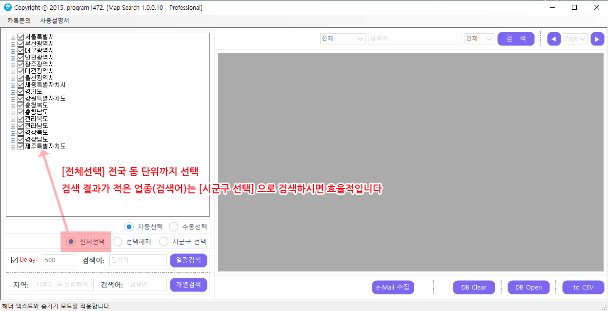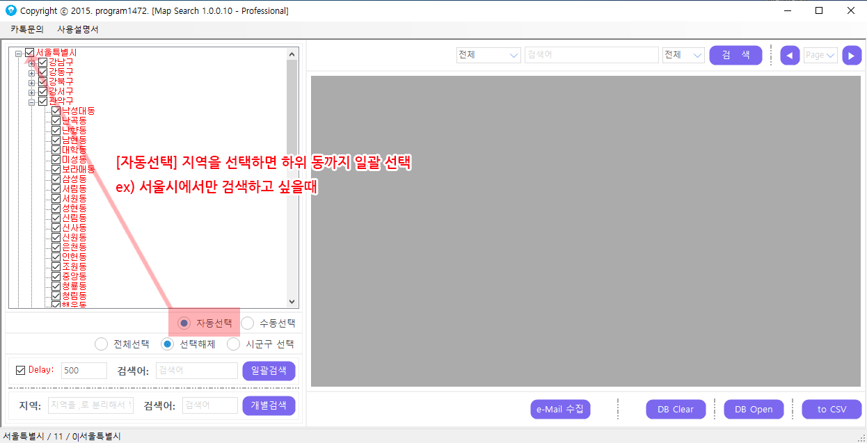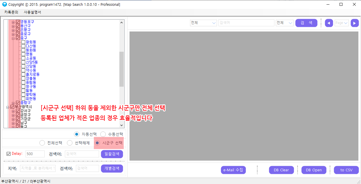 1. 전국 동단위 까지 선택 추출네이버 플레이스 검색 결과는 "지역 + 검색어"로 검색한 결과가 나옵니다.따라서 원하는 행정구역을 선택하여 결과를 추출합니다.상호, 주소, 일반번호, 핸드폰번호, 0507번호, 리뷰수, 등록일, 우편번호2.우편번호, 핸드폰 추출설정 옵션 선택으로 우편번호와 핸드폰 번호를 추가적으로 추출 할 수 있습니다.핸드폰 번호는 등록한 업체만 추출합니다.3.업체등록일 및 새로오픈 추출업체등록일은 전체 정보가 수정됐을때에는 부정확합니다.특정 정보 등록일을 기준으로 업체등록일을 추정했습니다.식당 처럼 새로오픈 카테고리가 있는 키워드는 새로오픈으로 추출 합니다.-데이타는 엑셀 cvs 파일로 저장할 수 있고 mdb로 관리 됩니다. 1. 크몽에서 결제(한달 사용료)2.프로그램 설치 안내 및 사용 방법 안내3.한 달 사용 후 연장 여부 결정추가 기능은 개발은 별도 상담 후 진행됩니다 윈도우 환경에서 구동하는 프로그램 입니다.윈도우10을 권장 드립니다.윈도우11에서도 문제 없이 동작합니다.프로그램 실행이 정상적으로 되지 않을때대부분은 윈도우 자체 문제인 경우가 많습니다.브랜드 제조사에서 설치해준 윈도우에서 발생한 적이 있습니다.일반 버전의 윈도우로 재설치하면 문제가 발생하지 않습니다.