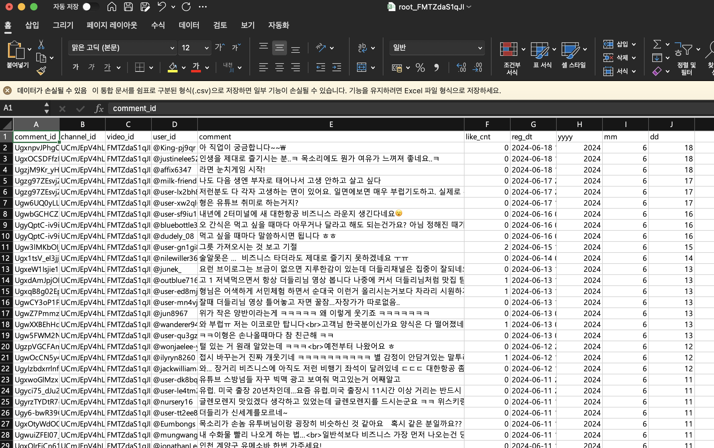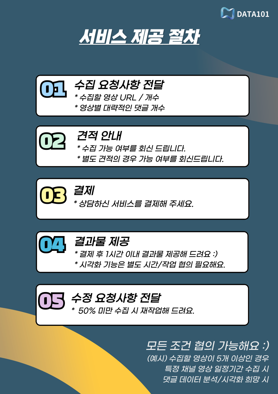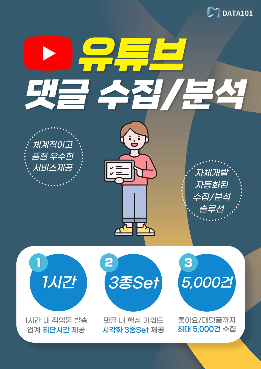 유튜브 댓글 1시간 안에 수집해 드립니다 (결제 및 협의 시부터) 제공 Data 종류- 등록일자- 닉네임- 댓글내용- 대댓글- 좋아요개수 제공 파일 형태 : Excel csv저희 (주)유에프5는 삼성, LG, 롯데, KT 출신 AI/빅데이터 전문 인력으로 구성된 법인으로, 체계적이고 우수한 품질의 서비스 제공을 약속해 드립니다.자체 개발한 자동화된 데이터 수집 솔루션을 통해 Data를 수집하여 제공해 드리므로, 결제/협의 이후 최대 1시간 안에 Data를 제공해 드립니다. 수집하실 영상의 URL 정보를 알려주시면 1시간 내로 작업물 전달드립니다 :)수집하실 영상이 5개 이상이거나 한 채널의 모든 영상을 수집하고 싶으신 경우에도 편하게 연락주시길 바랍니다. 댓글 수집하실 영상의 URL을 복사+붙여넣기 하셔서 메시지 주시면 됩니다.워드클라우드, 키워드 빈도 차트, 키워드 네트워크 분석과 같은 데이터 마이닝/시각화도 필요하신 경우 편하게 문의주세요 :)