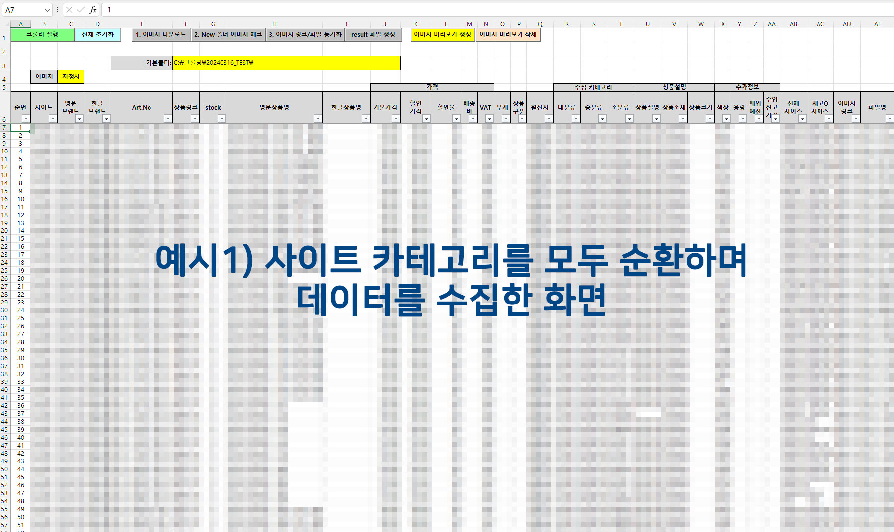 사이트에 있는 이미지를 다운 받고 데이터를 모아서 엑셀에 정리 후 가공하는 업무를 맡고 계신가요?엑셀에 입력된 데이터를 사이트에 입력하는 반복적인 업무를 맡고 계신가요?인터넷으로 작업해야하는 모든 번거로운 업무에서 벗어나세요.모두 자동화할 수 있습니다!10여년간 실무에서 직접 엑셀VBA기반으로 프로그램을 개발하여 직접 사용해왔고,다양한 의뢰를 받아 국내 사이트는 물론, 미국, 유럽 등 다양한 국가의 사이트 크롤러 제작 경험이 있습니다.어렵게 생각하지 마시고 편하게 문의주세요!샘플파일과 함께 필요로 하시는 기능을 설명해주시면 친절히 상담해드립니다 :)제작 가능한 다양한 프로그램 및 기능크롤링이라고 하면 대량의 데이터를 수집해서 엑셀 파일로 저장해주는 형태의 프로그램을 흔히 생각하시지만, 평소 업무에 사용하는 엑셀파일에 인터넷에서 수집한 데이터를 원하는 셀에 입력시키는 형태로도 제작할 수 있습니다.반대로 엑셀에 입력된 데이터를 사이트에 입력하고 이미지를 업로드하는 프로그램도 제작 가능합니다.- 대량 데이터 수집 후 엑셀파일로 생성 & 이미지를 지정한 폴더에 자동 다운로드- 대량 데이터 수집 후 엑셀 함수로 구현하기 어려운 여러 조건을 반영하여 자동 가공- 엑셀에 입력된 데이터를 사이트에 입력 및 이미지 업로드- 사이트 크롤링 후 이미지를 셀에 원하는 크기로 표시하고 데이터를 필요한 형태로 가공/입력- 실시간 환율, 주가, 인터넷 기사 등 다양한 정보 수집 후 필요한 형태로 엑셀 시트에 입력하고, 엑셀 시트를 별도의 파일로 생성하거나, PDF로 생성 후 이메일로 자동발송- 구글번역기를 이용한 한글 번역- 기타 사무자동화와 연계된 기능제작 이력1) 로그인, 무한스크롤, 사이트 내 여러 카테고리의 모든 페이지 등 다양한 조건에서도 크롤링 목적에 맞추어 데이터와 이미지를 수집하고, 필요로 하는 형태로 자동 가공하는 프로그램2) 사이트에 정보를 입력하고 이미지를 업로드 하는 프로그램데이터 수집 뿐만 아니라 데이터 및 이미지를 등록하는 프로그램까지 다양하게 제작해왔으며, 최소 50여개 이상의 웹사이트 크롤러를 제작한 경험이 있습니다.- N사 상품정보 수집 및 가공 프로그램- N사 상품 자동등록(대량/개별) 프로그램- 미국 A사 상품정보 수집 프로그램- 유럽 다수 사이트 상품정보 수집 프로그램- 유럽 현지 배송정보 자동수집 프로그램- 우체국, CJ 배송정보 자동수집 프로그램- 기타 다수 1. 상담상담 진행시 우선적으로 크롤링할 사이트 정보를 전달해주시면 제작 가능여부를 확인해드립니다.(* 사이트에 따라 크롤링이 원천적으로 불가능한 경우가 있습니다.)크롤링이 가능할 경우 결과 '데이터 샘플', '필요로 하시는 프로그램에 대한 구체적인 설명' 정보와 함께, 크롤링 이후에 데이터를 어떻게 가공해서 사용할 계획이신지 설명해주시면 추가할 수 있는 기능에 대해서도 설명해드립니다.수집할 정보의 항목 수가 많고, 항목에 디테일한 가공이 필요한 경우에는 결과 데이터 샘플에 각 조건을 상세하게 기재해주셔야 합니다.통상적으로 구매 시점에 협의되지 않은 기능이 추가로 필요하실 경우 또는 작업이 상당 부분 진행된 상태에서 기능의 변경, 양식의 변경 등을 요청하실 경우 추가비용이 발생할 가능성이 높습니다.1차로 상담을 진행한 후, 원하시는 기능과 데이터에 대해 충분히 검토를 하시고 다시 2차로 상담하여 의뢰하시는 것이 좋습니다.2. 견적 책정 및 결제작업 규모에 따라 견적을 책정한 후 의뢰인께서 결제를 하시면 본격적인 작업을 시작합니다.3. 작업본 피드백통상적으로 피드백 과정은 1~2회 진행됩니다.4. 구매확정 - 크롤링할 사이트 정보- 참고할 수 있는 웹페이지와 해당 웹페이지를 기반으로 작성된 수집결과 데이터 샘플(사이트와 데이터 샘플을 비교하여 참고할 목적입니다.)- 필요로 하는 기능에 대한 구체적인 설명수집할 정보의 항목 수가 많고, 항목에 디테일한 가공이 필요한 경우에는 결과 데이터 샘플에 각 조건을 상세하게 기재해주셔야 합니다.
