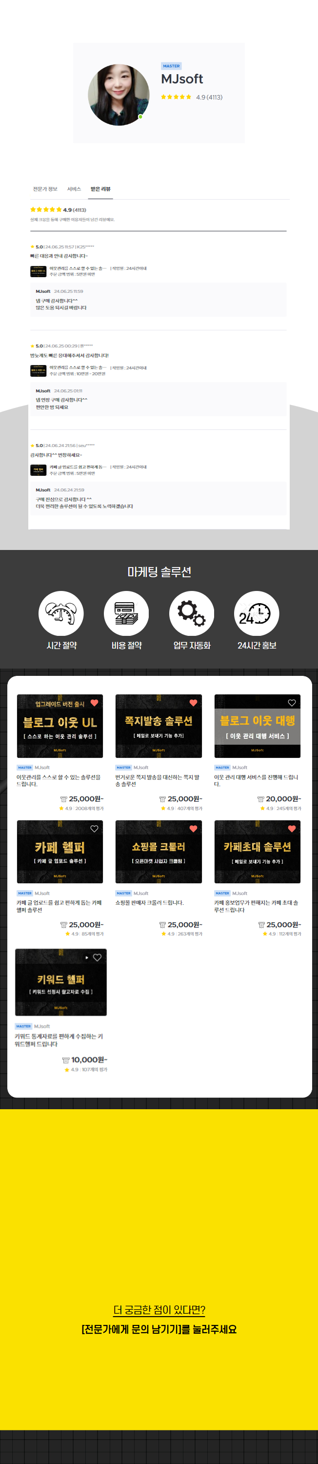 * 해당 서비스는 불법적인 용도로 사용 불가하고 불법적인 용도로 사용하는 경우 책임은 구매자에게 있습니다* 본 서비스는 개인 정보와 연결될 수 있는 DB 제공이 불가합니다. (이름, 개인 번호, 개인 자택 주소 및 이메일 주소 등)=========================================================상품명 [ 카페 게시판 글 데이터 크롤링 솔루션 ]해당 서비스는카페 게시판의 글/ 댓글 관련 작성자 데이터를 모으는 솔루션입니다현재 크롤링 할 해당 카페에 가입이 된 경우에만 데이터를 모을 수 있습니다[주요기능]- 전체게시판 작성 글 수집- 특정게시판 지정하여 작성 글 수집- 원하는 저장 항목과 파일 형식 선택 가능=========================================================사용하시는 기간동안 오류발생시 빠른 대응과 무상 AS를 진행하며변동사항, 개선사항 등 고객의 의견을 반영한기능 업데이트 혜택을 받을 수 있다는 장점이 있습니다* 해당 서비스는 불법적인 용도로 사용 불가하고 불법적인 용도로 사용하는 경우 책임은 구매자에게 있습니다 해당 상품 페이지에서 사용기간을 선택하셔서 구매하시면거래페이지를 통해 솔루션 압축파일을 전달드립니다 해당 솔루션을 이용하기 위해서는 윈도우 운영체제 pc가 필요합니다사양은 윈도우7 이상이면 됩니다