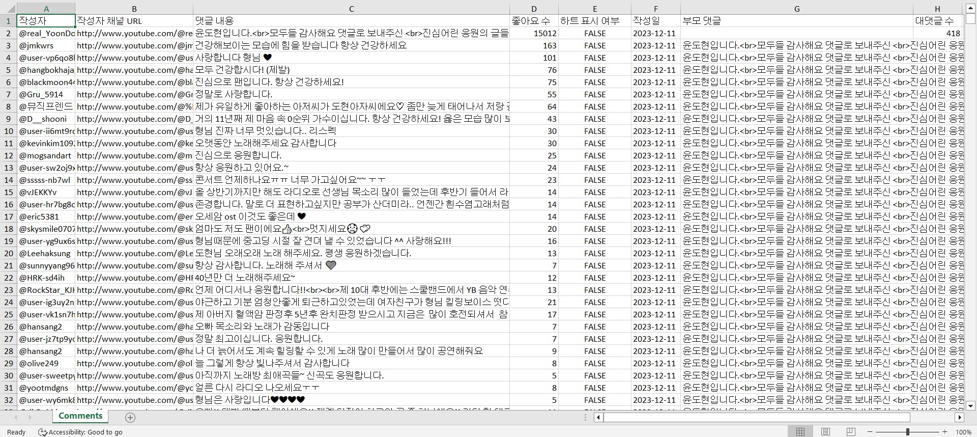 원하는 유튜브 영상 댓글 데이터들을 추출해서 엑셀 파일로 보내드립니다.추출되는 댓글 데이터들은 다음과 같습니다.1. 작성자2. 작성자 채널 Url3. 댓글 내용4. 좋아요 수5. 하트 표시 여부6. 작성일7. 부모댓글 (대댓글인 경우)8. 대댓글 갯수 1) 문의하기로 댓글 데이터 추출을 원하는 유튜브 영상 링크를 알려주세요.2) 추출된 댓글 데이터 엑셀파일을 0~1 일 안에 보내드립니다. 1. 댓글 데이터 추출을 원하는 유뷰트 영상 Url을 보내주세요2. 추출 파일 확장자로 엑셀말고 csv나 tsv를 원하시면 말씀해주세요3. 검색 결과는 기본적으로 "시간" 순으로 정렬됩니다. (다만, pin 되어있는 댓글은 가장 우선순으로 정렬됩니다)