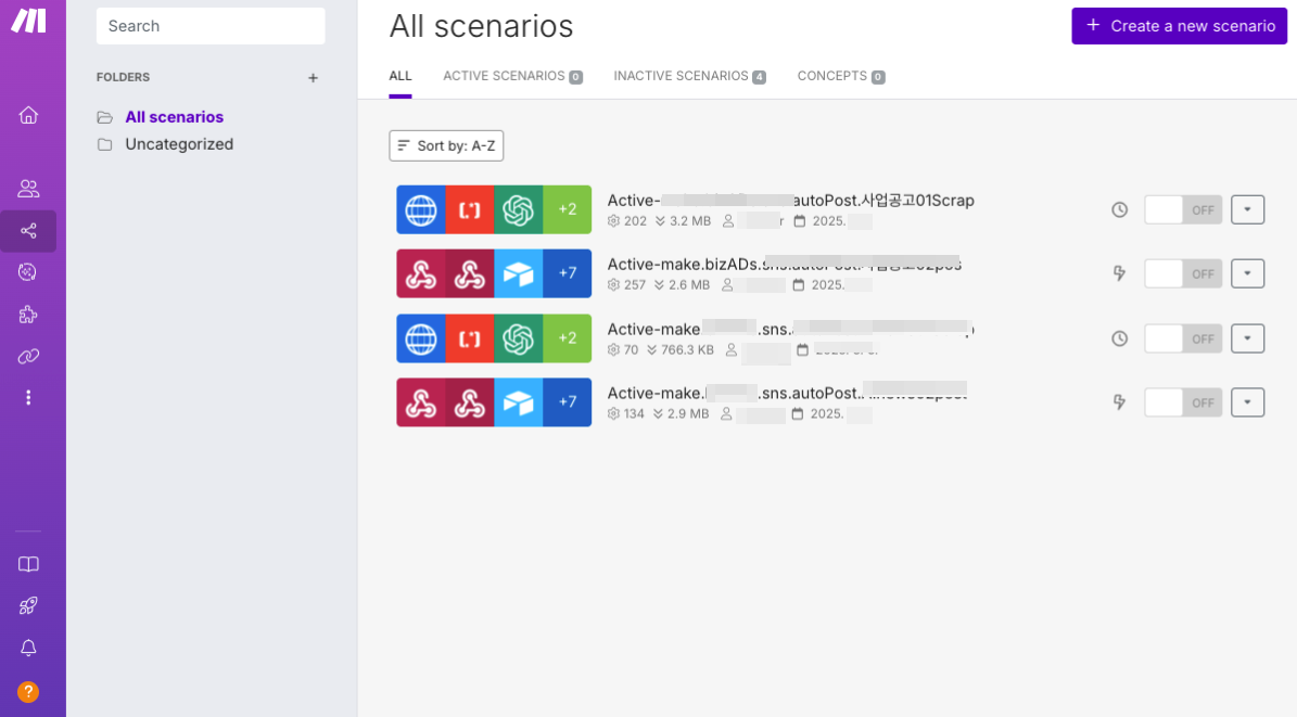 광고대행사 대표님들, 또 매일 똑같은 수동작업 하십니까? 구글스프레드시트 복사 붙여넣기, 리포트 작성, 메일 보내기 지긋지긋하지 않으셨나요? 이젠 파이썬, MAKE 등을 이용한 자동화로 당신에게 자유시간을 더 드리겠습니다. 다른 모든 반복작업도 모두 자동화해보세요! “마케팅은 전략! 반복작업은 자동화로!”마케팅은 전략이어야 합니다. 그런데 매일같이 하시는 일은 이렇지 않으셨나요?매일 수십 개 캠페인 리포트 정리카카오·구글·페이스북 광고 계정 데이터 수작업 다운로드이메일, 슬랙, 노션, 구글드라이브 옮겨 붙이기SNS 글올리기잊지 말아야 할 예약 발송 타이밍 체크이게 광고업입니까, 아니면 엑셀+복붙 전문 노동자입니까? 저희가 제공하는 자동화 서비스는 이렇습니다! 사용 도구:Python: 크롤링, API 연동, 엑셀 자동화, PDF 리포트 생성 1. 요구사항 전달/검토2. 개발계획 협의/확정3. 선결제후 작업시작4. 개발산출물 검수/수정5. 작업종료/구매확정 1. 요구사항을 정리한 내용(배경/필요성/요구기능/주의사항 등)2. 서비스기획/개발에 참고할만한 샘플/사이트 등 정보