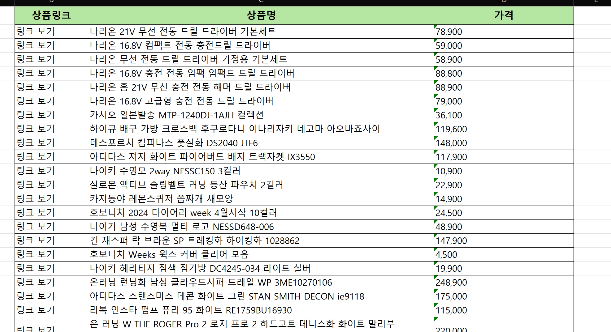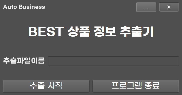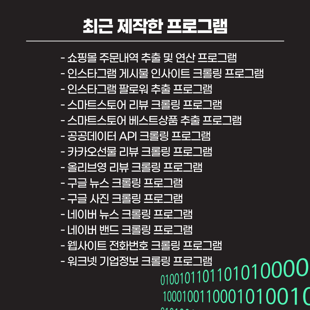 사이트 돌아다니면서 데이터 수집하기 힘드시죠??이젠, 자동화하세요!쇼핑몰 데이터, 상품 리뷰, sns 게시글 등....저도 개인사업자이기에, 웹 사이트에서 필요한 데이터를 자주 수집했습니다.저는 하루에 2시간씩 이 업무들을 반복했고, 손목과 눈이 따끔거렸습니다.하지만, 이제 저는 프로그램에게 이 일을 맡기고, 그 시간에 다른 업무를 합니다.프로그램은 2시간 걸리는 일을 5분이면 자동으로 끝냈고, 실수 없이 정확했습니다.덕분에 업무 생산성도 크게 오르고, 제 건강도 지킬 수 있었습니다.여러분도 이제 데이터 수집은 프로그램에게 맡기세요!최선을 다해서 제작해드리겠습니다.프로그램을 제작하고 싶으신데,원하는 기능을 잘 만들 수 있을까 걱정되시나요?프로그램이 제대로 동작하지 않을까 불안하신가요?저희 오토비지니스는 의뢰자님이 원하시는 기능을 100% 반영하기 위해서자세한 상담을 진행하고, 프로그램을 제작합니다.또한, 안정적으로 프로그램이 동작할 수 있도록 오류처리에 신경을 써서 제작해드립니다.시간이 흘러, 웹 사이트의 구조가 변경되는 이유로 프로그램이 동작하지 않을 경우,약간의 비용으로 프로그램을 고쳐드립니다.요즘 프로그램이나 소스코드 하나만 툭 던져넣고 도망가는 개발자들이 많습니다.저희 오토비지니스는 끝까지 책임지고 프로그램을 제작해드립니다.모조품은 금방 망가지지만, 명품은 오래갑니다.오래도록 편안하게 사용할 수 있는 프로그램을 제작해드리겠습니다.지금 상담 주세요. [최근에 제작한 프로그램들]- 네이버 자동완성 키워드 수집 프로그램네이버 검색창에서 원하는 키워드로 검색했을 때 나오는 자동완성 키워드 (키워드 + 'ㄱ' ~ 'ㅎ')를 모두 수집해서 엑셀파일 혹은 메모장에 자동으로 저장하는 프로그램ex) 망고 => 망고 갈변, 망고 냉장보관, 망고 다이어트....- 쇼핑몰 판매내역 데이터 수집 프로그램Nuskin 이라는 사이트의 판매와 관련된 정보(상품별 매출액, 판매 개수 등)를 추출하여 엑셀파일에 자동으로 저장하는 프로그램- 쇼핑몰 리뷰 수집 프로그램 (사진 포함)네이버 스토어, 카카오선물, 올리브영 사이트에서 상품들의 리뷰 정보 (리뷰내용, 별점, 작성시간 등)와 리뷰 사진을 수집하여 엑셀파일에 자동으로 저장하는 프로그램- 인스타그램 게시물 인사이트 정보 수집 프로그램인스타그램 게시물의 댓글, 인사이트 정보 (공감, 댓글 수, 공유 수, 조회 수 등)를 자동으로 수집하여 엑셀파일에 저장하는 프로그램- 쿠팡 상품정보 추출 및 엑셀 정리 프로그램쿠팡에서 원하는 키워드로 검색한 상품명, 가격, 링크 등의 정보를 수집하여 엑셀 파일에 자동으로 저장하는 프로그램- 구글, 네이버 뉴스기사 정보 추출 및 정리구글, 네이버 뉴스에서 원하는 키워드로 검색해서 나온 뉴스기사의 제목과 링크를 수집하여 자동으로 엑셀 파일에 저장해주는 프로그램- RISS 논문 사이트 정보 수집 및 엑셀 정리 프로그램원하는 키워드로 검색해서 나온 논문들의 제목, 저자, 주석, 일자 등의 정보를 수집하여 엑셀 파일에 자동으로 저장하는 프로그램- 뮤직카우 음원 사이트 정보 수집 및 엑셀 정리 프로그램뮤직카우라는 음원 사이트에서 가수, 제목, 현재가 등의 정보를 수집하여 엑셀 파일에 자동으로 저장하는 프로그램- 네이버 쇼핑 상품정보 수집 및 엑셀 정리 프로그램네이버 쇼핑에서 원하는 키워드로 검색해서 나오는 상품들의 상품명, 가격, 링크 등의 정보를 수집하여 엑셀파일에 자동으로 저장하는 프로그램- 네이버 자동차 정보 추출 프로그램네이버 자동차 검색의 설정에 따라 자동차의 가격, 출시연월 등의 정보를 수집하여 엑셀파일에 자동으로 저장하는 프로그램- 메일 자동 발송 프로그램엑셀파일에 저장된 사람들에게 원하는 메세지의 메일을 자동으로 한 번에 보내는 프로그램- 네이버 블로그 이웃추가 자동화 프로그램네이버 블로그 검색창에서 원하는 키워드로 검색했을 때 나오는 신규 글을 작성한 블로그들에게 원하는 메세지로, 원하는 수만큼 자동으로 서로이웃추가하는 프로그램- 네이버 블로그 이웃 글 공감 자동화 프로그램네이버 블로그의 이웃의 새글에 원하는 개수만큼 공감을 자동으로 눌러주는 프로그램- 운세사이트 5개 정보 추출 및 엑셀 정리 프로그램운세 사이트 5개에서 오늘의 운세 정보를 추출 후, 엑셀 파일에 각 사이트마다 따로 정리하는 프로그램- 엑셀 데이터 정리 자동화대량의 엑셀 데이터를 원하는 형식대로 변형 및 정리를 자동화합니다. 1. 메세지로 수집하고 싶은 데이터와 사이트에 대해서 자세하게 알려주세요. 링크를 같이 보내주시면 더욱 좋습니다.2. 상담을 통해 가격을 알려드립니다.3. 결제를 하시면, 프로그램 제작이 시작됩니다.4. 프로그램이 제작되면, 프로그램과 사용설명서를 받습니다.5. 간단한 수정 1회를 통해 프로그램을 완성합니다. 크롤링에 필요한 사이트의 링크주소를 같이 보내주시면 좋습니다.데이터를 저장할 때 원하시는 엑셀파일 양식이 있다면, 양식파일을 같이 보내주시면 좋습니다.