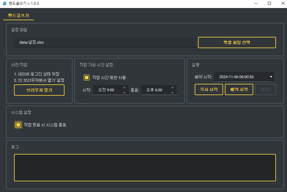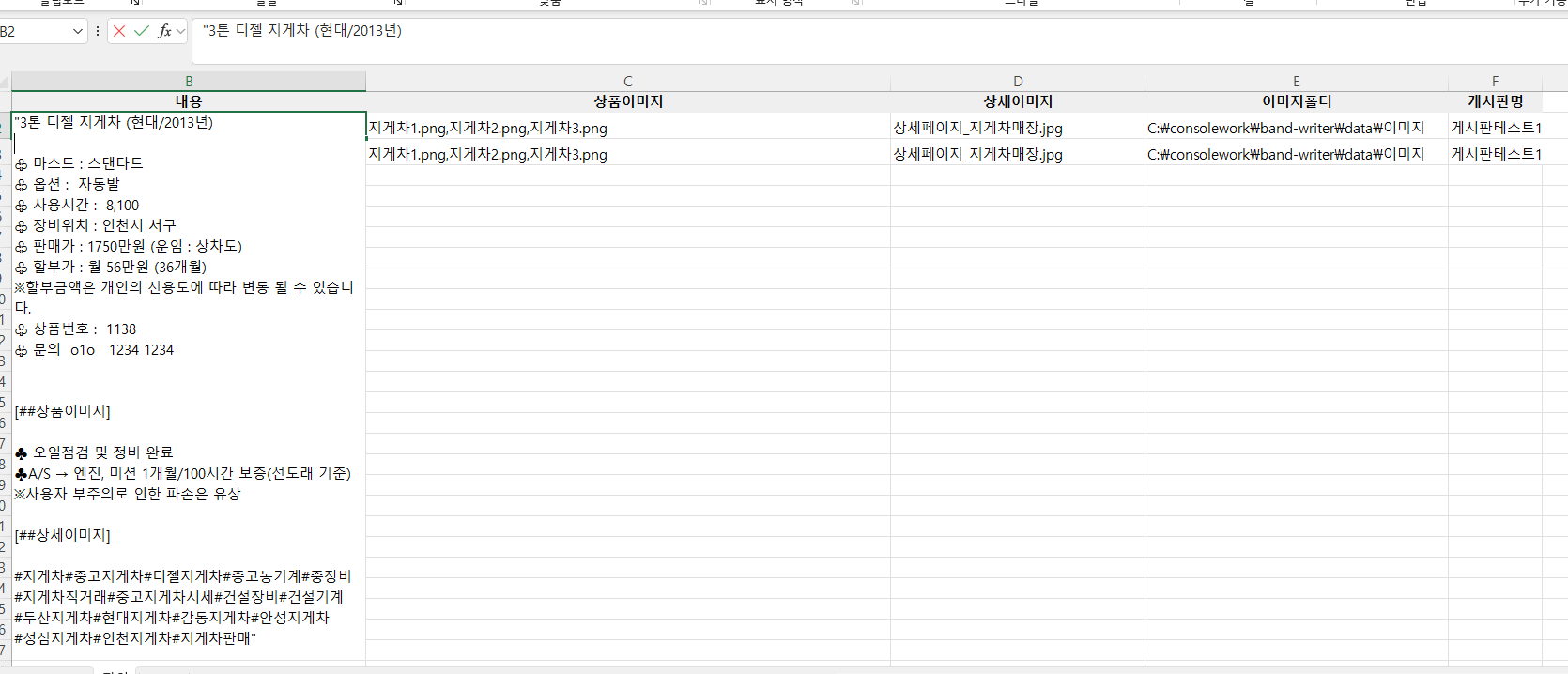 밴드 자동 글 등록 프로그램1. 엑셀에 지정한 정보로 밴드에 등록하는 프로그램입니다.2. 특정문구에 글씨크기, 글씨색상 조정 가능합니다.3. 이미지 업로드 가능합니다.4. 게시판 설정 가능합니다.제작자 소개안녕하세요 주식회사 콘솔워크 대표 김범관입니다.서비스를 클릭해주셔서 감사합니다.RPA란 업무자동화를 의미합니다.컴퓨터로 하시는 모든 반복적인 작업들은 모두 자동화가 가능합니다.지식이 없으시더라도 간단히 문의주시는 것만으로도 저는 큰 도움이 됩니다.편하게 연락주세요.짧게 제 소개를 하겠습니다.저는 지난 5년 동안 180개가 넘는 자동화 프로그램을 만들어왔습니다.어느것 하나 허투루 만든 것이 없다고 자부합니다.저는 고객과 함께 호흡하면서 완성도 있는 결과물을 만드는 것을 선호합니다.그래서 작업 시작 전에 고객의 요구사항을 정확하게 여쭤봅니다.고객에게 도움이 되지 않는 프로그램이라면 절대 만들지 않습니다.회사가 돈을 버는 것도 물론 중요하지만고객에게 도움이 되어야 결국 장기적으로 좋기 때문입니다.그렇기 때문에 저희 서비스 리뷰를 보시면 후기가 좋습니다.왜냐하면 도움이 되실 때까지 여쭤보고 끝까지 책임지고 작업해드리기 때문입니다.현재까지 작업한 프로젝트 목록- part1 등록 -1. N사 밴드 글 자동등록 프로그램2. N사 카페 글 자동등록 프로그램3. N사 카페 댓글글 자동등록 프로그램3. N사 포스트 글 자동등록 프로그램4. N사 블로그 글 자동등록 프로그램5. N사 블로그 댓글 + 공감 + 스티커 등록 프로그램6. N사 쇼핑 상품 자동등록 프로그램 (수동 + API 둘다)7. N사 쇼핑 상품 수정등록 프로그램 (수동 + API 둘다 )8. 나라장터 물품 등록 프로그램 (공인인증서 로그인)9. 다음콘텐츠 자동등록 프로그램10. 매직빌 세금계산서 자동발행 프로그램11. 번개장터, 옥션, 중고나라 게시글 자동등록 프로그램12. 옥션 상품 재등록 프로그램13. 브런치 글 자동등록 프로그램14. N사 쇼핑 상품 대량 복사 프로그램15. N사 쇼핑 대량 이동 프로그램 (신규 스토어로 상품전체 이동)16. 워드프레스 글 자동등록 프로그램17. 아웃룩 데이터 추출 자동화18. 트위터 자동등록19. 페이스북 자동등록20. 포털 톡톡 자동발송- part2 크롤링(데이터 수집) -1. N사 블로그 ID 추출 프로그램 (인플루언서 추출)2. 인스타 ID 추출 프로그램3. N사 쇼핑 상품 수집 프로그램4. N사 쇼핑 키워드 발굴 프로그램5. N사 쇼핑 댓글 수집6. 각종 쇼핑몰 상품 수집 (크림, k2 등 다수)7. 다음 콘텐츠 수집8. 구글 이미지 수집9. N사 부동산 매물 수집10. 다음 콘텐츠 수집11. 쿠팡 상품 수집12. 쿠팡 리뷰 수집13. 나라장터 데이터 수집14. 오픈마켓 송장수집(G마켓, 옥션, N사, 쿠팡, 티몬, 인터파크 등 오픈마켓 11개)15. 에누리 가격 수집16. 올리브영 상품 수집17. 오픈마켓, 각종 관리자 사이트 주문수집(배달의민족, 티몬, 토스 등 12개)18. 코스트코 상품 수집19. 티스토리 추출 프로그램20. 카카오 비지니스 채널 채팅방 자료 추출 자동화21. 라쿠텐, 아마존 영수증 수집 프로그램22. 유니패스 화물관리 번호 기반 품명 수집 프로그램23. 디스코 자료 조회 프로그램24. 나라장터 공고수집- part3 자동발주 또는 알림 (API 활용) -1. 떠나요 입퇴실 안내 알림톡 자동발송 프로그램2. 우커머스 API 주문 자동화 + 알림톡 발송3. 네이버 커머스 API 주문 자동화 + 알림톡 발송4. CJ 택배 API 연동 자동화5. 플레이오토 API 연동- part4 기타-1. pdf 데이터 추출(생활기록부, 사업자등록증, 원천징수부 등)2. 고객관리 프로그램3. 재고관리 프로그램4. 키움증권 주식매매 자동화 프로그램5. 글 대량 치환 프로그램6. 최저가 설정 프로그램 (N사 카달로그 최저가 설정)7. 스마트플레이스+스페이스클라우드 예약 동기화8. 안드로이드 휴대폰 테더링 IP 변경 자동화9. CHATGPT, 클로드 연동 자동화10. APP SCRIPT 기반 CRUD 프로그램 작업11. 구글스프레드시트 자동화12. 이지어드민 자동화13. 이미지 조합 프로그램14. 이미지 대량 누끼 제거프로그램15. 유튜브 자동화 프로그램 (다운로드 + 업로드)@Client함께 호흡한 고객들 (150개 회사+)- 스파클 주식회사 (국내 상위 생수 업체)- 케이디디아이코리아 (일본계열 대형통신사)- 복산나이스 (연매출 1조 기업)- 코코블랑- 카플- 대한출판문화협회- 코스코엠알로- 상도- 동인 1. 프로그램 구매2. 결제 확인 후 프로그램 실행 프로그램 제공3. 서비스 이용기타 문의사항은 판매자에게 연락 해 주세요. 밴드글쓰기에 필요한 내용을 구체적으로 설명해주세요.기존 프로그램에서 원하시는 내용 일부 수정 가능합니다.수정하실 내용이 많을 경우 추가 비용이 발생되실 수 있습니다.