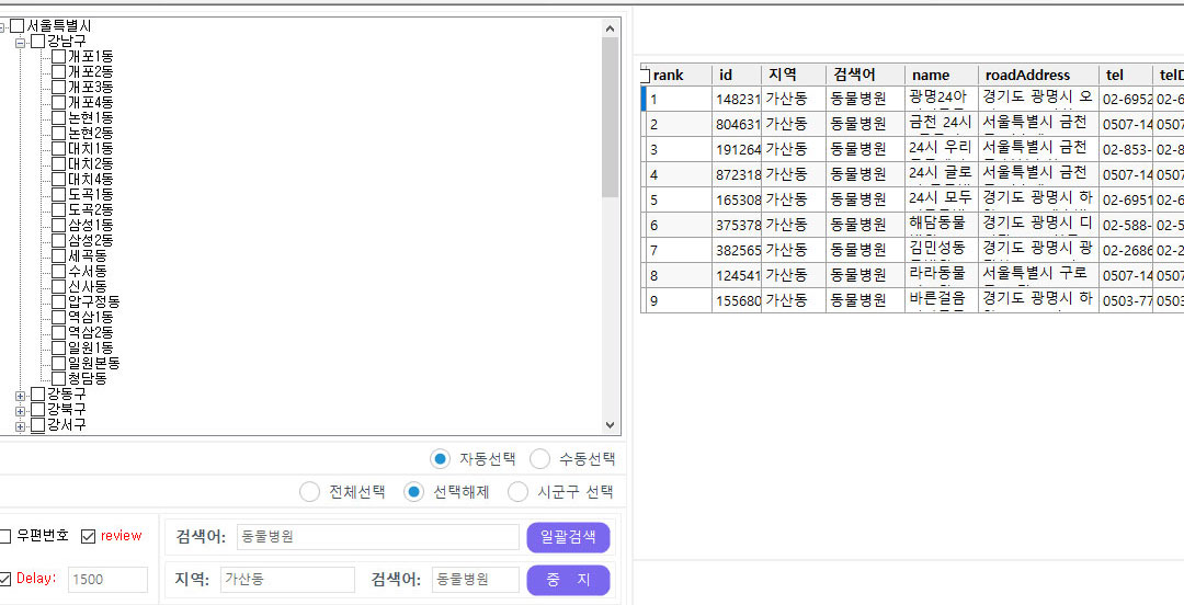 1. 전국 동단위 까지 선택 추출네이버 플레이스 검색 결과는 "지역 + 검색어"로 검색한 결과가 나옵니다.따라서 원하는 행정구역을 선택하여 결과를 추출합니다.상호, 주소, 일반번호, 핸드폰번호, 0507번호, 리뷰수, 등록일, 우편번호2.우편번호, 핸드폰 추출설정 옵션 선택으로 우편번호와 핸드폰 번호를 추가적으로 추출 할 수 있습니다.핸드폰 번호는 등록한 업체만 추출합니다.3.업체등록일 및 새로오픈 추출업체등록일은 전체 정보가 수정됐을때에는 부정확합니다.특정 정보 등록일을 기준으로 업체등록일을 추정했습니다.식당 처럼 새로오픈 카테고리가 있는 키워드는 새로오픈으로 추출 합니다.-데이타는 엑셀 cvs 파일로 저장할 수 있고 mdb로 관리 됩니다. 1. 크몽에서 결제(한달 사용료)2.프로그램 설치 안내 및 사용 방법 안내3.한 달 사용 후 연장 여부 결정 윈도우 환경에서 구동하는 프로그램 입니다.윈도우10을 권장 드립니다.윈도우11에서도 문제 없이 동작합니다.프로그램 실행이 정상적으로 되지 않을때대부분은 윈도우 자체 문제인 경우가 많습니다.브랜드 제조사에서 설치해준 윈도우에서 발생한 적이 있습니다.일반 버전의 윈도우로 재설치하면 문제가 발생하지 않습니다.