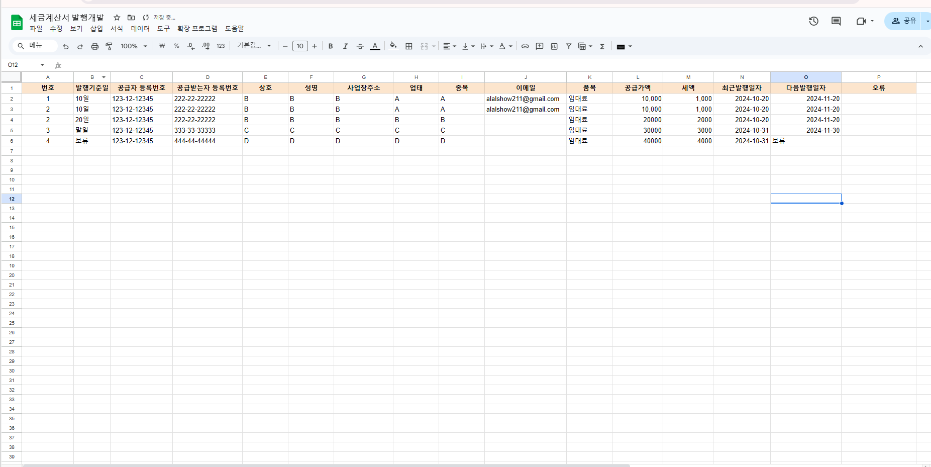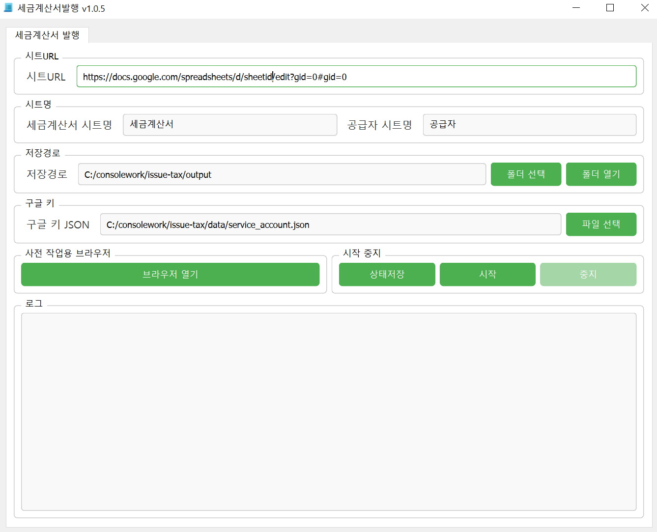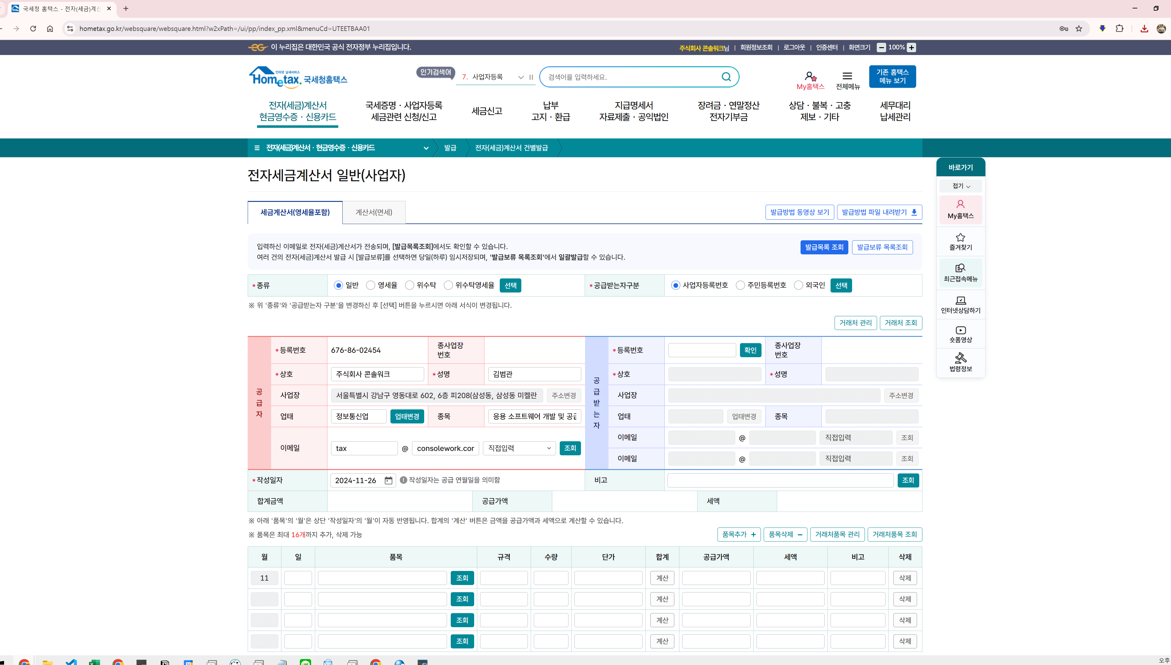 세금계산서 자동발행 프로그램1. 웹사이트, 스프레드시트, 엑셀 등에서 계정정보, 보안카드번호, 발급일, 발급내용 등 원본 데이터를 가져옵니다.2. 계정정보와 보안카드 번호를 입력하여 홈택스에 로그인 합니다.3. 세금계산서 건별 발급 메뉴에 들어갑니다.4. 발행정보를 입력합니다.5. 보안카드 번호를 입력하여 발급합니다.6. 발급된 세금계산서를 PDF로 저장합니다.7. 원본데이터에 발급 내용을 반영합니다. 구매 상담 및 구입 안내구매를 원하시면 편하게 상담해 주세요. 구입 절차에 대해 자세히 안내드립니다.프로그램 세팅 및 사용 가이드 제공제공된 정보를 바탕으로 프로그램을 설정하고 사용하는 방법에 대해 자세한 가이드를 드립니다. 처음 사용하시는 분들도 쉽게 따라 하실 수 있습니다.추가 문의 및 도움 요청사용 중 도움이 필요하시거나 궁금한 점이 생기면 언제든지 편하게 연락 주세요.최선을 다해 도와드리겠습니다! 자동화에 필요한 내용을 구체적으로 설명해주세요.기존 프로그램에서 원하시는 내용 일부 수정 가능합니다.수정하실 내용이 많을 경우 추가 비용이 발생되실 수 있습니다.