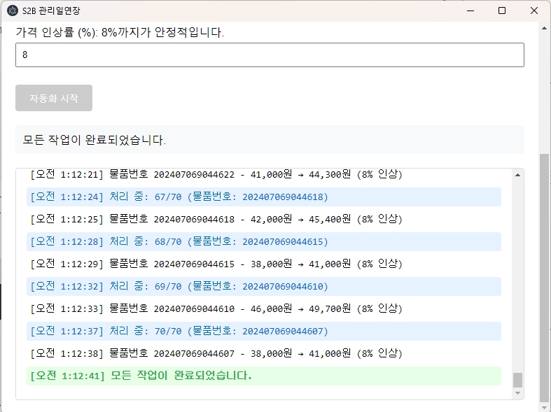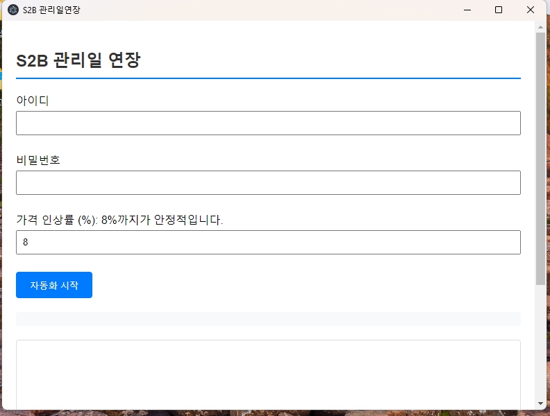 ※학교장터 관리일 연장 자동화 봇 최적화 버전※관리일 연장하면서가격 인상 됩니다!!!8%상승 까지가 안정적이어서 8% 상승까지 가능하게 해두었습니다직접 학교작터를 쇼핑몰을 운영하면서누구보다 완벽하게 잘 만들었습니다.무한 업데이트 1년 A/S어느 프로그램과 비교해도 좋습니다!!--업로드 프로그램, 상품 개발 프로그램 문의 환영--가격도 최저가로 사장님들께 도움이 되기 위해노력하고 있습니다.1.스탠다드 학교장터 사업자 1개-- 학교장터 계정이 하나 밖에 없는데, 더 많은 금액을 주고 사용하기 아까우신 분들을 위해 준비했습니다. 2.디럭스 학교장터 사업자 2~3개-- 학교장터 사업장을 여러개 가지고 계신분들께 적합 합니다.3.프리미엄 학교장터 사업자 계정등록 무제한-- 학교장터 사업장을 3개 이상 가지고 계신분들께 적합 합니다. /재판매 하시는 분들은 따로 문의주세요. 재판매분들은 업데이트 제공을 해드리지 않습니다.----------Q : 지금은 한개만 운영하기위해 스탠다드를 구입하고 후에 계정 추가를 하면 추가비용만큼만 내도 되나요?A: 네, 스탠다드와 디럭스 가격차이 혹은 스탠다드와 프리미엄 가격차이 만큼만 지불하셔도 됩니다.Q:저는 컴퓨터를 잘 만질줄 모르는데 사용 할수 있을까요?A:작동방법이 매우 쉽지만, 작동방법이 어렵다고 하시면 원격으로 지원을 해드리고 있습니다. 천천히 따라 하면서 할수 있도록 설명서도 같이 제공해 드립니다!Q:다른 컴퓨터에서 사용할수 있을까요? pc에 먼저 설치하고 나중에 노트북에 설치하게요!A:저희는 1pc 1프로그램 원칙 그런거 없습니다! 계정 설정을 따로 하기 때문에 어느 pc에서든 사용하실수 있도록 준비했습니다.Q:홈페이지가 수정이 되거나 정책이 바뀌면 유지보수 비용을 내야하나요?A:저희는 1년 동안 a/s비용이 무료이며, 만약 업그레이드가 과도하게 발생 될 경우 대표님들의 부담을 최소화 하기위해 노력하겠습니다!--------저는 제가 더 편하게 작업하고,라이프 인생을 살기 위해서 더 더욱 편리하게 프로그램을 만들었습니다. 다른 개발자들은 그런거 모릅니다. 그렇기 때문에 제가 만들고 이 프로그램을 공유함으로써 최소한의 비용을 받고 제공해드리려고 노력합니다 1.설명서가 동봉된 사이트를 드립니다! (크몽 발송)2.프로그램 설치파일을 제공해 드립니다. (크몽 발송)3.자동연장에 필요한 기본적인 설명을 드립니다.(크몽 발송) 스탠다드,디럭스 상품 이용하시는 분들께서는 '학교장터 계정의 id'만 알려주시면 됩니다등록 후, 발송해드립니다.