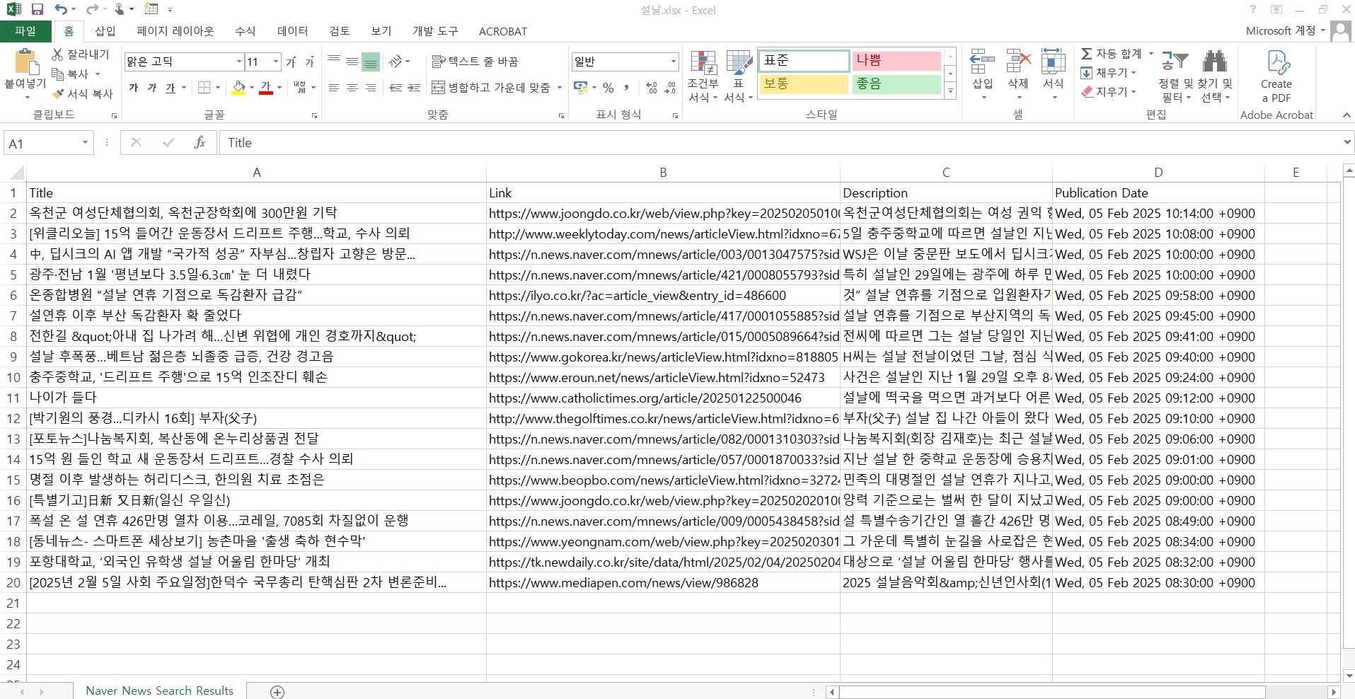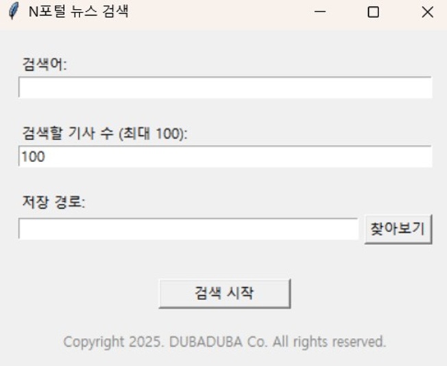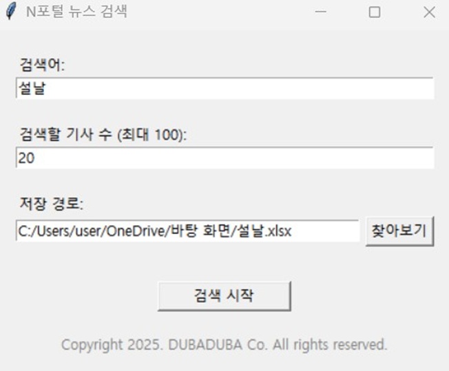 1. 누구라도 쉽게 사용할 수 있는 N포털 뉴스 추출 프로그램입니다.(되도록 간결하게 제작하였으며 실행 파일 형태로 보내드립니다. 별도 설치 x)2. 원하시는 검색 키워드로 최대 100건까지 기사 추출이 가능합니다.(엑셀 컬럼 분류: 타이틀, 링크, 내용 요약, 날짜)3. 프로그램 상의 오류는 말씀주시면 무상으로 수정해드립니다.(기능을 추가하거나 추출 데이터 세팅 등의 수정을 원하시면 요청 주세요)※ 해당 자료의 저작권은 해당 서비스의 전문가에게 있습니다. 엑셀로 데이터가 저장되므로 PC에 엑셀 프로그램이 설치되어 있어야 합니다. 1. 원하시는 상품을 결제합니다.2. 크몽을 통해 결과물을 제공받습니다.3. 작동 테스트를 합니다.4. 최종 구매확정을 합니다.5. 리뷰와 피드백 적극 환영합니다. 무엇이든 남겨 주세요 크몽 채팅을 통해 요청사항 남겨주시면 신속히 답변 도와드립니다.기능 추가나 리스트 결과물 작업도 의뢰 가능합니다.