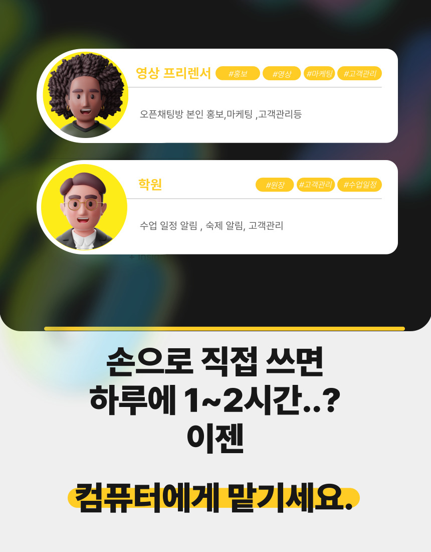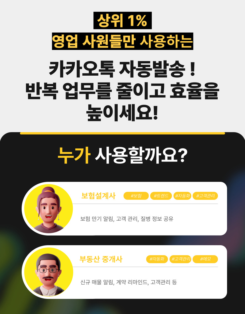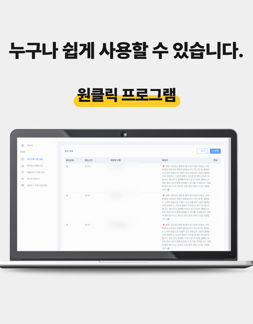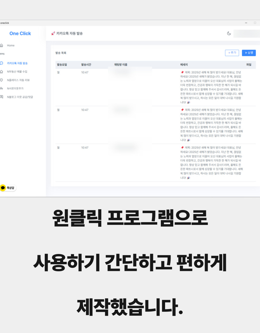 카카오톡 자동 발송기를 소개합니다.1. 카톡 보낼 대화방 목록을 미리 입력해두고2. 보낼 메세지를 입력해두고3. 몇 분에 한 번씩 보낼지 설정하고4. 전송 실행 누르면 끝이제 정해진 시간마다입력한 카톡방에 메세지를 보냅니다.언제까지 보내냐구요??365일 24시간 내내 보냅니다.이상한 마케팅업체에 수십,수백만원 쓰고도효과 못보신 분들그냥 이걸로 여러 단톡방에 홍보하세요블로그, 인스타, 쇼핑몰 조회수 팍팍 올라갑니다.하루 1시간 X 시급 1만원 X 1년 365일 1년에 365만원 절약하세요지금 바로 결제하고홍보를 시작하세요그게 돈을 버는 방법입니다. 상담,결제 완료 후 연락을 통해서 프로그램 다운로드 자료와 설명서를 보내드립니다.추가 문의 있으신분들은 문의 바랍니다. 준비 물품 : 노트북 or 컴퓨터 (윈도우 전용)프로그램 설치를 위해서는 윈도우 전용 컴퓨터가 필요합니다.