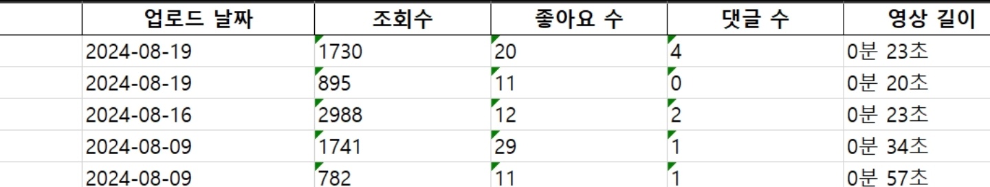 유튜브 채널 영상 데이터 추출 숏폼,롱폼 구분 엑셀