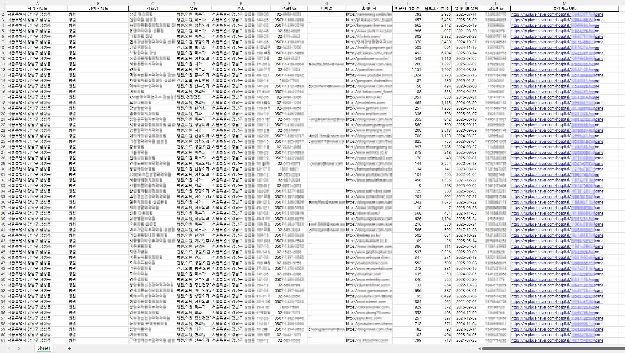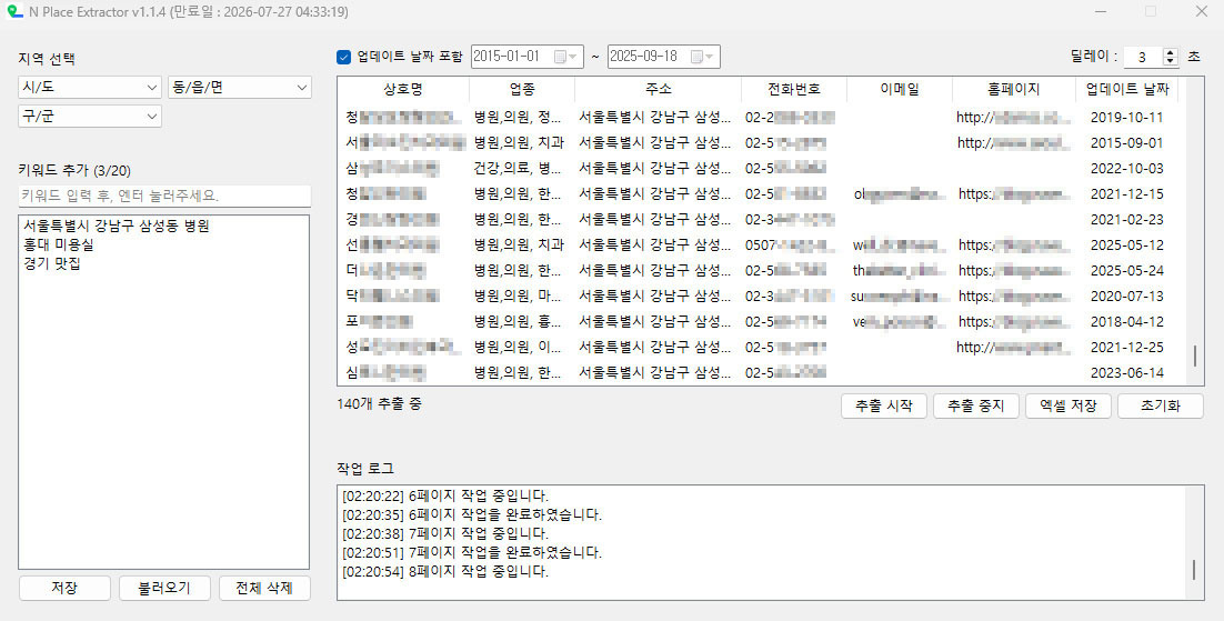 N사 플레이스 지도 사업자 DB 추출 프로그램특정 행정구역을 선택해, 플레이스 지도에 등록된 전국 업체 DB를 추출할 수 있습니다.브라우저를 사용하지 않아 다른 작업과 병행이 가능하며,등록일 조건을 설정하면 선택한 기간 내 최신 등록된 업체 정보만 선별 추출할 수 있습니다.추출된 데이터는 순위, 지역, 업종, 등록일 기준으로 정렬할 수 있으며,엑셀 파일로 저장해 마케팅, 영업, 상권 분석 등 다양한 목적에 유용하게 활용할 수 있습니다.추출 항목키워드 / 상호명 / 업종 / 업체 주소 / 0507 안심번호 / 업체 이메일 / 홈페이지 URL / 방문자 리뷰 수 / 블로그 리뷰 수 / 업데이트 날짜 / 고유번호 / 플레이스 URL추출 옵션업데이트 날짜 : 플레이스에 등록된 업체의 최신 등록일을 확인할 수 있습니다.프로그램 사용 방법1. 행정구역 선택 (ex: 서울특별시, 강남구, ~동)2. 키워드 입력 (ex: 맛집, 병원, 펜션) 및 TXT 파일 불러오기3. 작업 시작4. 작업 완료 후, 엑셀 저장 클릭으로 결과 확인유의사항- 플레이스 지도에서 제공하는 데이터는 키워드당 최대 300개입니다.- 하나의 지역만 검색해도 지역에 따라 주변 지역 데이터까지 함께 추출될 수 있습니다.- 데이터는 중복 제거 후 엑셀 파일로 저장되며, 실제 데이터와 차이가 있을 수 있습니다.※ 프로그램 업데이트는 지속적으로 제공됩니다. 1. 원하는 상품을 고른 뒤, "문의하기"를 눌러 상담을 진행해 주세요.2. 결제 완료 시 설치 파일(이용권 코드 포함)을 제공해드립니다.3. 원격 지원이 필요하시면 도와드립니다. - 프로그램은 윈도우 10 또는 11에서만 사용 가능합니다. (Mac 사용 불가)- 원격 지원이 필요하신 경우, Anydesk를 미리 설치해 주세요.- 최신 PC에서 실행하실 것을 권장합니다.