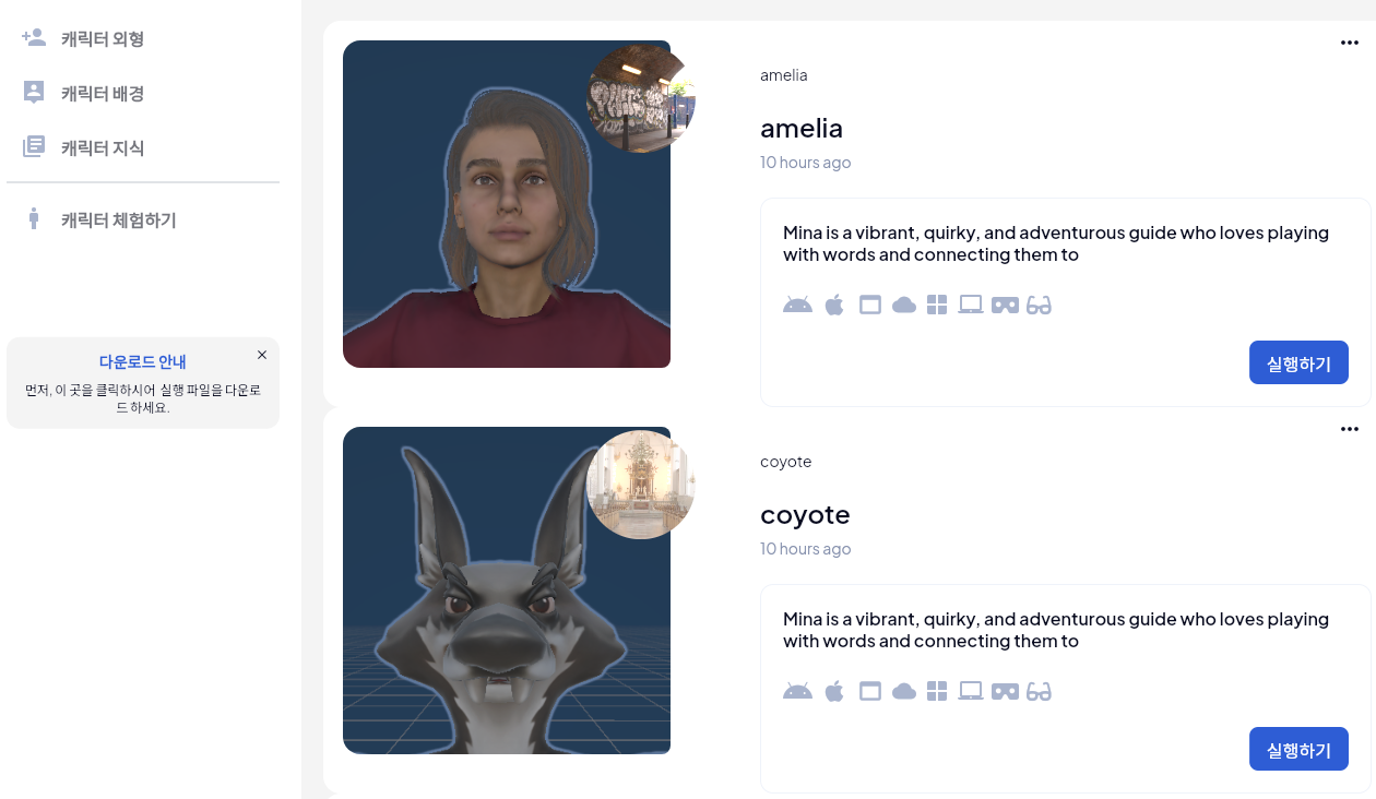 안녕하세요 이제는 AI 음성 대화를 넘어, 리얼한 3D 캐릭터와 음성 대화도 가능합니다. 전시회 및 부스, 이벤트, 고객 센터, 브랜드홍보 등 가상 도우미를 어떤 활용에서든 필요에 맞게 구현해드립니다. 국내에는 아직 초기이지만, 해외에서는 이미 많은 회사들에서 가상 도우미를 활용하고 있으십니다. * 상세 내용고퀄리티의 캐릭터 제작 뿐만 아니라 사진 몇 장으로 자신 혹은 원하는 인물을 복제하고목소리까지 복제하여 디지털 환경에서 생성할 수 있습니다.캐릭터 제작은 인물 뿐만 아니라 동물, 가상 캐릭터 등 모두 가능하며,캐주얼하게도, 아주 실사와 같이 정교하게도 제작 가능합니다.혹시 캐릭터 제작비가 부담되시는 분들에게는 이미 만들어진 3D 아바타를 저렴한 월구독(99,000원)으로 체험 및 영업/행사/홍보에 활용하실 수 있습니다. * 서비스 장점 및 특장점 1. 캐릭터를 구성하는 모든 설정이 가능 배경 스토리 - 장기기억 - 다국어 지원 - 지식 기반 - 내러티브 디자인 - 마음 상태(감정) - 성격 및 스타일2. 웹, 안드로이드/IOS 앱,VR/AR/MR 등 모든 플랫폼에서 제작 가능3. 최신의, 다양한 LLM을 지원( chatgpt, claude, gemeni, 라마 등 ) 4. 캐릭터 설정은 스스로 변경이 가능하시고, 캐릭터 변경 및 재사용도 가능5. 플랫폼 월/연간 이용요금으로 초기 비용을 절약하실 수 있습니다. 전시회 및 부스, 이벤트, 고객 센터, 브랜드홍보 등 다양한 영역에서 최신 기술을 시연하여 경쟁사보다 한 발 앞서나가시기 바랍니다. 기타 궁금하신 내용은 언제든 문의주세요. 1차 상담을 기반으로 원하시는 캐릭터 및 서비스에 대한 정의 및 클라이언트께 설명-> 클라이언트의 상세 요구 사항(필요한 경우 캐릭터 참조 이미지 혹은 파일 전달 받음)에 따른 견적 산출 -> 결제 -> 1차 결과물 -> 필요할 경우 중간 수정 -> 최종 결과물 -> 구매 확정- 스탠다드캐릭터의 배경 스토리 + 지식 베이스 디럭스실제 인물의 아바타를 만드실 경우 얼굴 및 헤드 사진 필요프리미엄커스텀 아바타 제작시 참조 이미지/영상 혹은 설명 필요