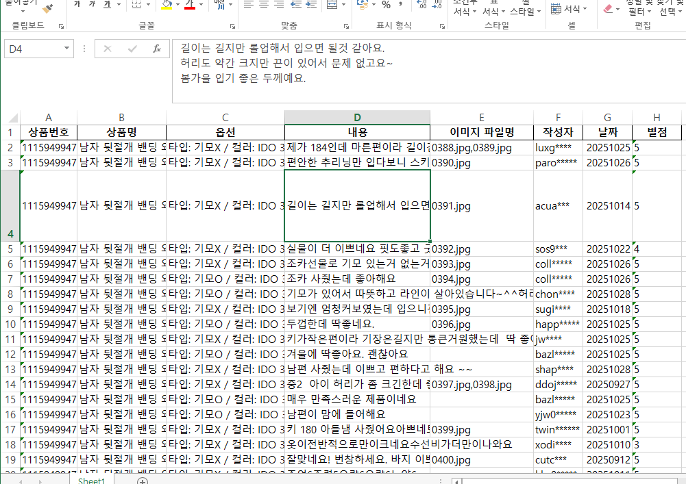 이 프로그램은 N사 스마트스토어 리뷰를 수집하여 엑셀로 저장하는 프로그램입니다.스토어 링크만 있으면 됩니다.1. 상품명2. 옵션3. 리뷰내용4. 이미지 리뷰 파일명(다운로드도 가능)5. 작성자6. 날짜7. 별점이용방법-랭킹순 : 추출할 리뷰개수를 입력(0은 무제한)-최신순 : 날짜를 입력하면 오늘부터 해당 날짜까지 추출(0은 무제한)한번 구입하시면 쇼핑몰 구조가 달라져도 계속 주기적으로 프로그램을업데이트 합니다( 2025/11/1 작동 확인 완료! )피드백, 개선 사항, 추가했으면 하는 기능들을 말씀해주시면 추후 제작하는 프로그램에 반영하도록 하겠습니다. 감사합니다. 피드백, 개선 사항, 추가했으면 하는 기능들을 말씀해주시면 추후 제작하는 프로그램에 반영하도록 하겠습니다 별도의 준비사항은 없습니다. 쇼핑몰 링크만 준비하시면 됩니다.결제 후 이메일을 통해 실행 파일을 전송해 드리고 있습니다