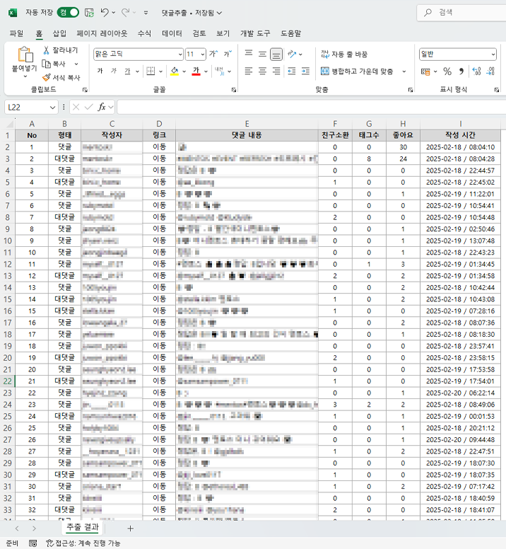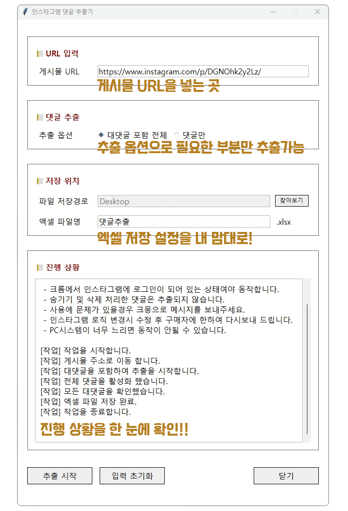 본 프로그램은? 인스타그램 댓글을 자동으로 추출하여엑셀(.xlsx) 파일로 저장할 수 있는 강력한 프로그램 이에요.이제 일일이 댓글을 확인하고 복사하는번거로운 작업에서 해방 되시라고 만들었어요.빠르고, 정확하며 한 번의 클릭만으로수백 개의 댓글을 추출할 수 있어요!이 프로그램은 대댓글 포함 여부를 선택할 수 있으며,좋아요 개수, 친구 태그(@), 해시태그(#) 개수까지 분석하는인스타그램 댓글 추출기 입니다.(사실 어디에 없어서 답답해서 제가 쓰려고 만들었어요!!) 이런 분들에게 강력 추천! 마케팅 담당자- 브랜드 홍보를 위한 유저 반응을 분석하고 싶은 분 셀러 & 사업자 - 인스타그램에서 고객 피드백을 수집하여 서비스 개선을 원하는 분 SNS 분석가 - 특정 게시물의 댓글 데이터를 정리하고 싶은 분 커뮤니티 관리자 - 댓글 및 대댓글을 한눈에 보고 싶으신 분 데이터 리서처 - 인스타그램 댓글에서 유의미한 데이터를 수집하고 싶은 분 프로그램 특징 및 작동 방식 크롬 브라우저 기반 실행 - 복잡한 설정 없이 로그인된 크롬으로 자동 연동 100% 자동화 - URL 입력 후 "추출 시작" 버튼만 누르면 끝! 엑셀(.xlsx) 파일로 저장 - 깔끔한 테이블 형식으로 데이터 정리 대댓글 포함 여부 선택 가능 - 댓글만 / 대댓글 포함 전체 선택 가능 정확한 분석 데이터 제공- 좋아요 개수, 친구 소환수, 해시태그수 취합- 댓글 작성자의 인스타그램 프로필 링크 초보자도 쉽게 사용 가능 - URL 입력 후 버튼 클릭만 하면 끝! 인스타그램 탐지 우회 적용 - 크롬 로그인 상태에서 안전하게 실행 기타 댓글을 숨김 처리한 경우와 삭제 처리 한 경우는 추출하지 않아요. 인스타그램의 코드가 변경된 경우 구매자에게는 무상 A/S 해드려요. 1. 구매 하시면 크몽 메시지로 프로그램을 보내드려요.2. 다운 받아서 바로 실행하시면 되요. 1. 크롬 브라우저의 환경은 필수 입니다.2. 크롬에서 인스타그램이 로그인 되어 있어야 합니다.3. 윈도우 11 환경이여야 합니다.4. 너무 느린 PC 환경은 동작하지 않을 수 있습니다.5. 프로그램 사용을 위해 PC에 맥 어드레스를 확인합니다.