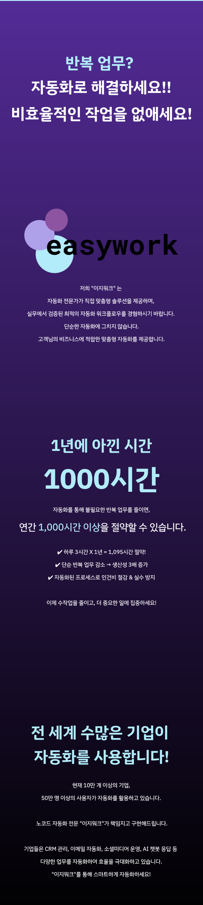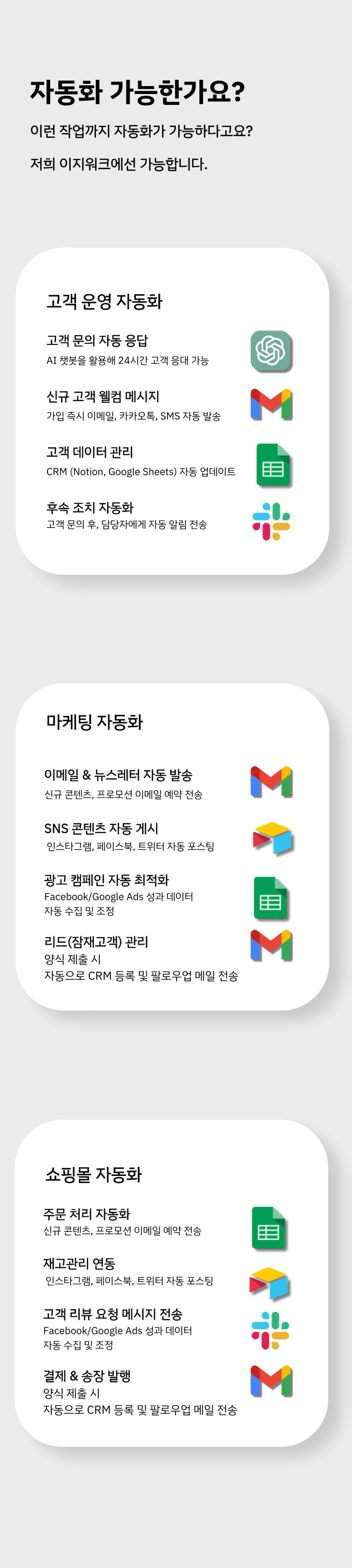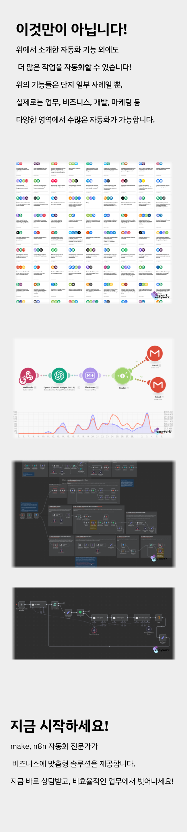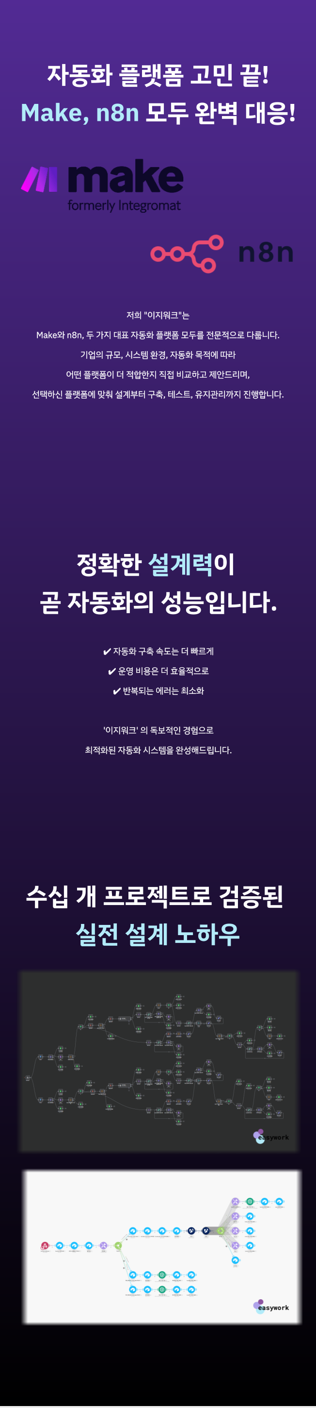 Make, n8n을 활용한 맞춤형 AI & 노코드 자동화 구축!매일 반복되는 수작업, 이제는 AI와 노코드 자동화로 해결하세요.자동화를 활용해 업무 효율을 극대화하고,소중한 시간을 더 가치 있는 일에 투자하세요!Make, n8n 자동화, 이런 점이 다릅니다!업무 90% 자동화 – 클릭 몇 번으로 반복 업무 종료비용 절감 & 생산성 향상 – 인건비 절감 + 빠른 업무 처리맞춤형 워크플로우 구축 – 원하는 플랫폼과 자유롭게 연동가능한 자동화 예시이메일 자동화: 문의 응답, 예약 확인, 마케팅 캠페인 자동 실행포털/구글 블로그 자동 포스팅: 키워드 기반 콘텐츠 업로드데이터 자동 처리: Google Sheets, Notion, CRM 연동Make 또는 n8n 중 어떤 플랫폼이 내게 맞을지 모르시겠나요?이지워크가 직접 진단하고, 설계부터 운영까지 전 과정을 책임집니다. 서비스 제공 절차Step 1: 주문 접수 & 상담1. 고객님의 자동화 니즈 파악2. 연동할 서비스 및 목표 설정3. 맞춤형 자동화 플로우 기획Step 2: 자동화 설계 & 개발1. Make, n8n을 활용한 자동화 워크플로우 제작2. 필요한 API 연동 및 테스트3. 맞춤 설정 및 최적화 진행Step 3: 테스트 & 검토1. 자동화 기능 정상 작동 여부 확인2. 고객님께 1차 시연 및 피드백 반영Step 4: 최종 납품 & 적용 가이드 제공1. 최종 자동화 플로우 배포2. 사용 방법 및 관리 방법 안내Step 5: 사후 지원 (패키지별 수정 횟수 내 제공)1. 추가 조정 및 버그 수정 (패키지에 포함된 수정 횟수 내)2. 추가 자동화 요청 시 별도 옵션 선택 가능 의뢰인 준비사항해당 자동화 플렛폼 계정 (무료 계정 가능, 단 n8n의 경우는 제외)자동화할 플랫폼의 로그인 정보 또는 API Key (필요 시)기타 요구사항 (예: 이메일 템플릿, 데이터 입력 포맷 등)사전 준비가 어려우신 분들을 위해 무료 상담을 제공해드립니다!