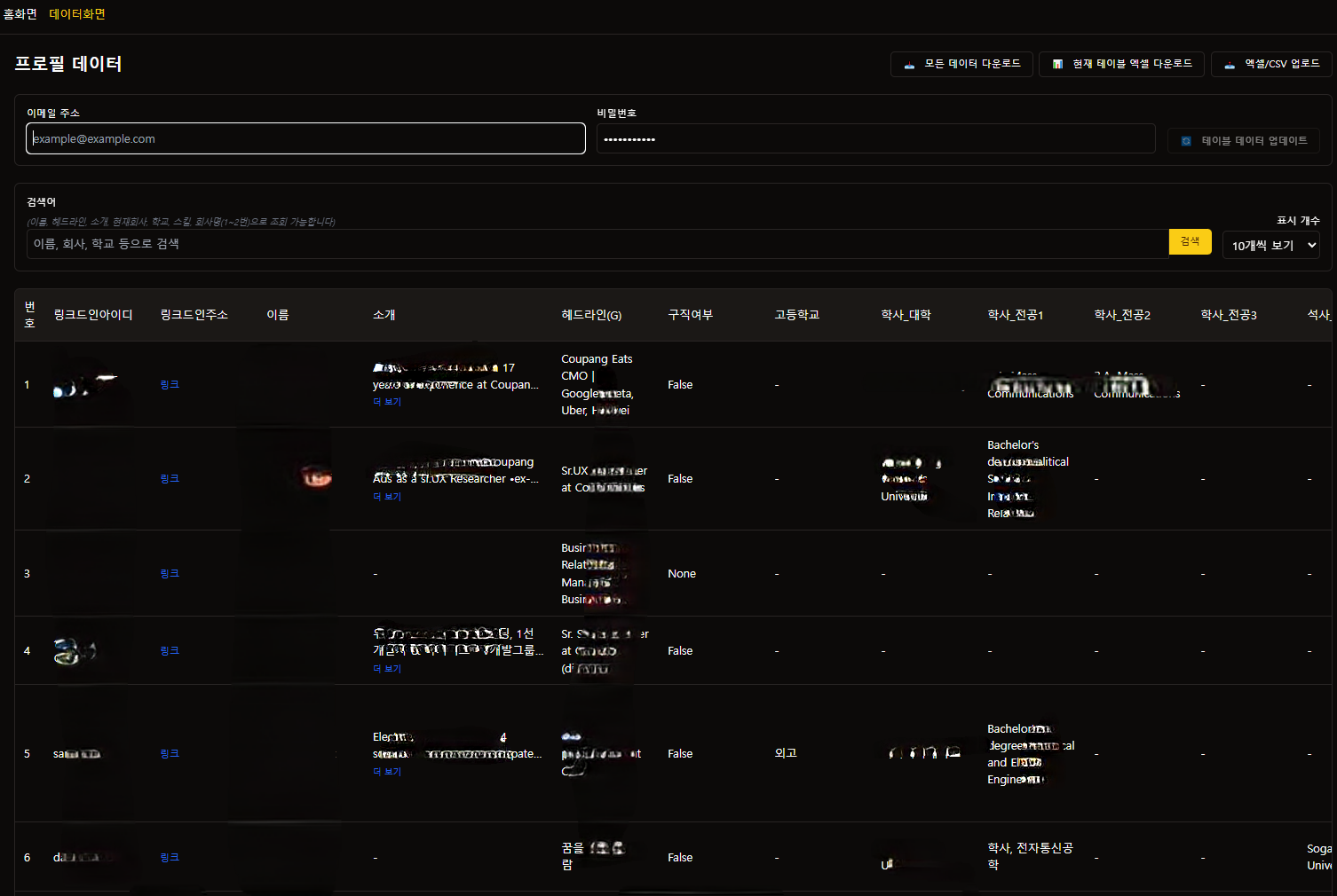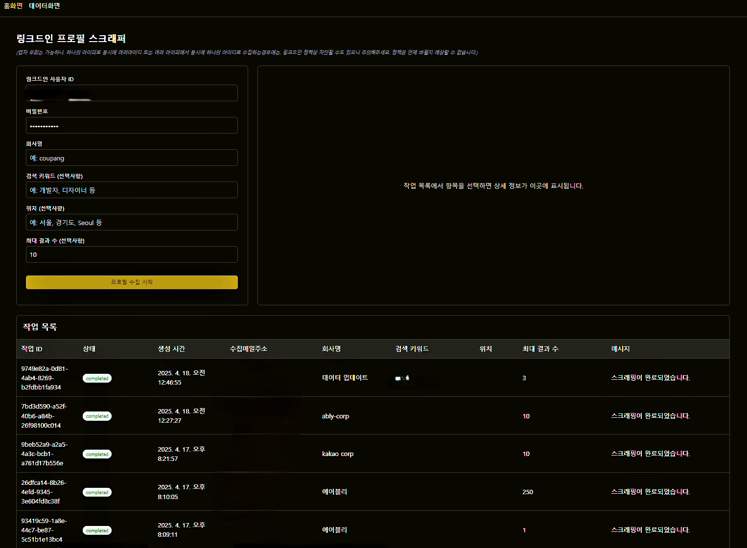 링크드인 사용자 프로필 데이터로부터 경력, 학력, 스킬 정보 등을 스크래핑 해드립니다.프로그램 설치방식이 아닌 웹 형태로 제공하여 모바일/PC 어디서든 수집, 저장, 업데이트가 가능합니다. 엑셀 다운로드 및 업로드를 통한 업데이트 기능 제공.원하는 데이터 필드 수집가능 (경력, 학력, 언어, 총경력정보, 스킬정보, 자격증, 프로젝트정보 , 팔로워 정보 등).자동팔로우 / 차단 기능 .봇 탐지 우회.캡차방지. 미팅을 통해 원하는 데이터 포맷을 확인합니다.커스텀이 필요한 경우 커스텀 기능에 대한 작업일정을 안내드리고 진행합니다.*프리미엄프리미엄은 커스텀 기능이 들어가므로 작업 후, 약 1주일간의 테스트 및 오류 수정기간을 제공합니다.그 외 기능추가는 협의 후 가능합니다. 링크드인 아이디. (1촌 계정이 많을 수록 좋습니다.)수집하고자 하는 회사명 또는 사용자 프로필아이디 혹은 링크정보.*커스텀기능으로 개발시,수집 데이터 항목 정의.데이터 분류가 필요한 경우 분류 기준표.