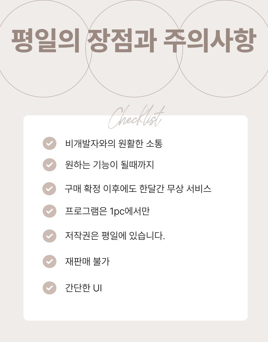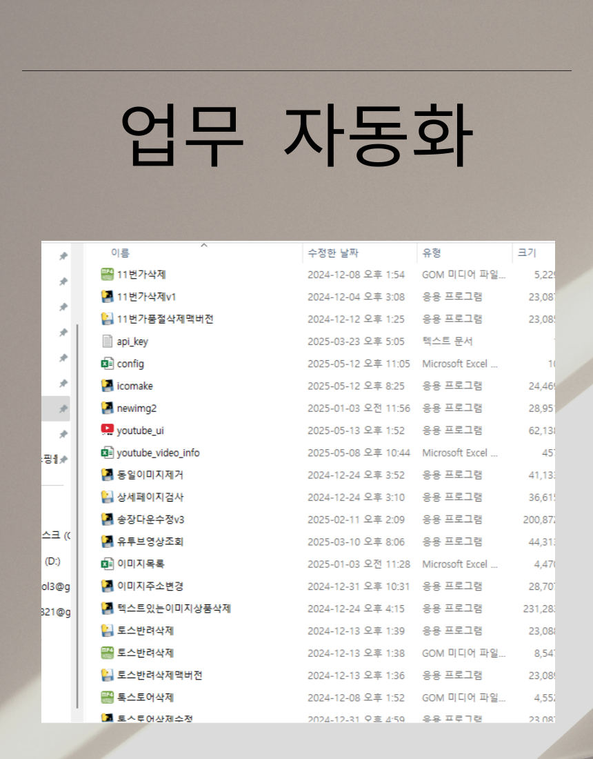 한번 구매로 평생 사용할 수 있습니다.누구나 쉽게 사용할수 있는 GUI 프로그램으로 제작해 드립니다.구매 확정 이후 30일간 무상으로 수정해 드립니다.엑셀로 하는 작업은 최대한 엑셀 VBA 매크로로 진행합니다.엑셀만으로 부족한 경우 파이썬을 통한 자동 프로그램을 맞춤 제작합니다.간단하고 쉬운 UI로 제작 진행합니다.실행파일과 코드를 함께 제공해 드립니다.[이런 분들은 꼭 저를 찾아주세요]1. 개발자분과 소통이 너무 어렵습니다.2. 프로그램을 개발했지만 작업물이 원하는 만큼 안나왔어요.저는 비개발자 입니다.전문가는 아니지만, 그렇기에 여러분의 마음을 더잘 이해한다고 생각합니다.모르고 안되면 공부를 해서라도 원하는 기능을 구현해 드리겠습니다.비개발자이기에 저렴한 가격으로 진행합니다.언제까지 이가격으로 할지 모릅니다. 빨리 신청하세요.[서비스 예시]데이터 처리 자동화 : 엑셀, VBA, 매크로를 통한 데이터 처리 자동화반복 작업 자동화 : 단순 반복 작업 자동화웹크롤링 및 스크래핑 : 웹사이트 데이터 수집, 정보 추출 [결재전 필독]- 프로그램 사용으로 인한 모든 법적 책임은 사용자에게 있습니다.- 구매 확정 이후 30일간 무상으로 A/S를 제공해 드립니다.- 프로그램 재판매는 불가합니다. 사전 조율하시면 추가 가격으로 소유권 이전해 드립니다.- 프로그램의 저작권은 저작권법에 따라 '놀꿈'에게 있습니다. 1. 제작에 필요한 상담2. 가능 여부 확인후 금액과 작업일을 협의3. 결재 이후 피드백을 통해 프로그램 제작4. 1차 작업물을 전달후 테스트 및 보완 요청5. 원하는 기능이 제대로 구현 될때까지 작업물 수정 될지 안될지 궁금한 것들은 문의 주세요최대한 자세한 설명이 정확하고 원하는 프로그램을 완성하게 됩니다.영상 또는 사진과 함께 내용을 최대한 자세히 서술해 주시면 정확한 프로그램을 제작해 드리겠습니다.