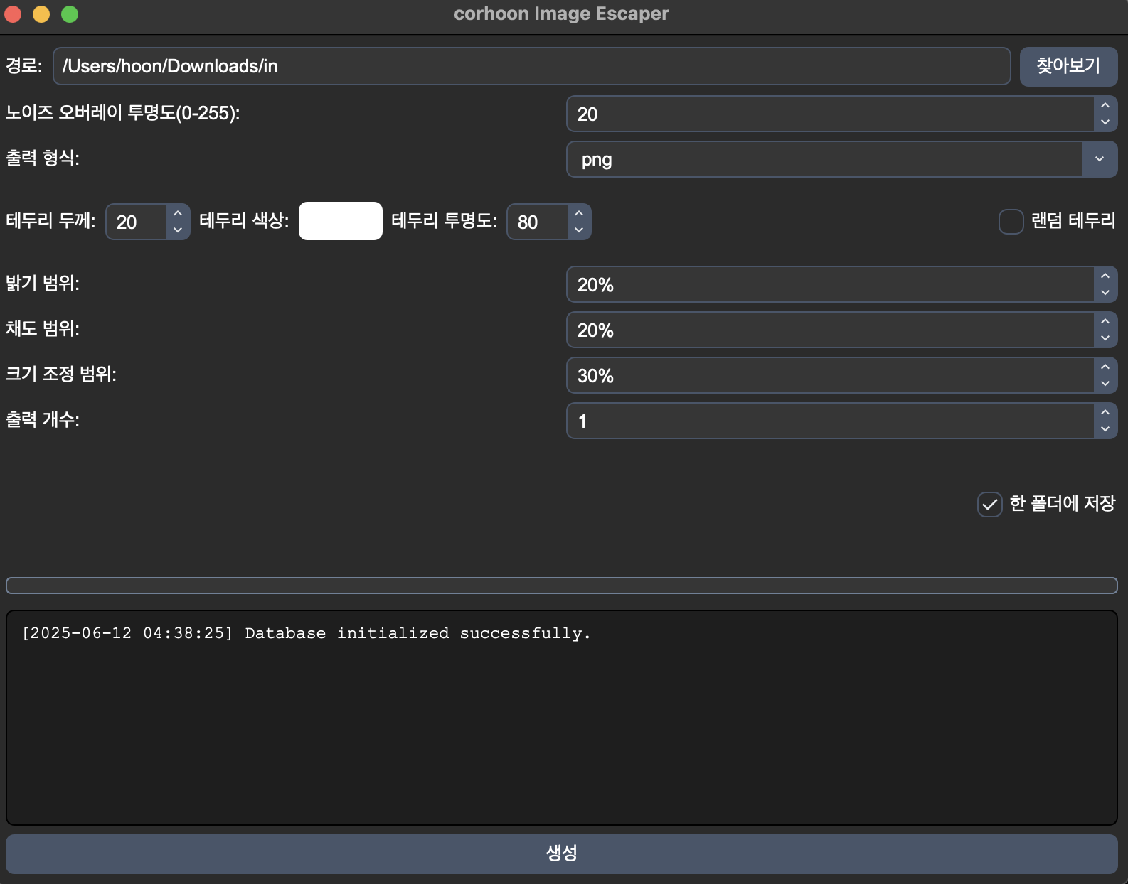 Corhoon Image Escaper 중복 이미지 방지 & 이미지 변환 자동화 프로그램원본 이미지 -> 시각적으로 동일하지만 데이터 상 고유한 이미지 대량 생성프로그램 소개Corhoon Image Escaper는 이미지에 노이즈, 밝기·채도·크기 랜덤 변형, 테두리 효과 등을 자동으로 입혀주어 이미지 고유성을 부여하는 고급 이미지 관리 소프트웨어입니다.기능 및 사용처- 메타데이터 제거- SEO 최적화- 이미지 중복 방지- 이미지 반복 사용 시 패널티 방지- 다양한 이미지 사용으로 검색엔진 우선 순위- 블로그 및 카페 포스팅 글 최적화- 랜덤 및 대량의 이미지 생성으로 작업 효율성- 이미지 로드 속도 개선(Webp 지원)주요 기능1. 메타데이터 제거이미지를 편집하는것이 아닌, 최종적으로 생성하는 방식이므로 기존의 메타데이터가 모두 제거됩니다.2. 노이즈 오버레이 생성특수 노이즈 기반의 부드러운 노이즈 이미지를 자동 생성.구버전에서는 특정 사진을 위에 반투명하게 겹쳐서 새로운 이미지를 생성했으나 특수 램덤 노이즈 이미지 생성 방식으로 완전한 랜덤성과 독립성을 보장합니다.마치 두장의 사진을 겹쳐서 사람의 눈엔 보이지 않지만 데이터 상 실제로 완전 다른 이미지가 됩니다.3. 밝기 & 채도 랜덤 조정밝기, 채도 범위를 설정하여 랜덤하게 변형.매번 조금씩 다른 결과물을 생성 가능.4. 크기 랜덤 조정가로/세로 비율 유지하며, 무작위 비율로 리사이징 가능.데이터 다양성을 확보하거나 독창적 이미지를 쉽게 생성.5. 테두리 추가 (옵션 제공)원하는 색상, 두께, 투명도를 설정 가능.랜덤 테두리 생성 기능 지원 더욱 자연스러운 보호 효과.6. 배치 처리 (Batch Processing)폴더 내의 수 많은 이미지를 한 번에 자동 변환.단일 폴더 또는 반복 폴더 모드 지원.여러 번 반복 처리 및 대량 이미지 생성.7. 다양한 출력 포맷 지원PNG, JPG, WEBP 등 원하는 포맷으로 결과물 저장.자신에게 맞는 확장자로 변환하여 사용가능. 결제가 확인되면 프로그램이 전달됩니다.제품 특성 상 프로그램을 수령 후엔 환불이 불가능합니다. 결제 후 메세지 남겨주시면됩니다. 특별히 준비하실건 없습니다. 문의사항 있으시면 메세지 남겨주세요
