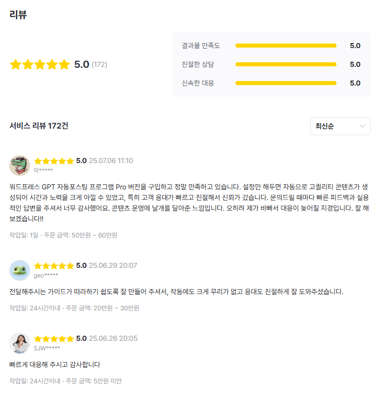 워드프레스 & N사 블로그 자동 포스팅연말 & 신년 맞이프리미엄 파격 세일!프리미엄 880,000 > 480,000한시적 할인이라 언제든 종료 될 수 있습니다.지금이 바로 기회 입니다!지금까지 이런 리뷰와 판매는 없었습니다.워드프레스 자동화는 약 2년 간 검증이 되어 왔고N사 자동화는 현재 많은 분들이 만족하며 사용 중 입니다.워드프레스 총 판매 200건 이상만족도 별 5개인 서비스 보셨나요?솔직하게 말씀드릴게요!!그 어떤 짓을 해도 200건 이상 판매에 별 5개 받기 힘듭니다.그만큼 만족도와 완성도가 높다는 의미입니다.이제는 여러 군데 구경하실 필요 없이이 서비스 보고 계시다면바로 사용 하시면 된다고 자신 있게 말씀드립니다.블로그와 검색엔진 로직에 따라서기간이 소요될 수는 있지만시간적 여유가 없으신 분들에게한 줄기 희망이 되어 드리겠습니다.2년 간 업데이트 횟수만 무려 100건이 넘을 정도로테스트하며, 고객의 소리를 최대한 반영하는 개발자로소문이 나 있는 개발자 입니다.프로그램의 생명은 유지보수이므로저와 같은 개발자와 함께 하시는 것이 중요합니다.판매만하고 나몰라라 하는 개발자는 이제 그만 만나세요!!프로그램 구성스탠다드- 워드프레스 자동 포스팅 1종- N사 자동 포스팅 1종- 6개월 사용권- 업데이트 6개월권지금만 할인 가격 550,000 -> 450,000디럭스- 워드프레스 자동 포스팅 1종- N사 자동 포스팅 1종- 1년 업데이트권- 무제한 사용권- 업데이트 1년권지금만 할인 가격 850,000 -> 580,000프리미엄- 워드프레스 자동 포스팅 1종- N사 자동 포스팅 1종- 무제한 사용권- 업데이트 무제한 평생권- 수익형 워드프레스 1개 제작- 특급 키워드 제공지금만 할인 가격 1,200,000 -> 880,000보시는 지금 구매하셔야 가장 저렴하게 구매 가능합니다.서버 과부하 및 서버 비용 올라갈 때마다 비용이 대폭 상승할 수 있습니다.데모 사이트 (워드프레스, N사)데모 사이트는 개발용으로 말 그대로 데모 입니다.참고용으로만 봐주세요.워드프레스https://car-info.generalkim.com/%ea%b8%88%ec%9c%b5%ec%8b%9c%ec%9e%a5%eb%8f%99%ed%96%a5%ec%9d%84-%ed%8c%8c%ec%95%85%ed%95%98%eb%8a%94-3%ea%b0%80%ec%a7%80-%eb%b0%a9%eb%b2%95/N사 https://blog.naver.com/gametapa각 프로그램의 수익 방식1. 워드프레스는 애드센스를 통해 수익을 얻는 방식입니다.2. N사는 쿠팡 파트너스 API를 통해 수익을 얻는 방식입니다.애드포스트가 걸려 있다면, 정보성 글로도 수익을 노려보실 수 있습니다.워드프레스 자동화의 특징워드프레스 자동화는 검색엔진의 안정화에 따라 수익이 달라 집니다.물론 여러 가지 변수 및 많은 환경이 존재하기에수익을 100% 보장하진 않고 있지만제 프로그램을 믿고 사용 하시는 분들에게 최대한 수익 보실 수 있게다른 혜택들도 많이 드리고 있습니다.제 개인적 수동 블로그 노하우도 여럿 뿌리고 다녀서많은 분들이 경험 하실 수 있게 최선을 다하고 있습니다.워드프레스의 안정화에 걸리는 시간은 최소 3개월 ~ 5개월 정도가 소요 됩니다.다만, 오래 걸리는 만큼 이후 방문자와 수익은 수직적 상승이 가능합니다.제가 다 도와드리겠습니다.N사 자동화의 특징N사 자동화 같은 경우 N사 블로그는N사는 최적화까지 걸리는 시간이 짧습니다.약 2개월~3개월 정도 소요가 되어 워드프레스 보다 짧습니다.다만, N사의 경우 변수가 더 크게 작용하는 것들이 많아워드프레스 자동화의 수직적 상승보다는 더 천천히 조금씩 따라오는 추세 입니다.장점은 무료이며 누구나 이용 가능하다는 것이 장점이라제 프로그램 이용 시 개설도 필요 없다는 점이 최대 장점입니다.워드프레스 또는 N사만 이용 하고 싶어요! 가능한가요?네! 워드프레스 또는 N사 중 1개만 이용 하시길 원하신다면그렇게 가격 또한 그렇게 적용해드리고 있으니상담 하실 때 말씀 주시면 처리할 수 있도록 하겠습니다.워드프레스가 없는데, 가능한가요?워드프레스는 혼자 구축하기 어려운 서비스로만약 갖고 계시지 않으시다면프리미엄 서비스를 이용해주세요!수익형 워드프레스를 제작해드립니다.안내에 따라 서버 호스팅 및 도메인 회원가입만 해주시면 됩니다.모든 것을 제가 다 알려드리니 걱정 마세요!수익이 100% 발생하나요?저 처럼 솔직한 개발자도 없습니다.사실 수동으로 블로그 운영 시에도 수익이 100% 발생하지 않습니다.이 말은 즉, 여러 변수가 너무 많기 때문에100% 수익이 나온다! 라고 보장을 하지 못하는 것이지나오지 않는 다는 것이 아닙니다.시중에서 100% 수익난다라고 하시는 건 대부분 사기이므로거르시는 게 좋다는 말씀드립니다.제가 최대한 도와드리고 있으니 저 믿고 따라와보세요.여러 개를 하면 수익성이 더 좋을까요?워드프레스 자동 포스팅 프로그램 이용 시여러 개를 운영하시면 도움이 크게 됩니다.프리미엄으로 해주신 후 추가 워드프레스 제작 개수 만큼 결제해주시면원하시는 만큼 제작을 해드리겠습니다.제가 8년 이상 블로그 활동 하면서가장 이상적인 수익화 블로그 디자인으로 제작 해드리고 있어요.다른 곳에서 몇 십만원 하는 워드프레스 제작 이용하지 마시고제가 만들어 드리는 워드프레스로 수익화 도전해보세요!다만, N사 같은 경우 3개까지만 이용하시는 것이 좋습니다.대게 IP를 