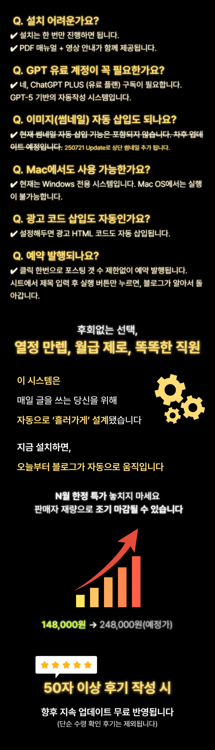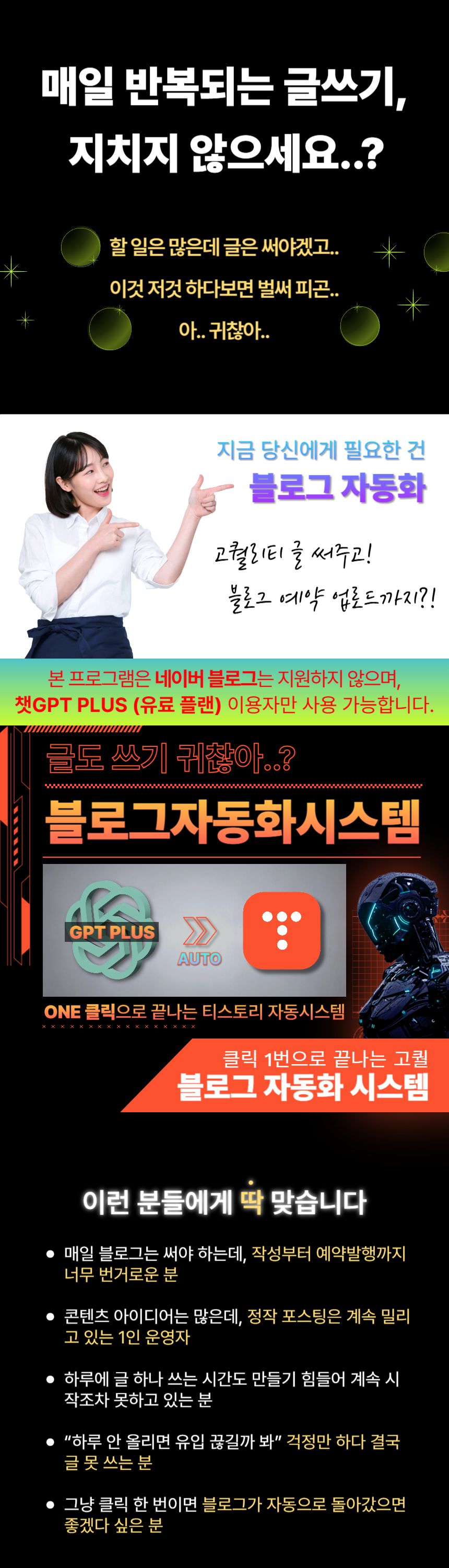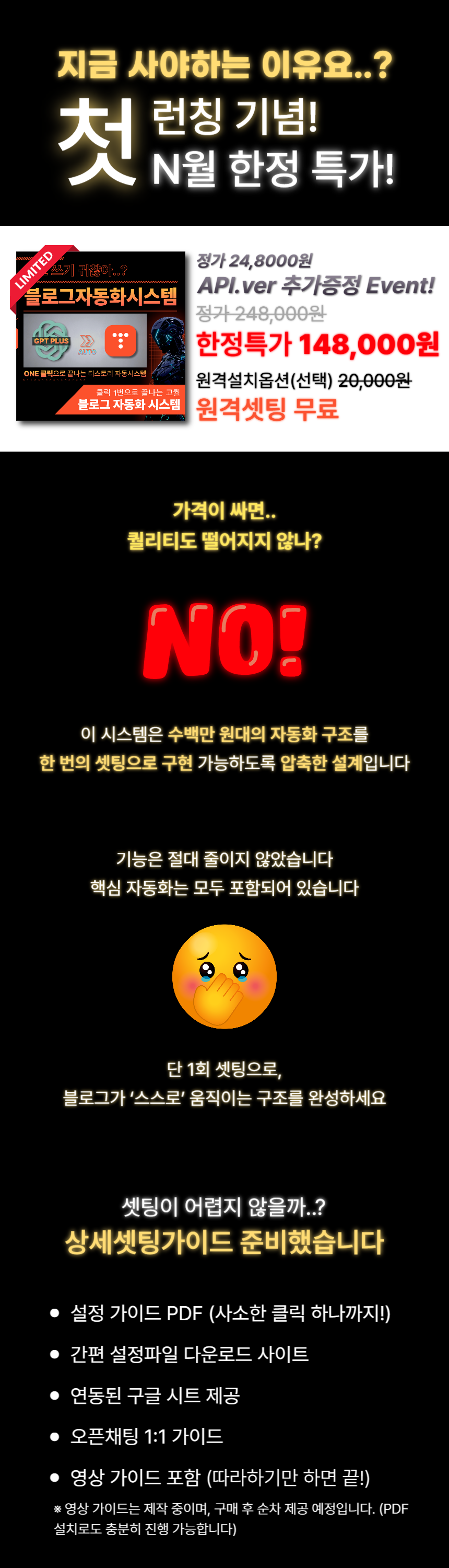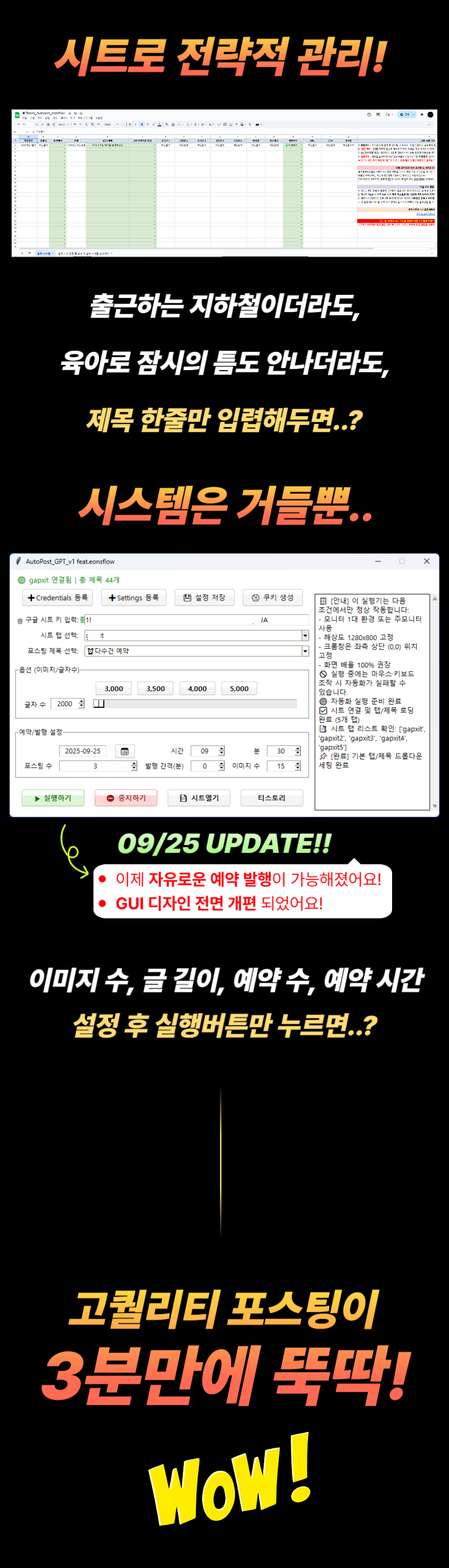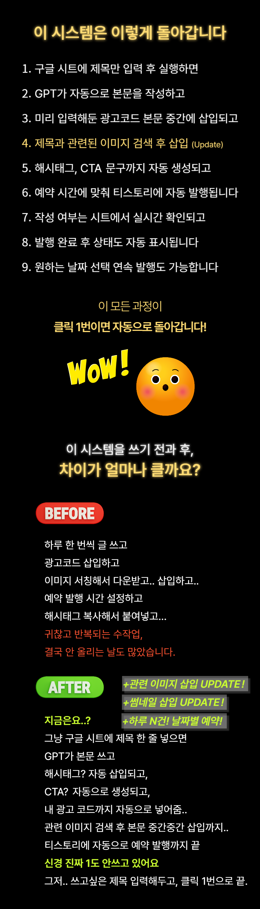 매일 똑같은 글쓰기 & 발행, 지치지 않으셨나요?글은 써야 하고, 예약도 해야 하고…이런 상황, 익숙하신가요?· GPT로 콘텐츠 쓰려면 매번 브라우저 열고 프롬프트 입력해야 하고· 티스토리에 글 올리려면 로그인부터 썸네일, 예약 시간까지 다 수작업· 해시태그 입력, 광고 삽입, CTA 버튼 만들기까지…결국, 시간은 시간대로 쓰고자동화는커녕, 매일 반복노동만 하고 계시지 않나요?방치하면 생기는 진짜 손해는?· 글쓰기 시간보다 발행 준비 시간이 더 오래 걸리는 비효율· “내가 했던 작업을 또 해야 하는” 반복 피로감· 작업량이 많아질수록 생산성이 떨어지고 블로그 성장도 정체· 결국 “내가 쓰지 않으면 멈추는 시스템”에 갇히게 됩니다 그래서 만들었습니다클릭 한 번으로 끝나는,GPT 티스토리 예약 발행까지 자동화 시스템1+1 Event 진행 중!구독이 필요없는 API.ver 프로그램 런칭 전 구매자 한정으로Gemini API.ver 프로그램을 하나 더!API.ver은 별도 구독 없이 단독 실행이 가능하며,글 작성은 가성비가 뛰어난 Gemini API를 사용합니다.gpt 구독 해지시에도 사용하실 수 있는 프로그램을 기한 한정으로 드립니다. [해당 이벤트는 API.ver 런칭 시 즉시 종료 예정입니다]포스팅이 어떻게 되는지 볼까요?[Chatgpt 구독 버젼 포스팅 작성 예시 보기] https://buly.kr/HSYCsKx[API 버젼 포스팅 작성 예시 보기] https://buly.kr/1GKUdRP이 시스템 하나면?GPT 프롬프트 자동 입력 자동 글 생성 감지생성된 STEP 1~5 정제 후 자동 수집광고코드 있으면 자동 삽입 (STEP3)CTA 버튼, 해시태그, 추천 URL 자동 추출티스토리 예약 발행까지 전체 자동 완료글을 쓰는 시간이 아니라클릭 한 번이면 모든 게 시작됩니다구성 안내· 실행 파일 (.exe) 1개· 최초 1회만 Google 시트 & 쿠키 등록· 이후 자동으로 GPT 작성 포스팅까지 연결· 광고 삽입 / CTA 버튼 삽입 / 해시태그 정리까지 전부 포함· 별도 설치 X, 코드 사용 X, 매뉴얼 제공 O이 제품이 특별한 이유ONE 클릭으로 > GPT 글쓰기 수동 입력 자동 감지 및 이어쓰기 > 시간·분 지정 예약 발행> CTA 버튼 본문 기반 자동 생성 > 광고 본문 중간 자동 삽입 > 해시태그 자동 추출기존 자동화는 '작성만' 해주고 끝이 실행기는 작성부터 발행까지 끝냅니다실제 사용 예시· 작성하고 싶은 주제의 제목을 입력해두면, 상위 노출 가능한 글이 자동으로 작성되요· 광고코드는 자동으로 붙고, 클릭 유도용 버튼도 만들어져 있으니 따로 손 댈 게 없어요· 하루 N건 포스팅 그냥 클릭 몇 번이면 예약 발행이 끝납니다“하루 1포스팅도 벅찼는데, 지금은 하루치를 단 몇분 만에 끝내요”지금 바로 시작해야 하는 이유· 매일 글 쓰고 발행하는 시간, 그냥 클릭 한 번으로 끝낼 수 있다면?· 전략적 통제가 가능한 시스템이라면, 더 이상 자동화는 독 아닙니다당신만 몰랐던 자동화의 세계지금 바로 체험해보세요 GPT 자동작성부터 티스토리 예약 발행까지, 클릭 한 번으로 완전 자동화됩니다.별도 설치 없이 .exe 실행기로 구글 시트와 연동하여 글 작성 + 포스팅까지 모두 처리되며,초보자도 영상 가이드를 따라 그대로 실행만 하면 바로 사용할 수 있도록 구성되어 있습니다.구매 후 구글 드라이브 링크 제공 실행기 .exe, GPT 프롬프트 폴더, 예시 settings.json, 필독 가이드 PDF 포함 설정 가이드 영상 링크 제공 실행만 하면 바로 사용 가능 구글 계정, 티스토리 블로그 계정, 블로그 주소 1개 이상이 필요합니다.또한 실행기 연동을 위한 Google Sheet 키와 credentials.json은 필독 가이드를 통해 안내되며,모두 최초 1회만 설정하시면 이후엔 재설정 없이 바로 사용 가능합니다.원격설치 필요시, 원하시는 설치 날짜와 시간대를 알려주세요.시간 협의 후 원격설치 도와드립니다.