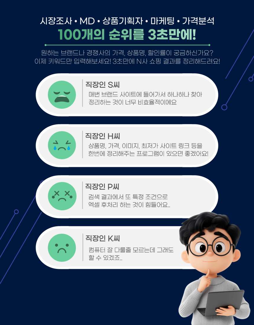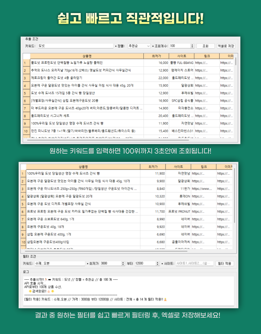 [곧 오픈 이벤트가 종료됩니다]서비스 오픈 기념 이벤트가 곧 종료됩니다!지속적인 업데이트와 기능 강화로 가격은 계속 상승합니다.[1차] 79,000원 에서 할인가 39,000원* 해당 서비스는 크롤링이 아닌 N사에서 공식적으로 제공하는API를 사용하여 결과를 사용자 친화적으로 정리하는 프로그램입니다.--------------------------------------------------------[인삿말]"혹시 이런 고민 해보신 적 있나요?"· "상품별 최저가, 링크, 이미지 등을 정리하는데 너무 귀찮아요.."· "매일 번거로운 반복 작업 때문에 오늘도 야근할 것 같아요..."· "자동으로 상품 정보 추출해서 정리해주는 프로그램 없나..?"· "자동으로 결과 수집하고, 내가 원하는 정보만 추출할 수 있을까?"어쩔 수 없이 반복되던 고민, 이제 그만하세요!!상품 분석가, MD, 기획자, 마케터 누구나 하게 되는 고민을완벽하게 해결해드립니다!--------------------------------------------------------[이런 분들에게 추천합니다]※ 산더미 같은 반복 작업에 지치고 상처 받은 직장인!※ 단순 노동에 오랜 시간을 투자하는 것이 스트레스인 분!※ 빠르고 정확하고 깔끔하게 키워드 검색 정보를 만들고 싶은 분!※ 1회 구매로 평생 사용할 수 있는 프로그램이 필요하신 분! 누구나! 1. 프로그램 사용은 윈도우(Window) 환경에서만 가능합니다.2. 키워드 추출 및 필터를 통해 가공하고 엑셀로 저장하는 프로그램 입니다.3. 서비스 장애 시 편하게 문의 주시면 빠르게 처리 도와드립니다!4. 프로그램 사용 가이드 제공해드립니다. 1. 윈도우 기반의 PC혹은 노트북이 필요합니다.2. N사 아이디가 필요합니다!3. 회사에서 칼퇴하고 싶은 마음!