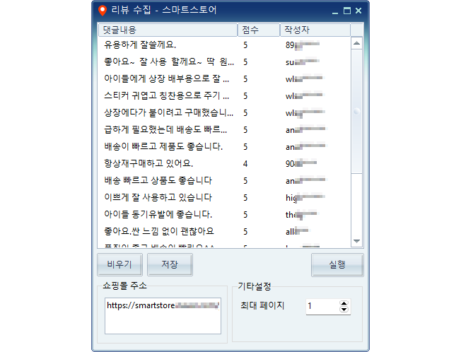 스마트스토어 리뷰 수집, 더 이상 시간 낭비하지 마세요.아직도 고객 리뷰를 하나씩 복사하고, 분석을 위해 수작업으로 정리하고 계신가요?클릭 한 번이면, 우리 상품의 모든 리뷰가 자동으로 모아지고, 실무에 필요한 핵심 정보까지 한 번에 정리됩니다.이런 분께 추천합니다- 이벤트·마케팅 효과 측정용 리뷰 데이터를 빠르게 확보하고 싶은 마케팅 실무자- 신상품 반응, 고객 의견, 불만족 리뷰를 신속하게 파악하고 싶은 운영자- 여러 상품 리뷰를 비교/분석해 상품 개선과 기획에 활용하고 싶은 담당자- 리뷰 데이터 기반, 엑셀·DB 저장 및 사내 보고용 자료가 필요한 관리자- 리뷰·후기를 자사몰에 등록해 신뢰도를 높이고 싶은 운영자기본 제공- 리뷰 내용, 평점, 작성자, 작성일 등 실무에 필요한 주요 정보 수집- 스마트스토어 상품 리뷰 자동 수집 (공식 웹사이트 기반)- 수집 데이터 엑셀 파일 저장- 반복 수집·스크롤 자동화결과물 안내- 쉽게 사용할 수 있는 프로그램 파일(.exe) 제공 1. 결제 전 반드시 먼저 프로그램에 대해 상담을 진행합니다.2. 무료 체험 프로그램을 제공합니다.3. 사용 후 문제가 없으면 구매를 확정해 주시면 됩니다. 1. 윈도우 10 및 11을 지원합니다.2. 엣지 브라우저가 설치되어 있어야 합니다.3. 프로그램 사용을 위해 PC의 맥어드레스를 확인합니다. (인증은 등록된 PC 1대에만 적용되며, 변경이 필요할 경우 판매자에게 문의해 주세요.)