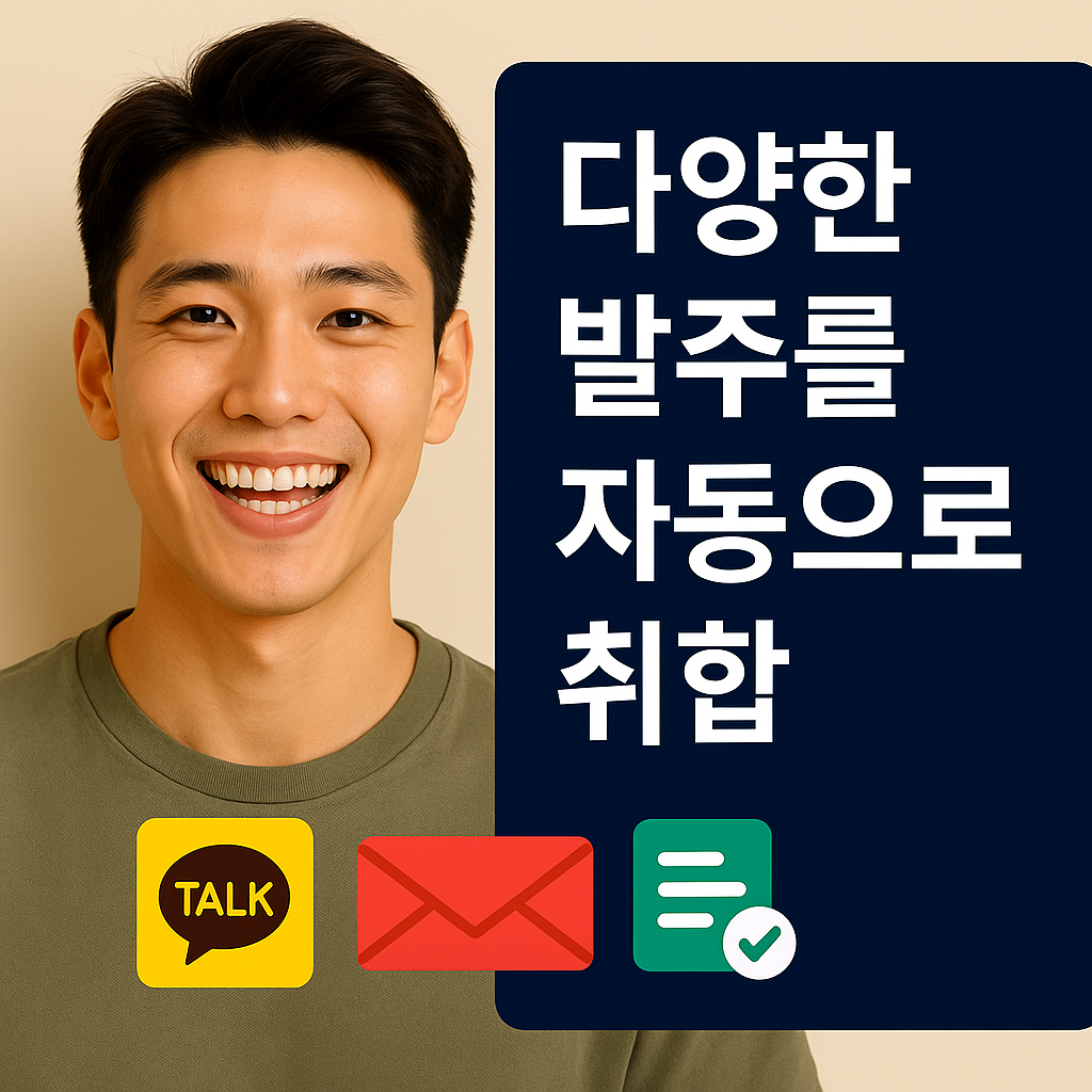 상세설명거래처마다 발주 방식이 달라서 매번 정리하시느라 고생 많으셨죠?어느 거래처는 이메일로, 어디는 카톡으로, 어디는 문자로, 또 어디는 전화로.....ㅠㅠ이런 다양한 발주를 정리하는 일이 참 번거로운 일입니다. 그러나..ㅇ이젠 걱정마세요..이제 카카오톡, 이메일, 발주 폼 등 다양한 채널로 들어오는 발주를 한 번에 자동 취합하세요.카톡 발주 자동 수집 구글시트로 즉시 입력이메일 발주 PDF/엑셀 자동 정리발주 폼(구글폼 등) 응답 자동 통합모든 데이터를 하나의 명세표로 변환중복·누락 없이 표준화된 데이터 관리여러 채널에서 흩어지던 발주를 완전히 통합해 드립니다.이제는 발주 관리 스트레스에서 벗어나세요!통합 > 명세표 작성, 피킹리스트 작성 > 세금계산서작성이 모든 것이 완전 자동?? . 버튼만 눌러주세요. 서비스 제공 절차요구사항 확인 – 거래처 발주 채널(카톡, 메일, 폼 등) 파악시스템 설계 – 멀티채널 통합 구조 설계자동화 세팅 – 발주 취합 + 명세표 변환 기능 구현테스트 & 보정 – 실제 발주 데이터로 검증 및 수정최종 제공 & 사용 교육 – 가이드 문서 및 매뉴얼 제공작업전에 충분한 사전 협의와 업무 프로세스를 논의 후에 작성합니다.유통시장은 각 유통 품목마다 다양한 방법과 프로세스가 있습니다.그 모든것을 30년 경력의 유통전문가+자동화 전문가가거래처의 특성에 딱!! 맞게 커스터마이징 해 드립니다.편리한 방법은 모두 찾아서 접목시켜 드립니다. 의뢰인 준비사항거래처 목록 (거래처명, 발주 방식 포함)발주 데이터 기본 양식 (메일, 폼 등 예시)명세표 기본 양식구글 계정 (Google Sheets/Drive 사용 목적)"프로세스를 의논하면서 준비해야할 사항등 충분히 논의 및 준비합니다"최대한 많은 사전 논의와 개선방법 회의를 통해,최적화한 프로세스를 설계해 드립니다"오토봇은 가능한 모든것을 자동화 해드립니다"