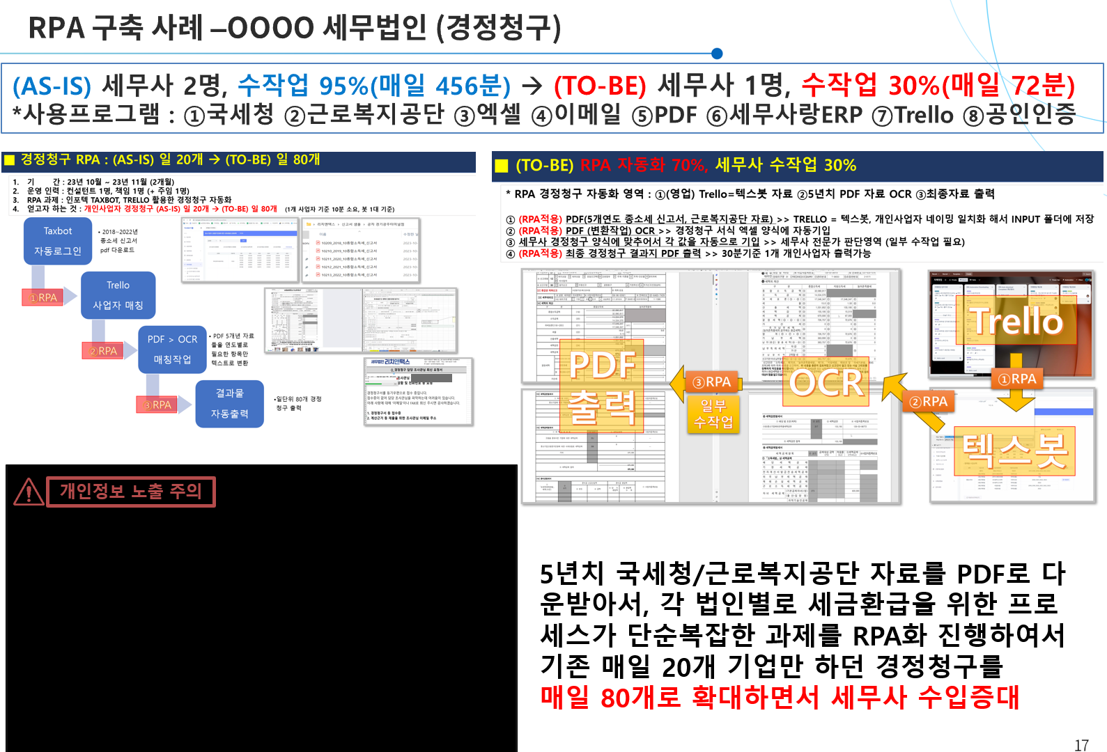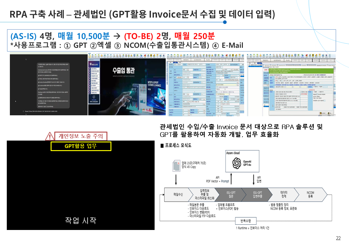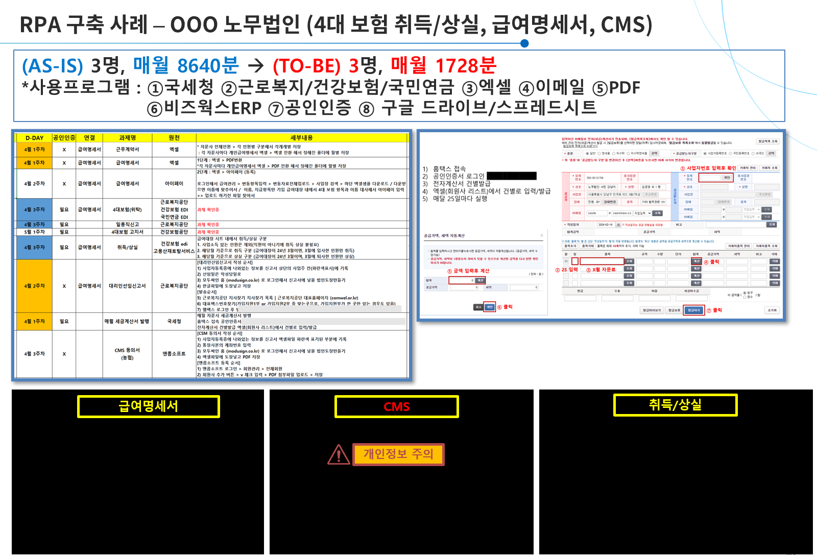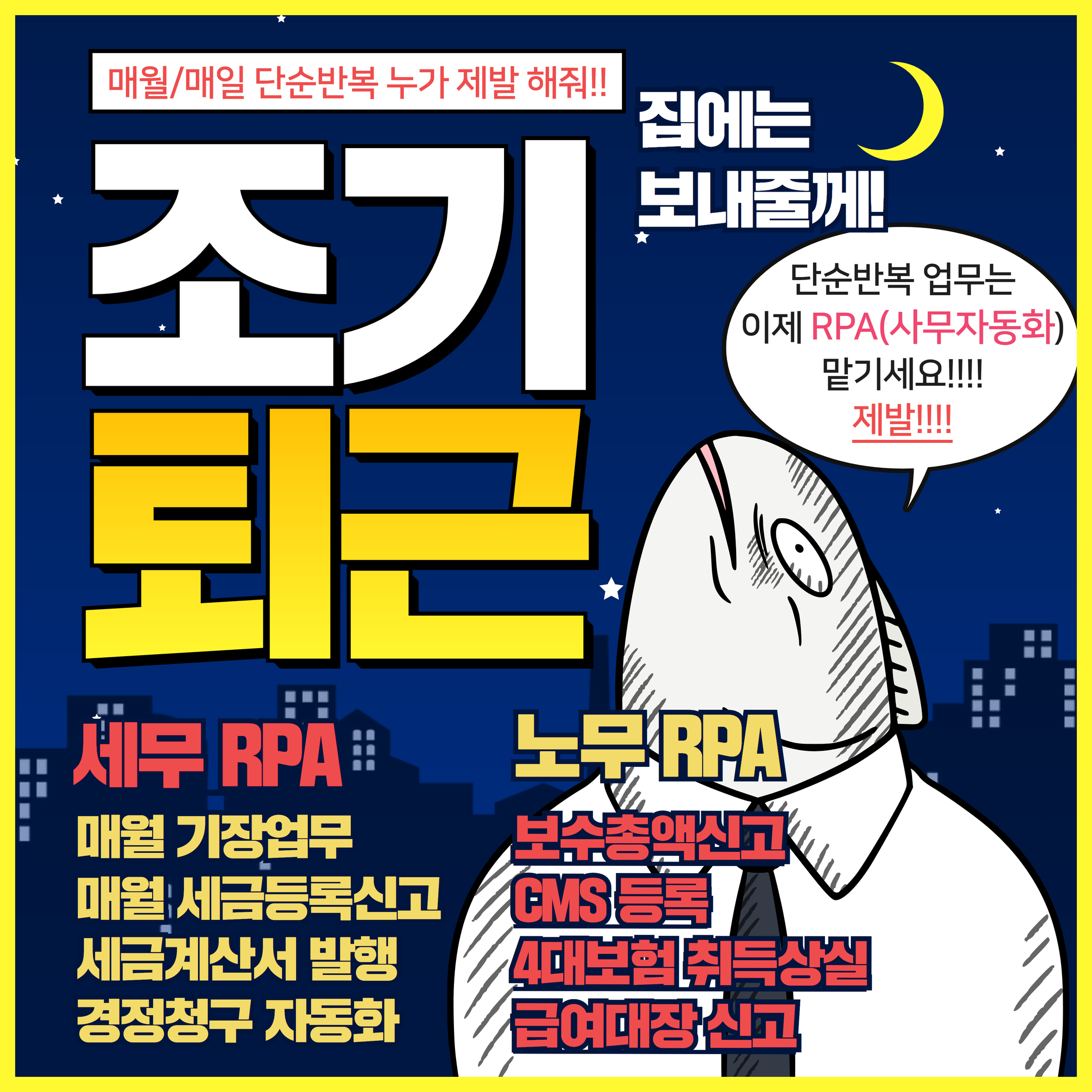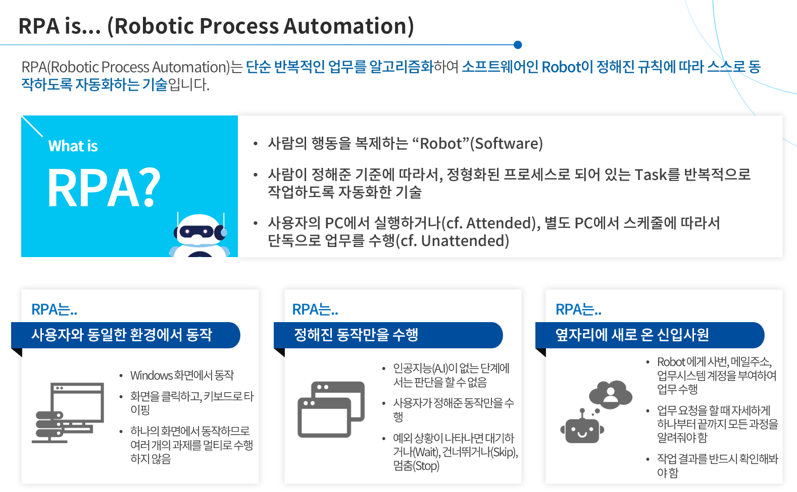 RPA 통해서 얻고자 하는 바는 RPA(Robotic Process Automation)는 단순 반복적인 업무를 알고리즘화하여 소프트웨어인 Robot이 정해진 규칙에 따라 스스로 동작하도록 자동화하는 기술입니다. ---------------------------------------------------------------365일 매일같이 발생하는 단순반복업무 구정, 추석, 어린이날, 광복절 등에도 진행해야 하는 단순반복업무------------------------------------------------------------------컴퓨터를 사용하는 그대로 동일한 환경에서 작동되며매일같이 진행하는 기존 동작만을 수행하여365일 쉼없이 일을 하며 결과물을 도출합니다. 어떤 업무들에 필요할까요? 다수의 시스템 사용업무 다량의 거래를 수작업 처리하는 업무 오류 / 재작업 빈도가 높은 업무 예외가 제한적인 업무 일과 시간외 처리 업무 업무자동화를 하고 싶은 영역에 대한 프로세스를 알려주셔야 합니다. 1주차) 자동화 하고 싶은 사무실 내 단순반복업무를 선정해서 동영상으로 녹화를 진행합니다. (*로그인부터 엑셀작업등 모든 업무를 영상 녹화, 업무에 필요한 모든 소프트웨어 알람필요)2주차) 개발자들이 현업과 미팅하고 개발을 진행합니다. (*개발간 카톡단체방을 통해서 수시로 업무 진척도 공유)3주차) 개발 완료된 후에 유지보수를 위해서 에러 수정을 2회 진행합니다. 4주차) 매월 유지보수를 통해서 홈페이지 업데으트나 사무업무 최신화 사항을 추가로 반영합니다. 현업 프로세스의 A~Z까지 영상녹화가 필요하며, 본인이 업무를 위해서 사용했던 소프트웨어등을 모두 정리해둡니다. 예를들어 홈택스로 세금계산서를 발행했다면 공인인증서, 아이디, 비번등이 필요하며, 다양한 업체들의 사업자번호, 이메일 주소등의 모든 정보를 제공해주셔야 합니다.)보안이슈로 인해서 컴퓨터는 의뢰하신 업체의 컴퓨터로 운영될 수 있도록 개발을 진행하고 있습니다. 개발기간동안 저희 컴퓨터로 개발 후에 유지보수 기간에는 해당업체 컴퓨터로 운영됩니다.