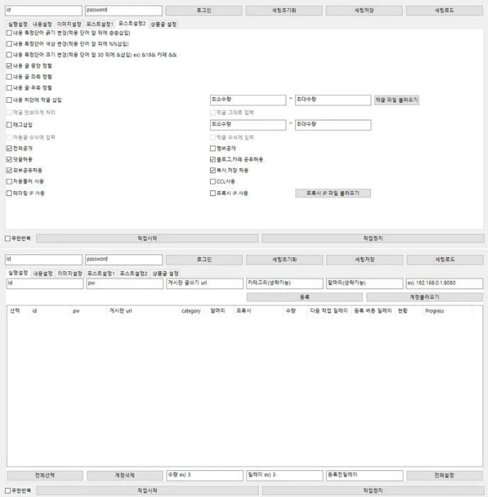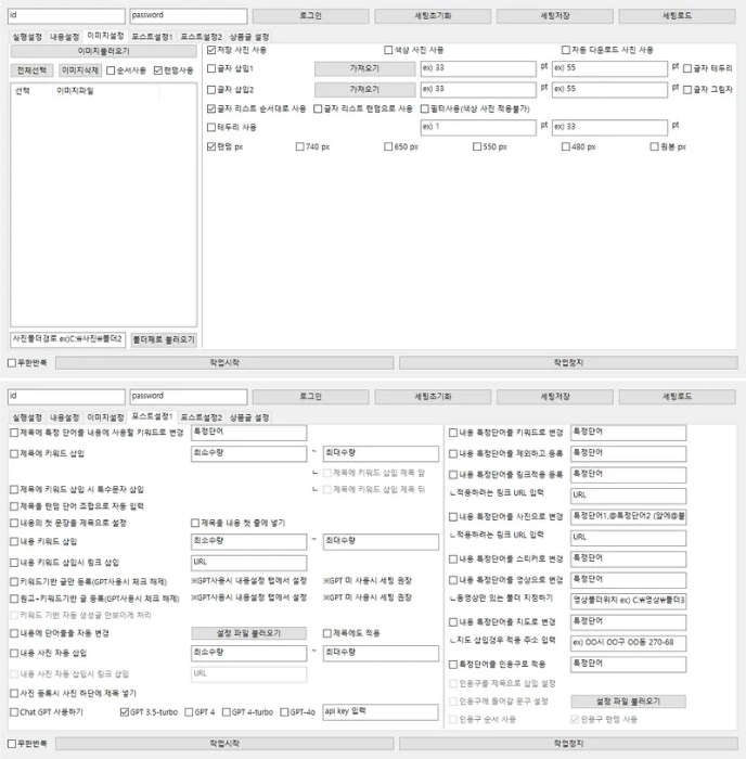 카페 자동 포스팅 프로그램 글쓰기 자동화 업로드 솔루션카페 마케팅, 이제는 자동화로 효율을 높이세요.다수의 계정으로 다양한 카페 게시판에 자동으로 글을 등록할 수 있는 카페 자동 포스팅 입니다.손으로 하나씩 올리던 반복적인 작업을 줄이고,시간 대비 최고의 퍼포먼스를 만들어냅니다.GPT 기반 글 생성, 제목 자동화, 이미지 세탁, 키워드 치환!!GPT 없이도 자체 원고 생성 치환 기능으로 세팅이 가능!!자동화 기능을 활용해 완성도 높은 콘텐츠를 대량으로 등록할 수 있습니다.수작업처럼 보이는 정교한 포스팅을 원하신다면 이 솔루션이 정답입니다.※상품게시판,일반게시판 모두 사용이 가능합니다!1. AI 기반 원고 및 제목 자동 생성GPT-3.5, GPT-4, GPT-4o 등 다양한 모델 지원GPT 프롬프트 전달 가능키워드 기반 자동 글 생성 및 제목 생성 가능기존 원고 변형 및 치환 기능 포함2. 다양한 게시판에 자동 포스팅일반 게시판, 상품 게시판 모두 지원여러 카페 별로 자동 업로드 가능인용구 등록 가능라이브러리 제외 기능동영상 삽입, 이미지 첨부, 지도 등록, 이모티콘 삽입 등 세부 설정 가능3. 이미지 자동 생성 및 세탁 기능기존 이미지 자동 세탁 (중복 방지)이미지가 없어도 자동 생성 가능4. 고급 치환 시스템원고 내 특정 단어를 키워드, 이미지, 링크 등으로 치환 가능키워드, 문구, 이미지 치환 무제한 설정 가능자동 치환 시 색상, 크기, 굵기 등 텍스트 스타일 조절 가능5. 키워드/원고/제목/이미지 랜덤 or 순차 사용 설정랜덤 또는 순차 방식 선택 가능6. 링크 삽입 및 SEO 최적화키워드에 URL 링크 삽입 가능태그 자동 입력 가능7. 대량 작업 최적화계정별 포스팅 수량 및 시간 딜레이 개별 설정 가능계정 변경 시 자동 테더링 또는 프록시로 IP 변경 가능작업 설정값을 파일로 저장하고 불러오기 가능그 외에도 더 수십 가지 기능이 탑재되어있습니다.하나의 글을 수십 개 카페에 자동 등록서로 다른 키워드, 이미지, 제목으로 다채롭게 구성게시글마다 다른 스타일로 보이도록 막글과 본문 조합 가능하루 수백 건의 게시도 시간 절약하며 간편하게 수행 가능합니다! 구매 즉시 전달 가능압축해제 후 사용제공 사용방법 중 일부 기능만 숙지 후 사용 가능!무상 AS 제공 가입된 카페 계정 정보원하는 키워드 및 홍보 문구없을시 GPT 세팅 가능GPT 사용을 원할시 GPT API (API 사용방법 제공)이미지/영상 자료 (선택)프록시 또는 테더링 환경 정보 (선택)