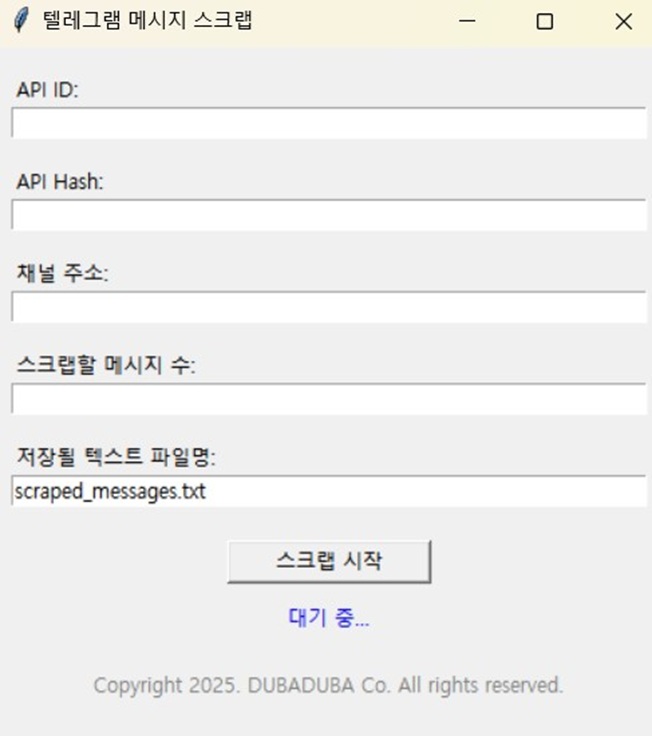 1. 누구라도 쉽게 사용할 수 있는 텔레그램 봇 프로그램입니다.(되도록 간결하게 제작하였으며 실행 파일 형태로 보내드립니다. 별도 설치 x)2. 텔레그램 그룹/채널 메시지를 .txt .xlsx .docx 등의 파일로 스크랩합니다3. 프로그램 상의 오류는 말씀주시면 무상으로 수정해드립니다.(기능을 추가하거나 추출 데이터 세팅 등의 수정을 원하시면 요청 주세요)※ 해당 자료의 저작권은 해당 서비스의 전문가에게 있습니다.엑셀, 워드 등으로 데이터 저장 시 PC에 해당 프로그램이 설치되어 있어야 합니다.아울러 텔레그램 API 및 Hash 발급이 필요합니다 (추후 같이 안내드립니다) 1. 원하시는 상품을 결제합니다.2. 크몽을 통해 결과물을 제공받습니다.3. 작동 테스트를 합니다.4. 최종 구매확정을 합니다.5. 리뷰와 피드백 적극 환영합니다. 무엇이든 남겨 주세요 크몽 채팅을 통해 요청사항 남겨주시면 신속히 답변 도와드립니다.기능 추가나 리스트 결과물 작업도 의뢰 가능합니다.