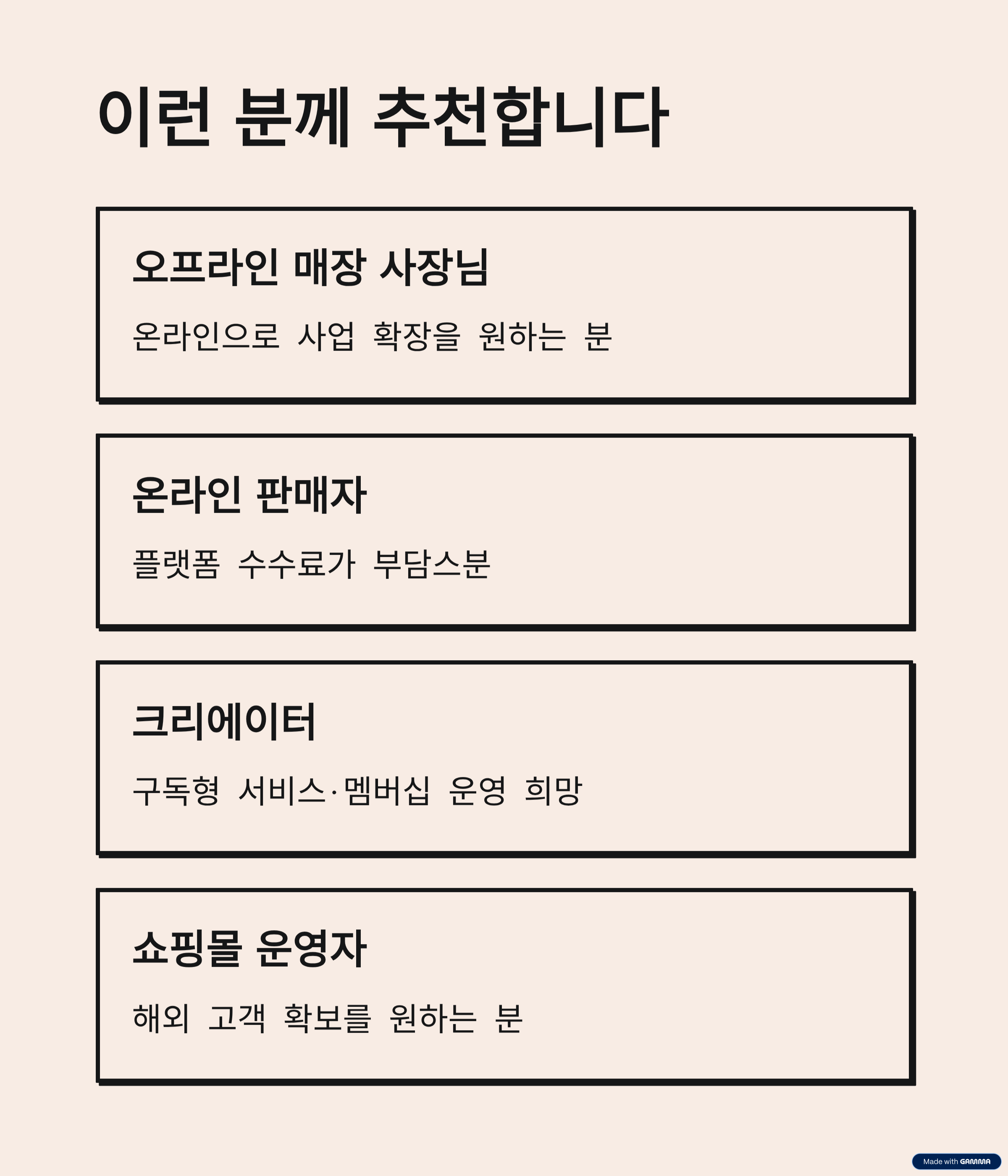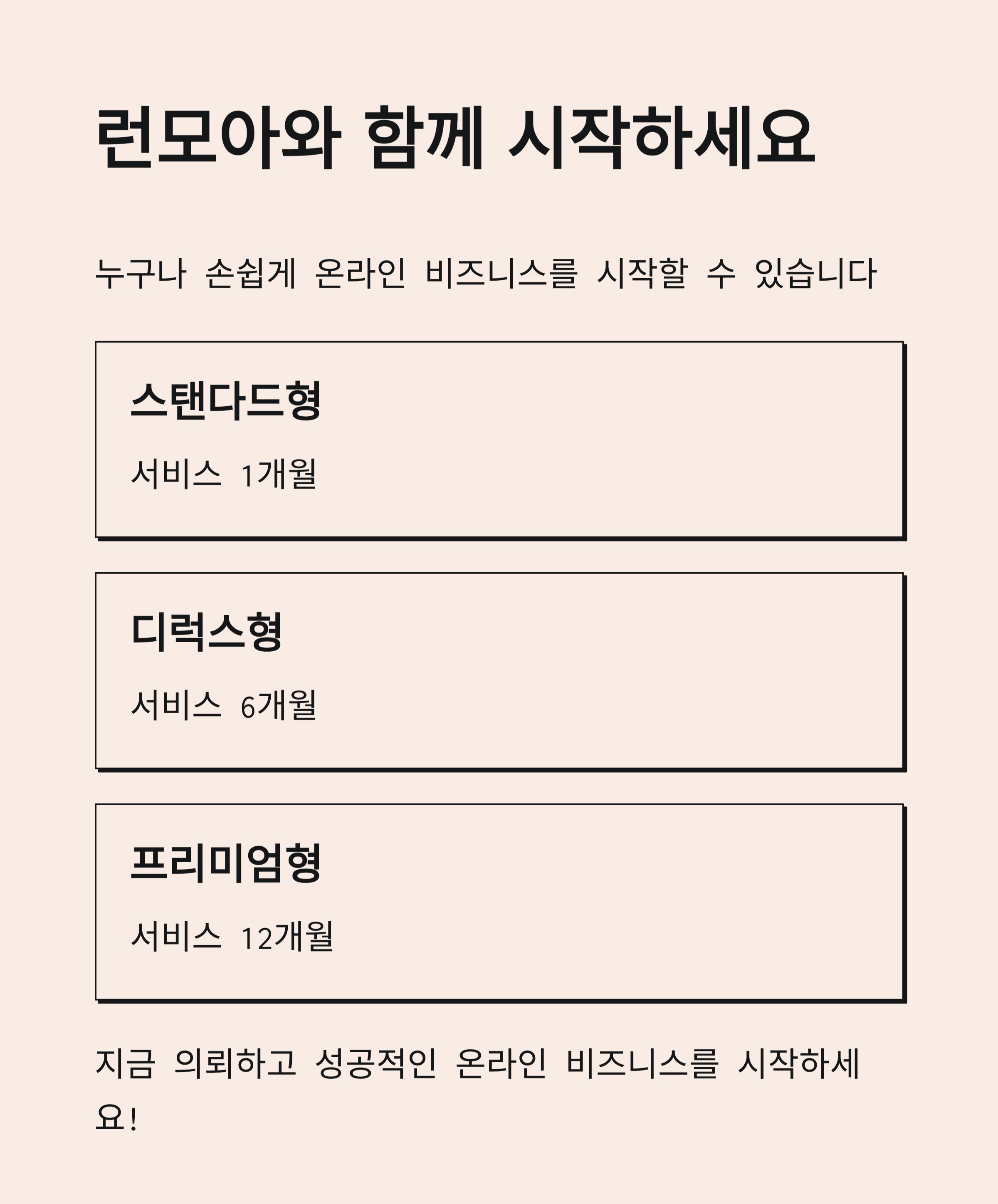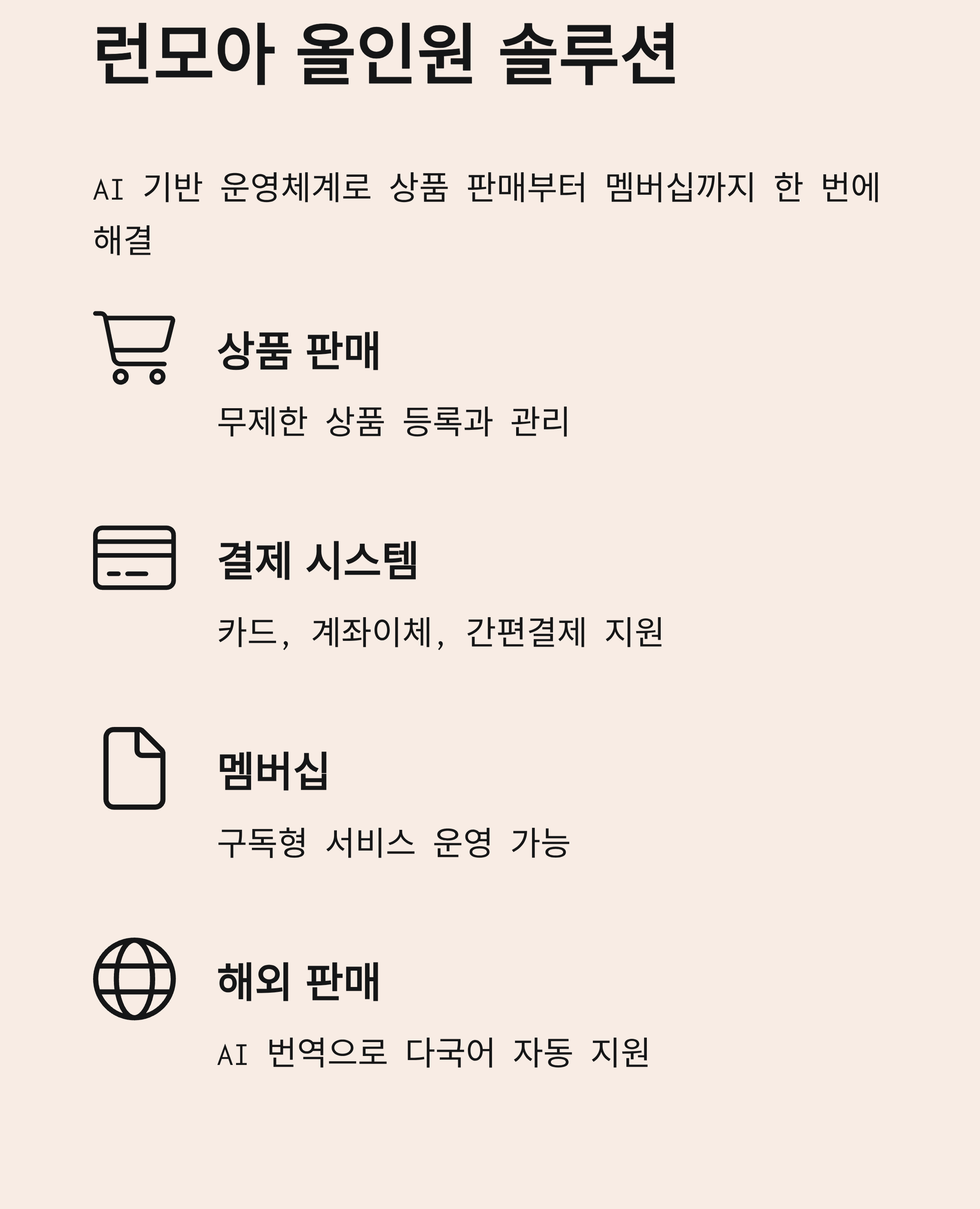 AI 운영체계 런모아로누구나 간단하고 빠르게 온라인 비즈니스를 시작하세요.[런모아의 핵심 장점]간편 시작 – 상품명·상호·도메인 입력만으로 자동 구축손쉬운 관리 – 등록·수정·삭제까지 클릭 몇 번이면 완료반응형 디자인 – PC·모바일·태블릿 최적화 지원결제 연동 – 카드·계좌이체·간편결제 모두 가능수수료 0% – 판매 수익 전액을 본인 계좌로 입금멤버십 운영 – 회원 전용 상품과 구독 서비스 제공Runpick 연계 – 리워드형 오픈마켓 자동 연결Runlink 제공 – 소셜 구독 및 멤버십 관리 툴 지원AI 번역 – 다국어 변환으로 해외 판매 확장SEO 자동화 – 검색 친화적 구조로 노출 강화콘텐츠 판매 – 디지털 자료·VOD 강의도 손쉽게 판매무제한 확장 – 상품 수·회원 수 제약 없는 자유 운영[추천 대상]- 오프라인 매장을 온라인으로 확장하려는 사장님- 초기 비용 부담 없이 온라인 창업을 원하는 자영업자- 플랫폼 수수료 없이 온전히 수익을 가져가고 싶은 판매자- 구독·멤버십으로 단골을 확보하고 싶은 크리에이터- 해외 시장 진출을 고민하는 온라인 쇼핑몰 운영자- 런모아는 상품 판매부터 멤버십, 라이브커머스, 콘텐츠 판매까지- 한 곳에서 해결 가능한 올인원 AI 쇼핑몰 솔루션입니다.----------------------------------------------------------예시)상세페이지 참고 1. 상담 및 요청 접수고객님의 요구사항과 목적을 파악하고, 참고할 레퍼런스나 디자인 자료를 전달받습니다.2. 시안 구성제공된 자료를 토대로 런모아를 활용하여 유사한 구조의 쇼핑몰을 초기 셋팅합니다.3. 결과 확인구축된 사이트를 고객님께 전달드리고, 직접 확인할 수 있도록 안내합니다.4. 피드백 반영확인 후 수정이나 보완이 필요한 부분을 요청해주시면, 반영하여 개선 작업을 진행합니다.5. 최종 완료 및 운영 지원최종 확정된 사이트를 기반으로, 고객님이 직접 상품 등록·수정·운영을 간편하게 할 수 있도록 지원해드립니다. 01. 상호명 / 브랜드명쇼핑몰에 표시될 이름02. 희망 도메인 주소예: www.mystore.com (없다면 추후 안내 가능)03. 원하는 디자인 레퍼런스 (선택)참고하고 싶은 쇼핑몰 링크나 이미지