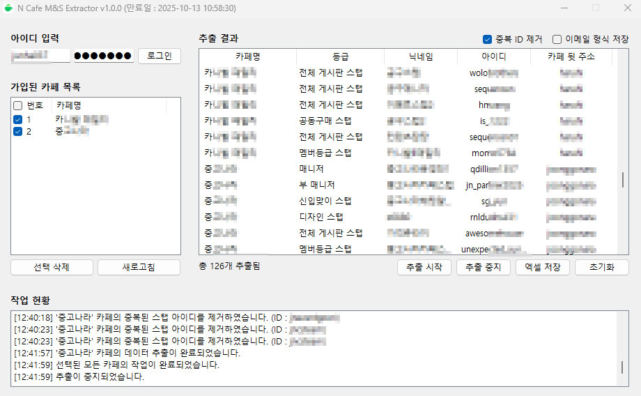 N사 매니저/스탭 DB 추출 프로그램가입된 카페 목록 중 특정 카페를 대상으로매니저 및 스탭 정보를 실시간으로 수집하는 프로그램입니다.카페 회원 중 운영진 등급에 해당하는 정보만 추출하며,닉네임 / 아이디 / 등급 등 주요 정보를 원클릭으로 확보할 수 있습니다.여러 권한을 동시에 보유한 운영진의 경우,중복 ID 제거 옵션으로 정확한 데이터 추출이 가능합니다.수집된 정보는 항목별로 자동 분류되며,필요한 정보만 빠르게 추출할 수 있는 최적화된 운영진 분석 전용 프로그램입니다.이런 분들께 추천합니다!- 관심 있는 카페의 매니저 및 스탭 정보를 실시간으로 확인하고 싶으신 분!- 카페 활동 현황과 운영진 구성을 빠르게 파악하고 싶으신 분!- 카페 운영진 정보를 수집해 직접 소통을 시도하고 싶으신 분!추출 항목카페명 / 등급 / 닉네임 / 아이디 / 카페 주소추출 옵션- 중복 ID 제거프로그램 사용법1. N사 계정 로그인2. 가입된 카페 목록에서 원하는 카페 선택3. 추출 옵션 선택4. 추출 시작5. 작업 완료 후, 엑셀 저장 클릭으로 결과 확인유의사항- 스탭으로 임명된 경우에만 추출되며, 커스텀 권한 등 추가 권한을 가진 스탭은 제외됩니다.※ 프로그램 업데이트는 지속적으로 제공됩니다. 1. 원하는 상품을 고른 뒤, "문의하기"를 눌러 상담을 진행해 주세요.2. 결제 완료 시 설치 파일(이용권 코드 포함)을 제공해드립니다.3. 원격 지원이 필요하시면 도와드립니다. - 프로그램은 윈도우 10 또는 11에서만 사용 가능합니다. (Mac 사용 불가)- 크롬 최신버전 설치해 주세요. (N사 로그인 시 필요)- 원격 지원이 필요하신 경우, Anydesk를 미리 설치해 주세요.- 최신 PC에서 실행하실 것을 권장합니다.